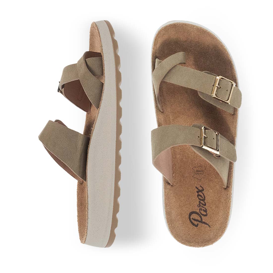 Άνετα σανδάλια Parex με εξαιρετικά μαλακό εσωτερικό πάτο, suede υφής. Διαθέτουν δίχαλο και λουράκια αγκράφα. Αυτά τα γυναικεία διαχρονικά σανδάλια δεν θα θέλετε να τα αποχωριστείτε και θα αναβαθμίσουν κάθε σας καλοκαιρινό outfit.