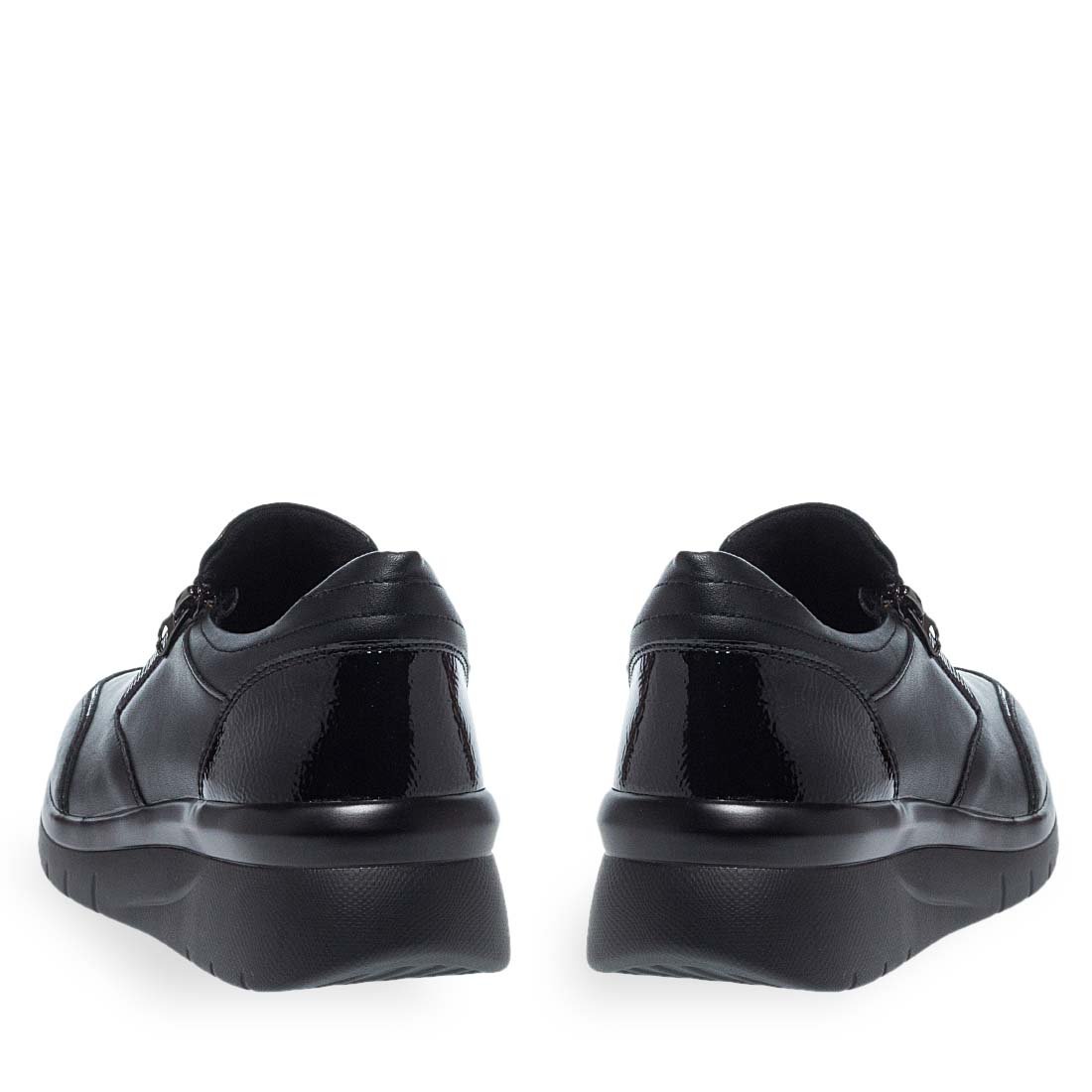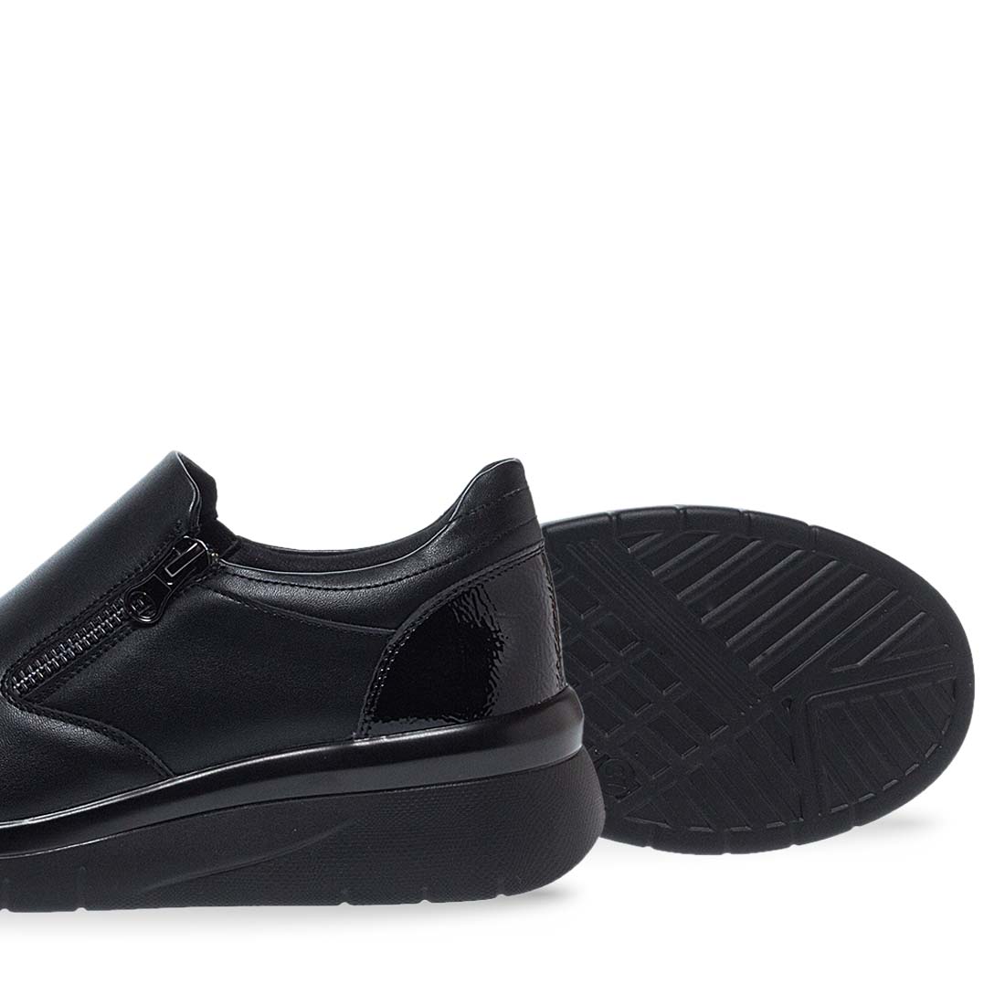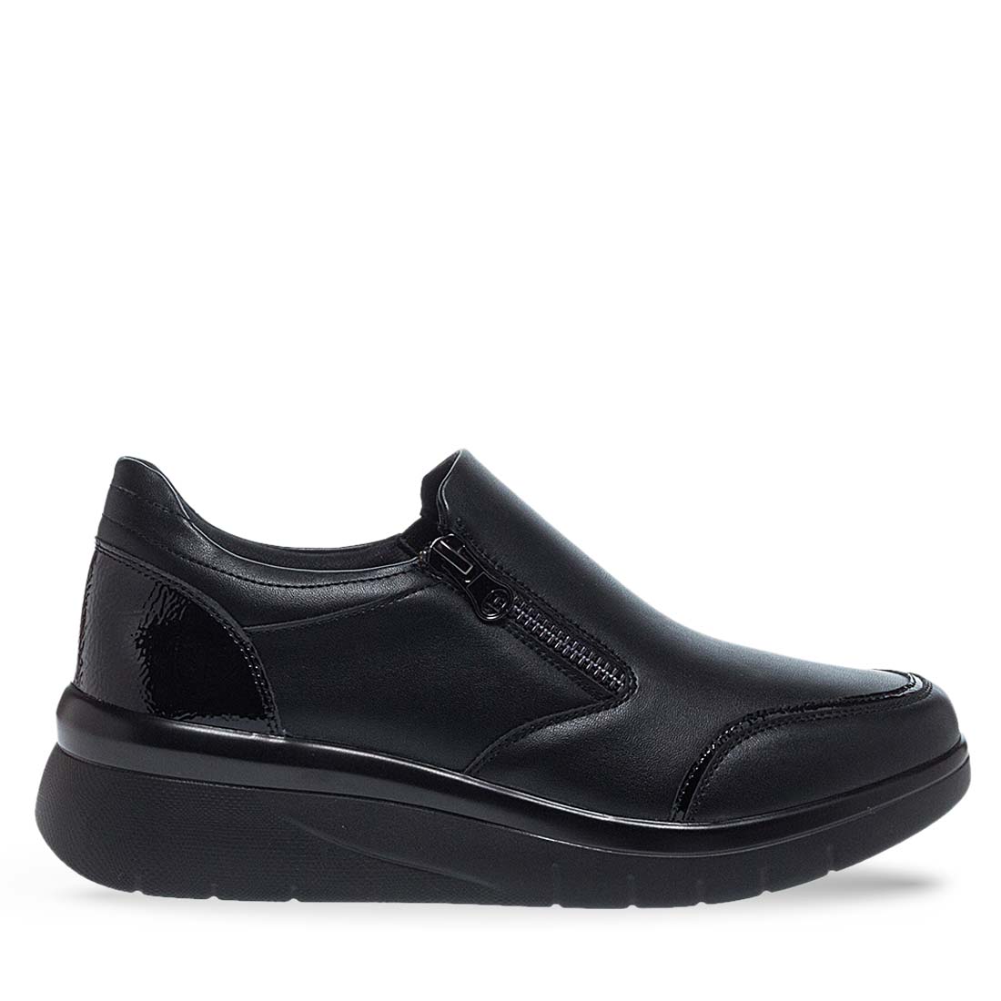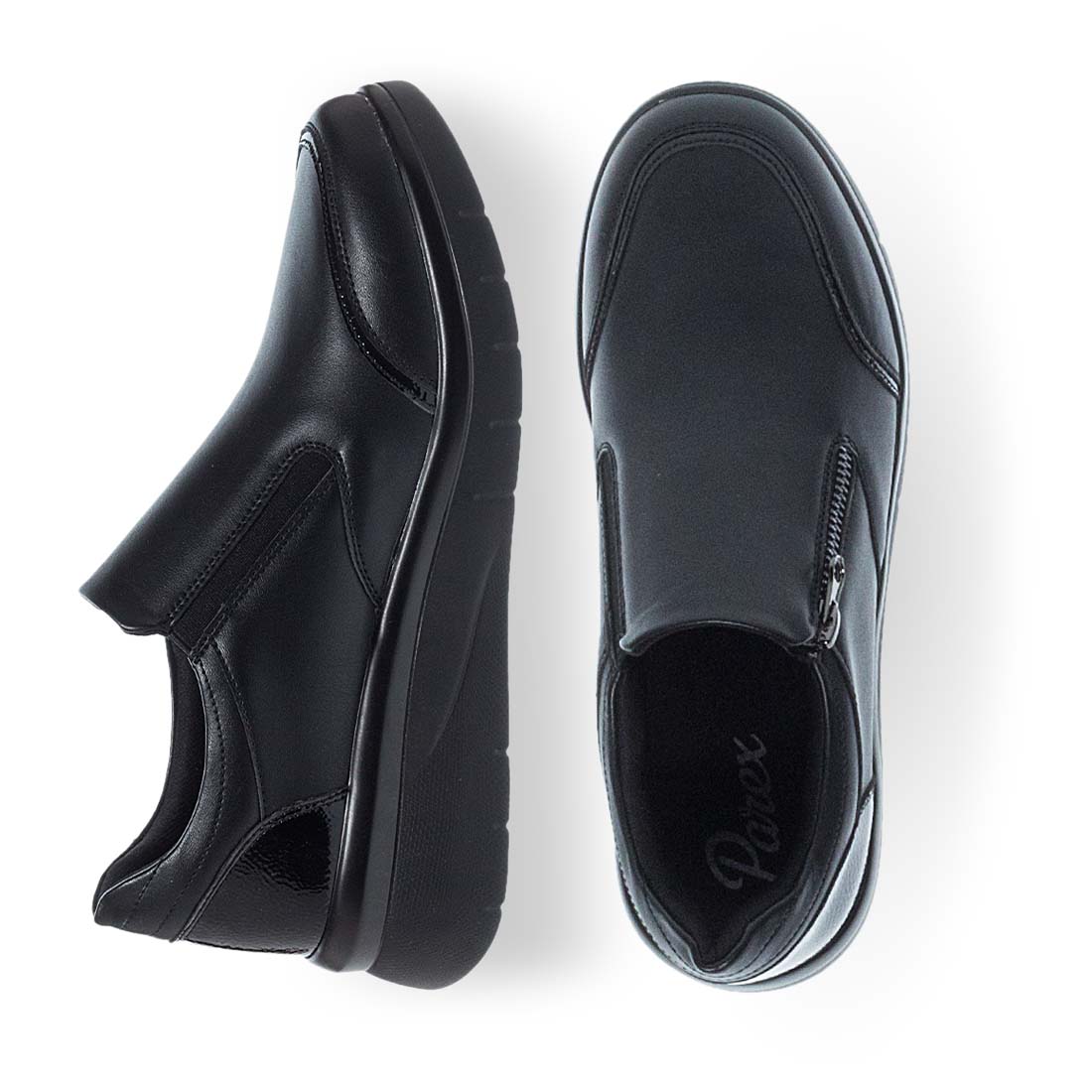 Μαύρα γυναικεία slip on Parex. Διαθέτουν λάστιχα για πλαινά για εύκολη εφαρμογή σε κάθε τύπο ποδιού αλλά και λειτουργικό φερμουάρ. Μαλακό αναπαυτικό πέλμα και ανθεκτική σόλα με τακούνι πλατφόρμα. Ιδανικά slip on για να φορεθούν σε κάθε στιγμή της ημέρας.