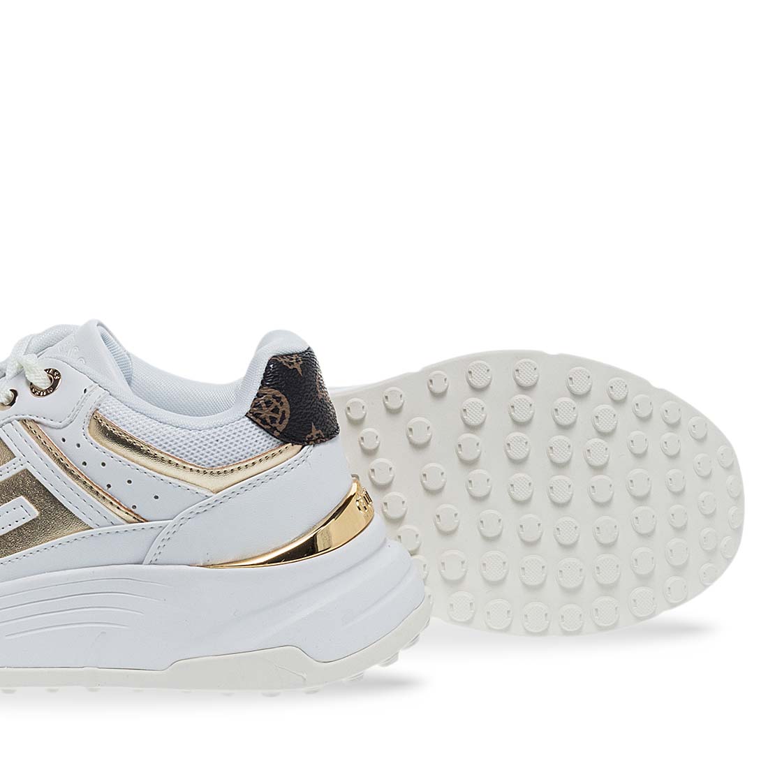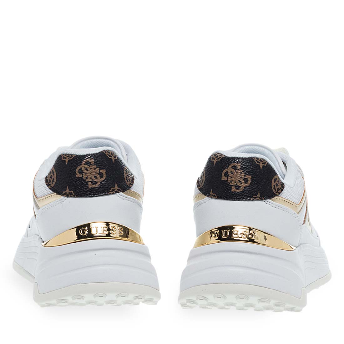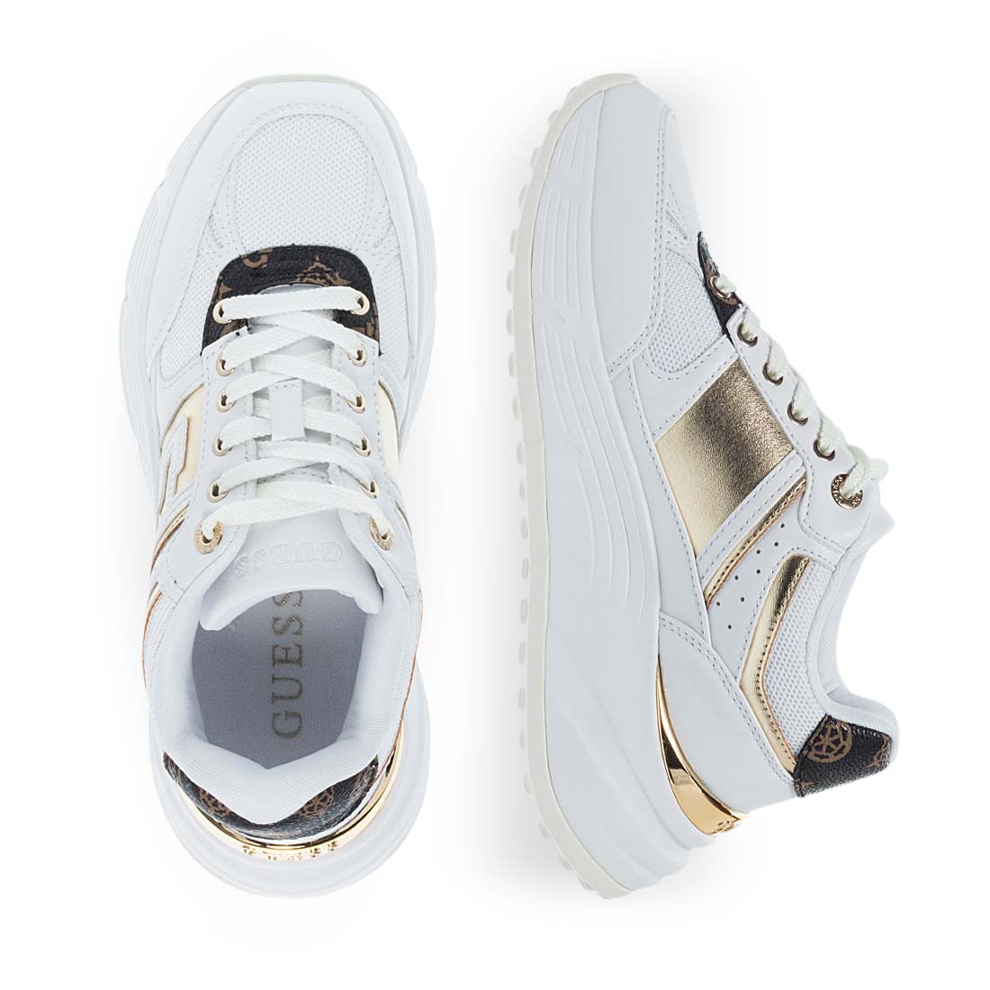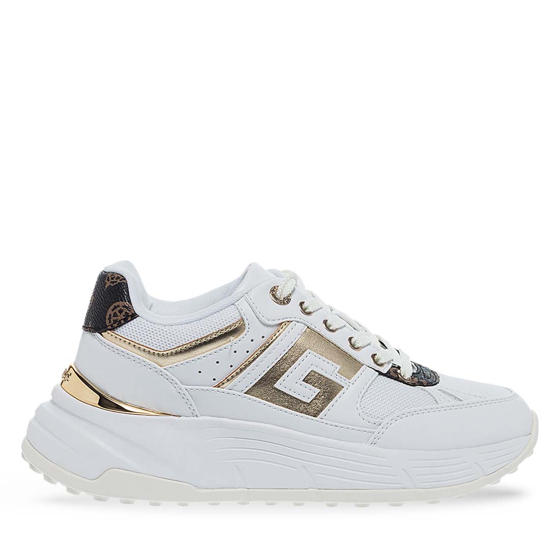 Γυναικεία sneaker από το brand Guess. Γυναικεία sneakers Guess από συνθετικό δέρμα σε λευκό με χρυσές λεπτομέρειες. Trendy στυλ που ολοκληρώνει κάθε casual εμφάνιση.