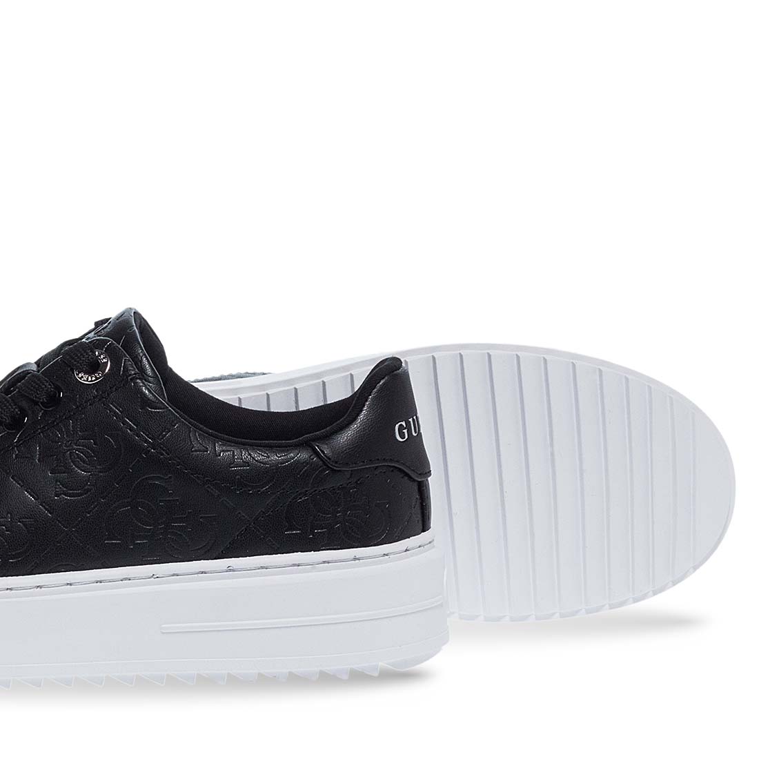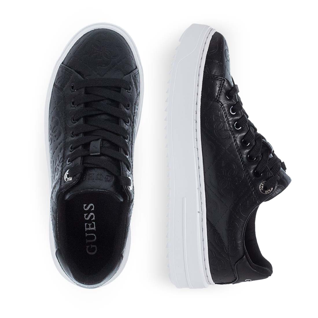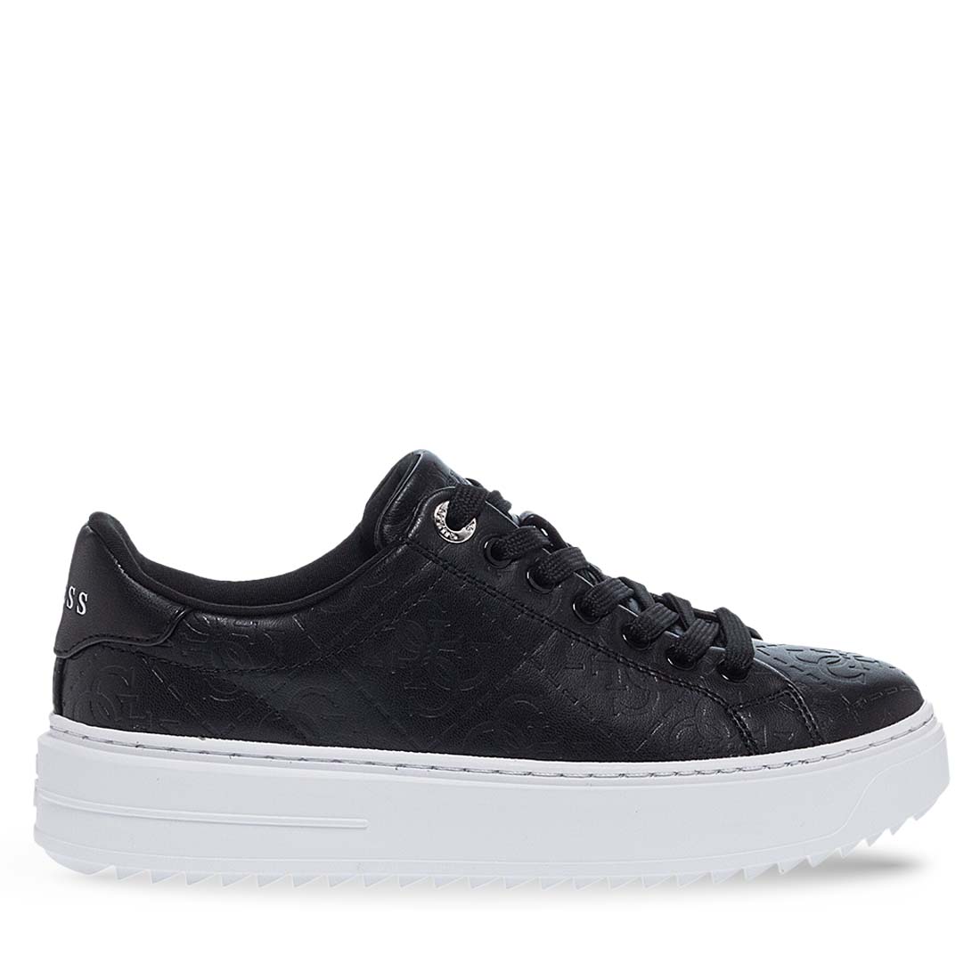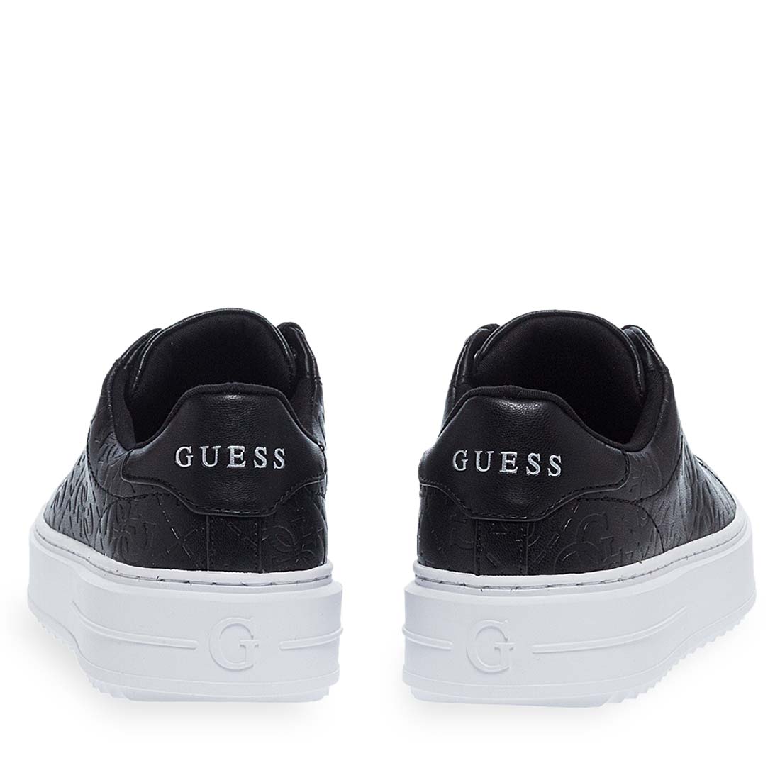 Γυναικεία Guess sneakers σε μαύρο χρώμα. Με λευκή λαστιχένια σόλα και λογότυπο στο πίσω μέρος. Δένουν με κορδόνια για εύκολη εφαρμογή. Συνθετικό δέρμα εξαιρετικής ποιότητας. Επώνυμα sneakers με εξαιρετικά μαλακό πέλμα και ανθεκτική φλατ αντιολισθητική σόλα. Μια τέλεια επιλογή για τη καθημερινότητά σας.