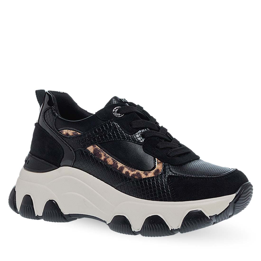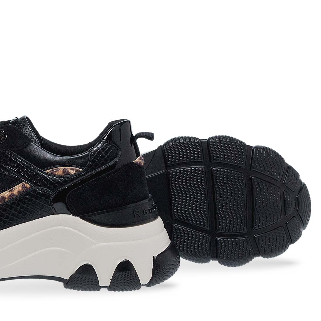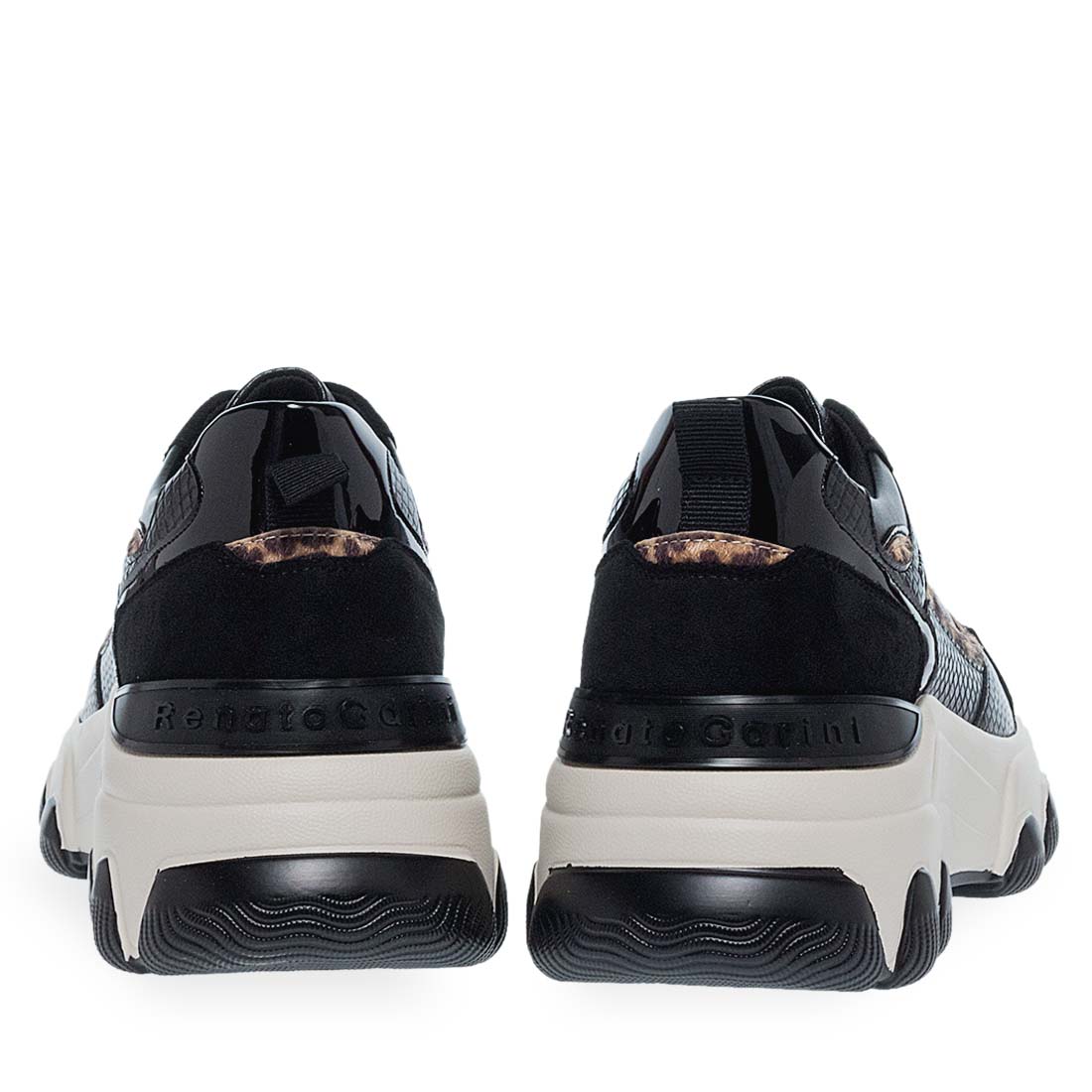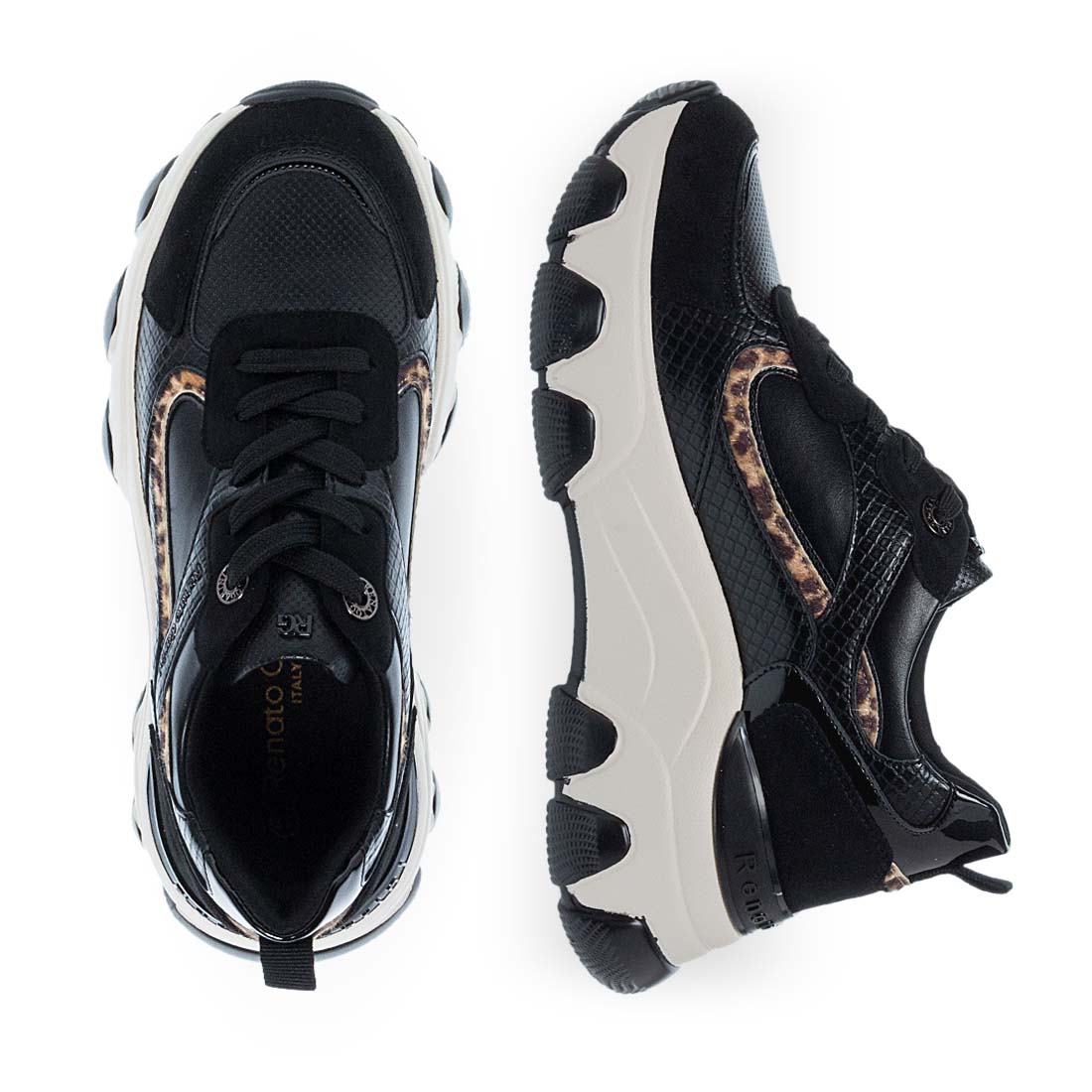 Γυναικεία sneaker από το brand Renato Garini. Μαύρα sneakers με leopard λεπτομέρειες και ανάγλυφη σόλα. Fashion-forward επιλογή για statement εμφανίσεις.