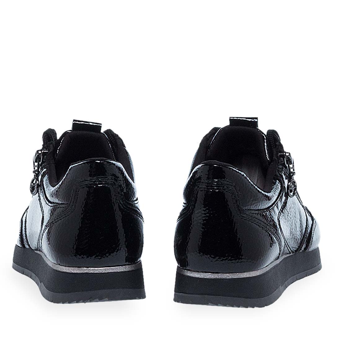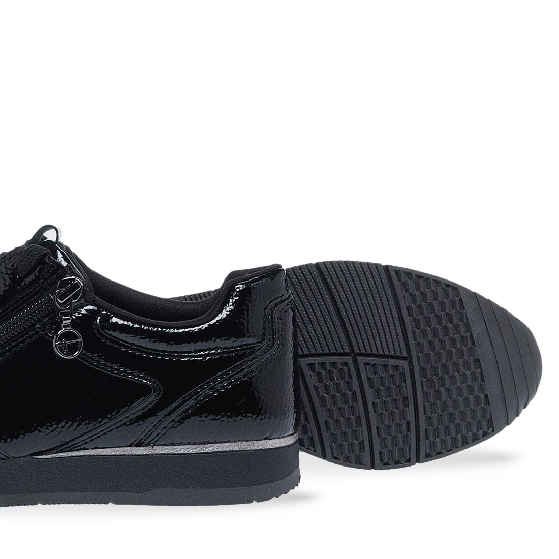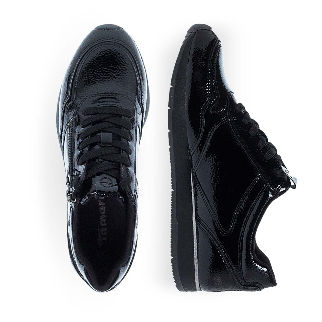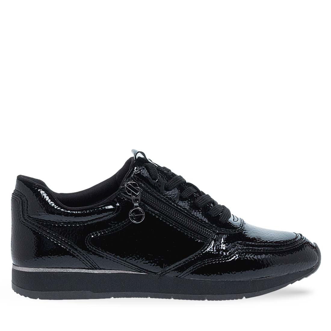 Γυναικεία sneaker από το brand Tamaris. Γυναικεία μαύρα λουστρίνι sneakers με πλατφόρμα και φερμουάρ. Μια στυλάτη και δυναμική επιλογή.