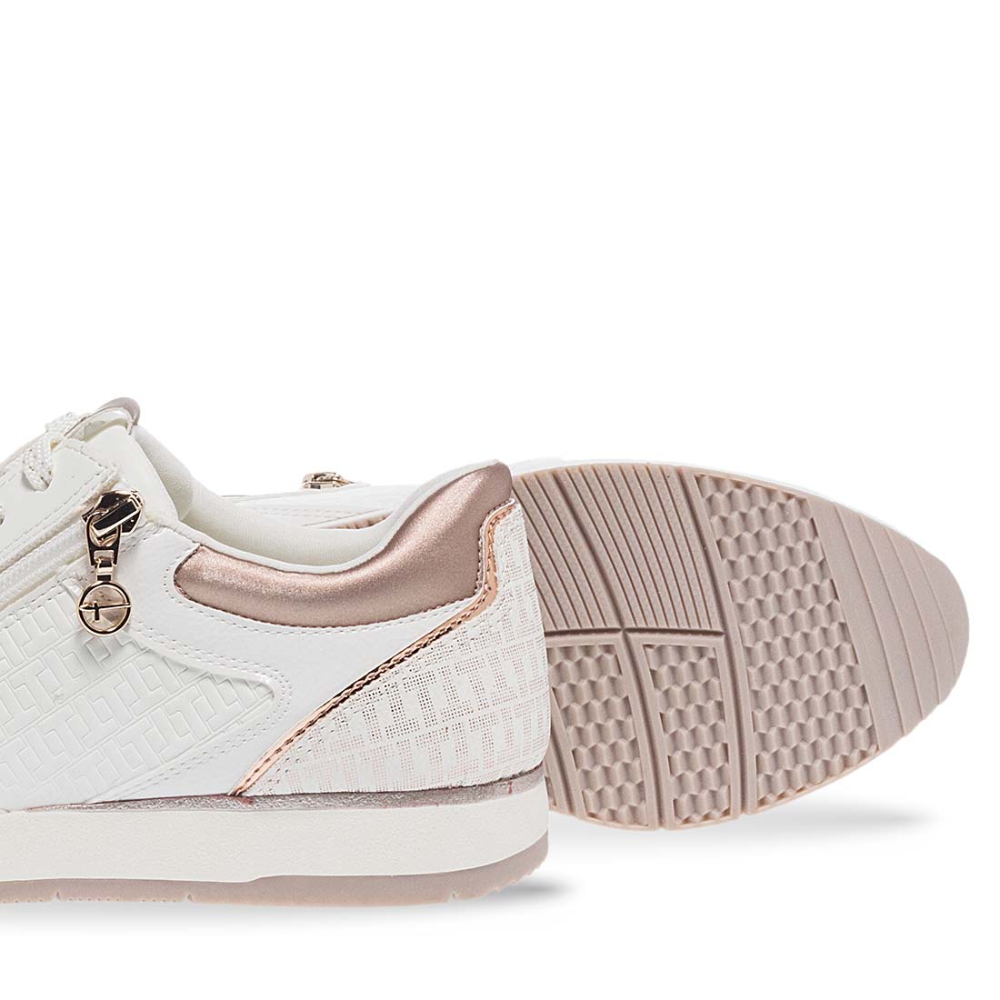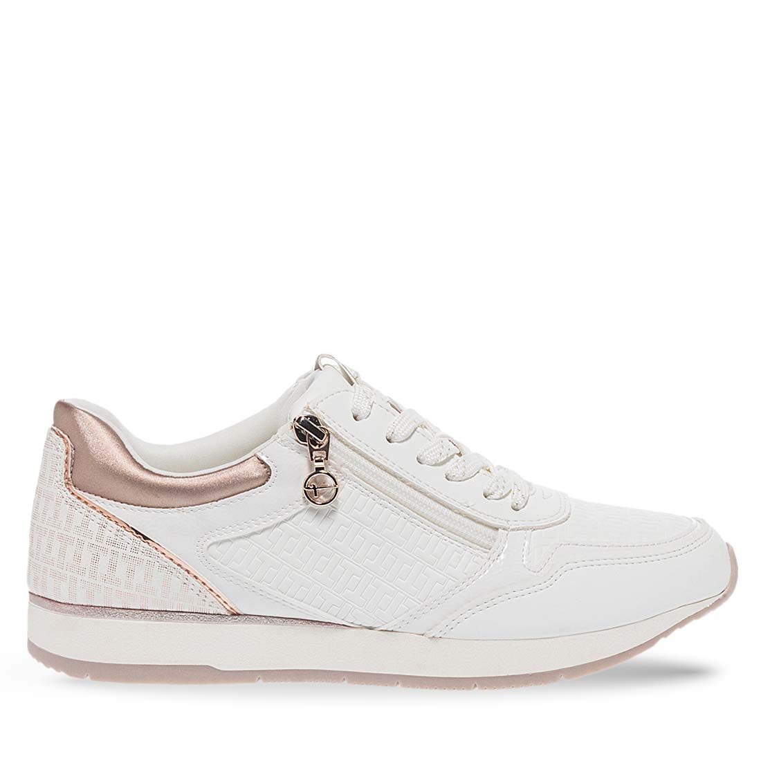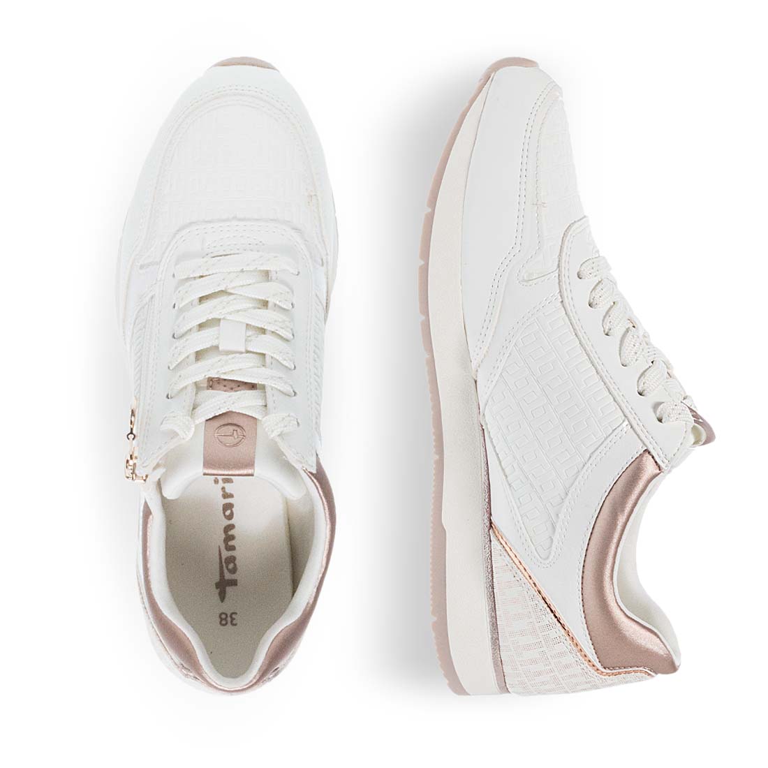Λευκά sneaker της εταιρείας Tamaris για άνετα και μοντέρνα βήματα. Κλείσιμο με κορδόνια. Μοντέρνος συνδυασμός υλικών και χρωμάτων. Ξεχωρίζουν για την σταθερή σόλα και το φερμουάρ στο πλάι. Αναπαυτικό πέλμα για ξεκούραστα βήματα και υφασμάτινη εσωτερική επένδυση .