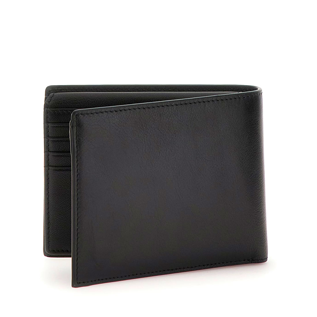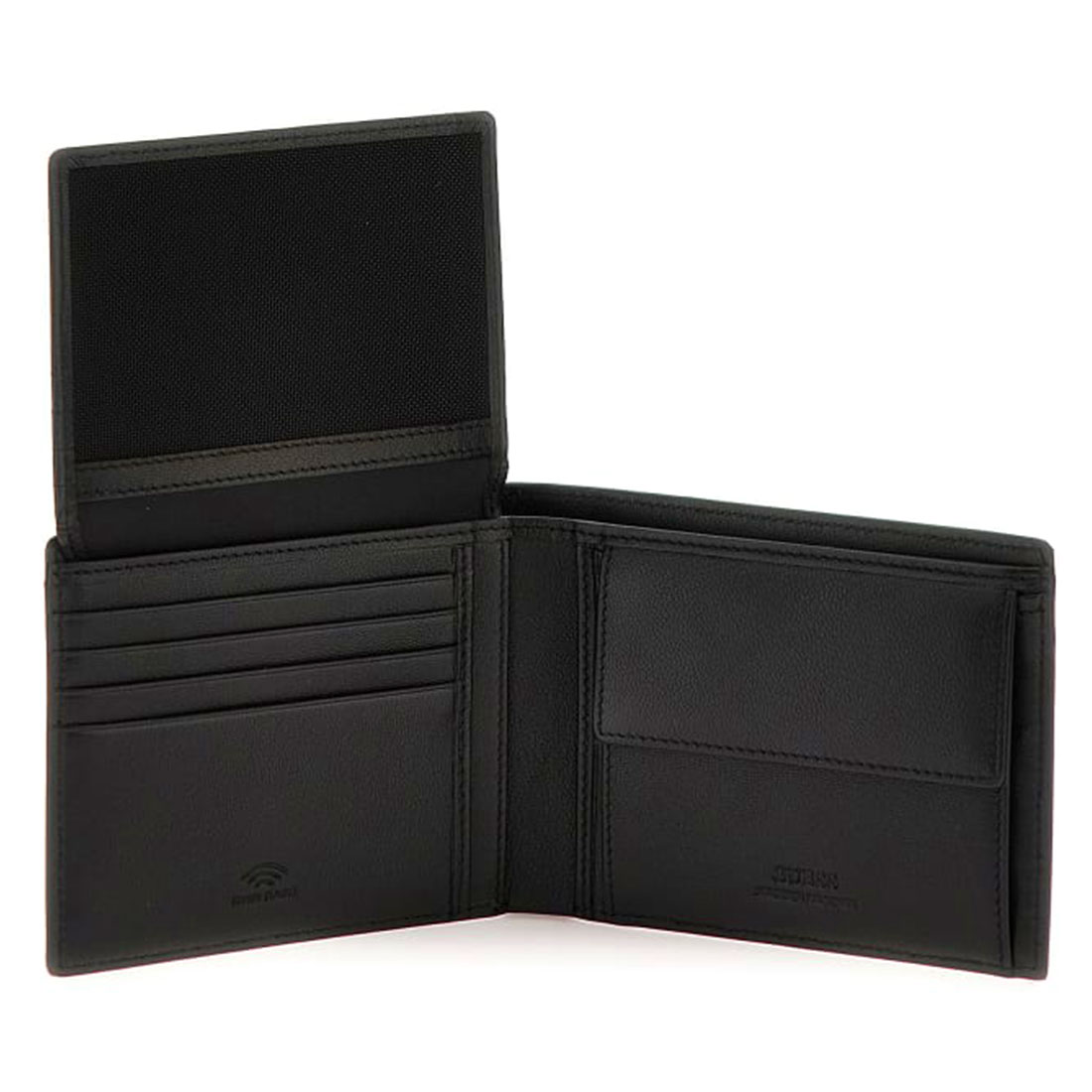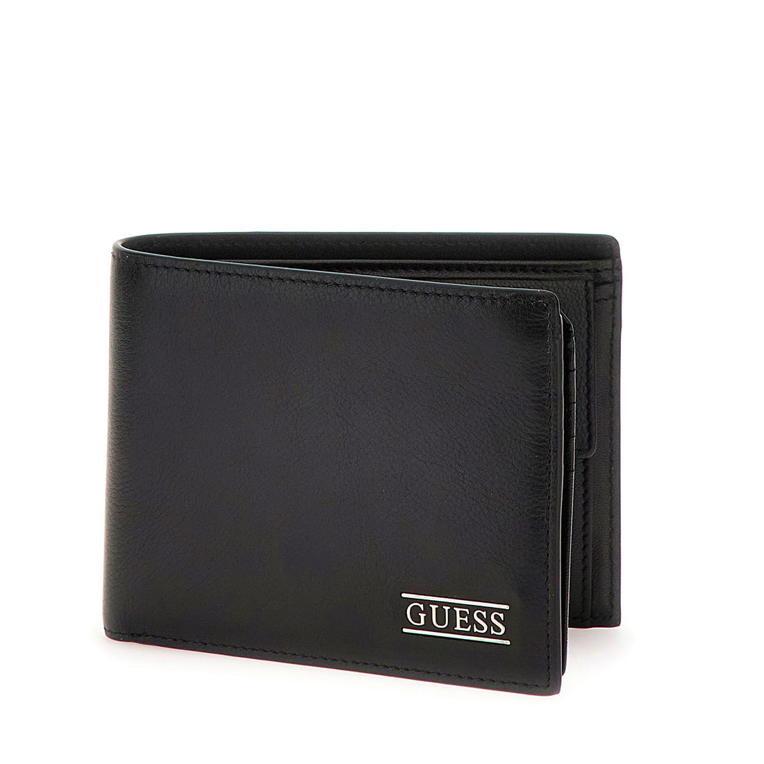 Monochome leather wallet for men by new Guess collection. Available in black color. Letters with the logo on the front. Pockets for your cards and a coin holder with metal clasp closure. 4X5X1.