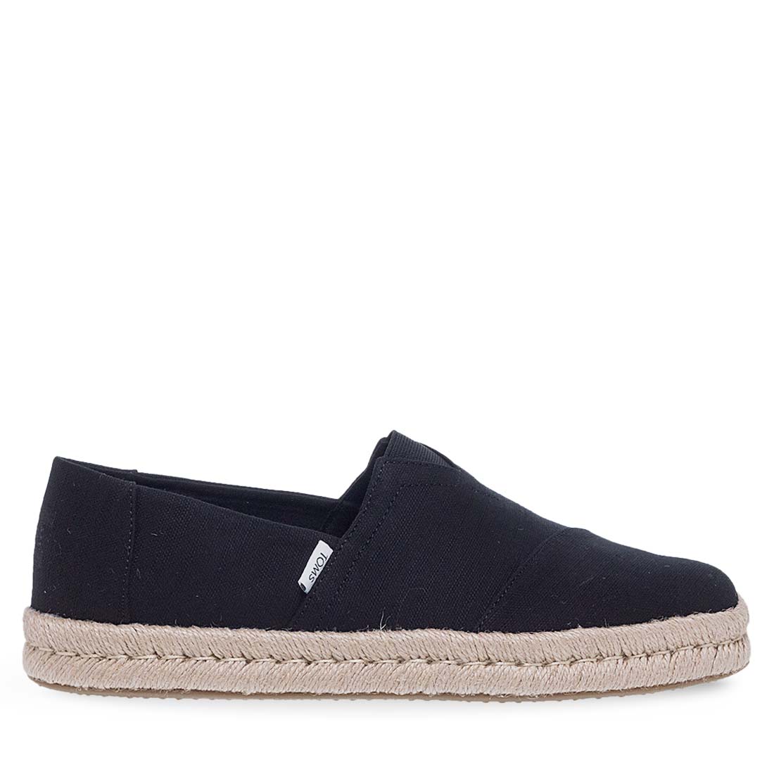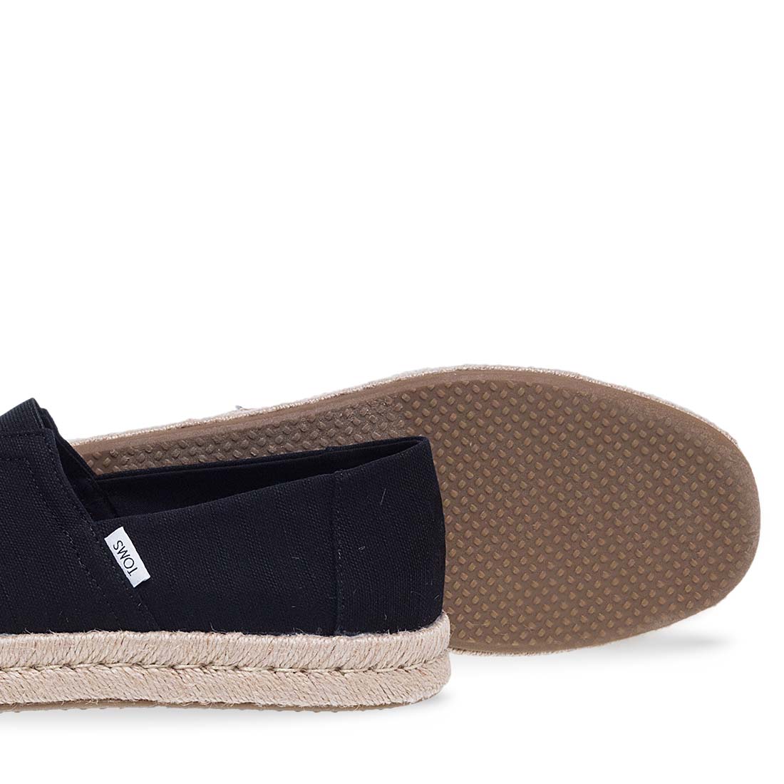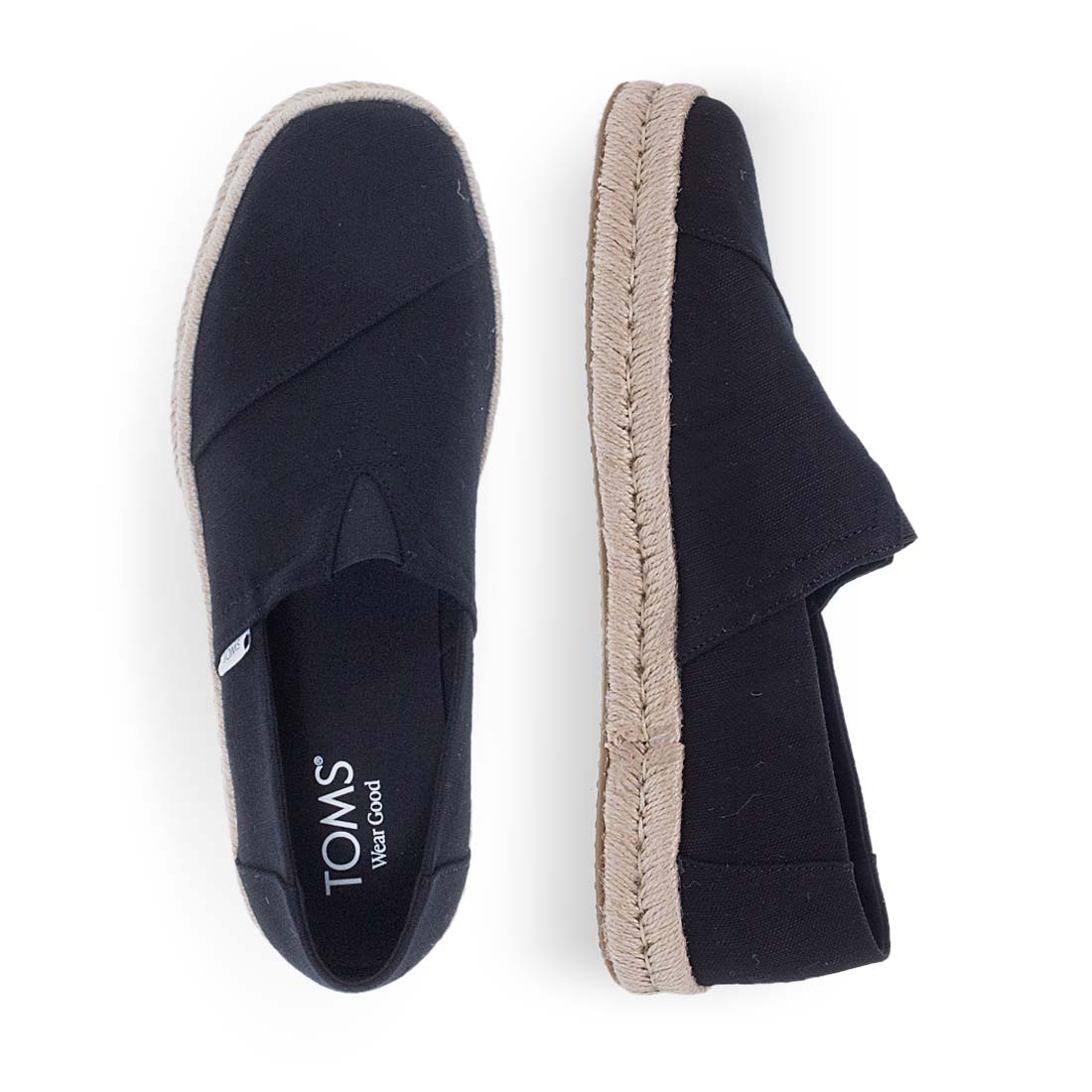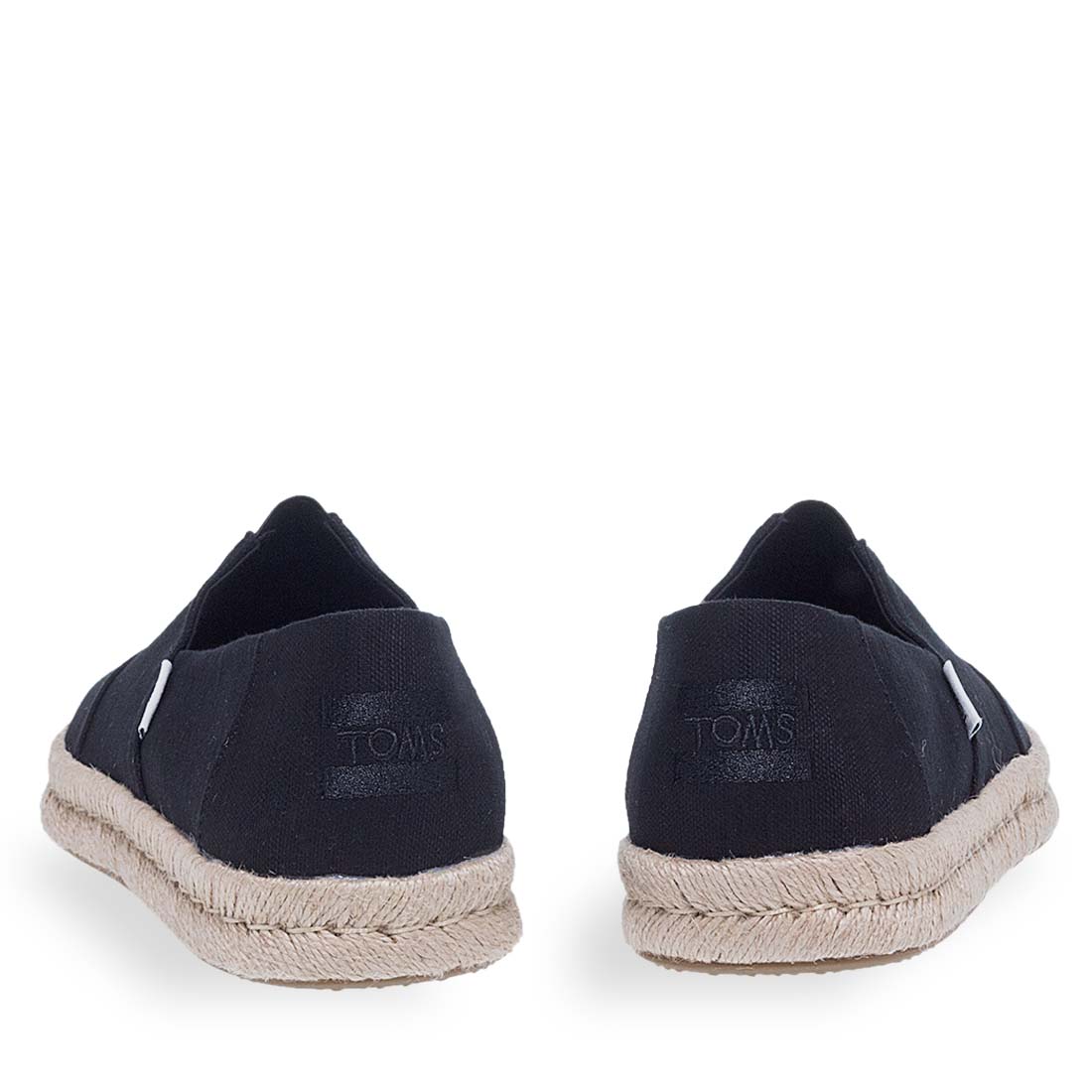 Modern espadrillies by Toms. Rounded toe.Classic Alpargata style. Ortholite sole. Jute details. Ideal to use day to night. Available in black color.