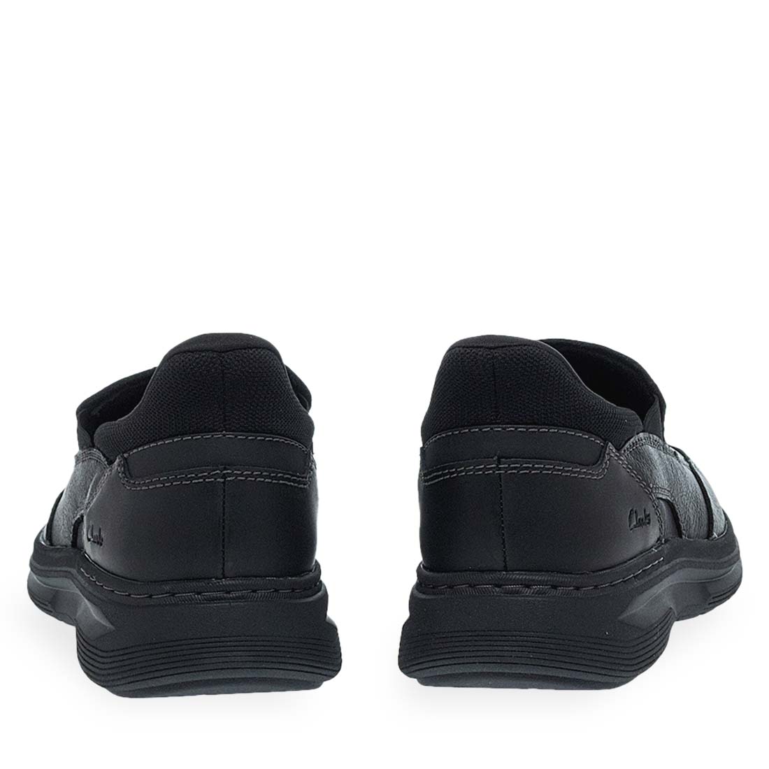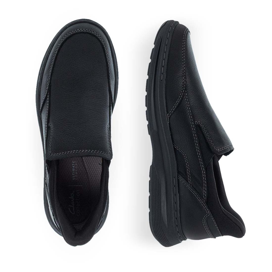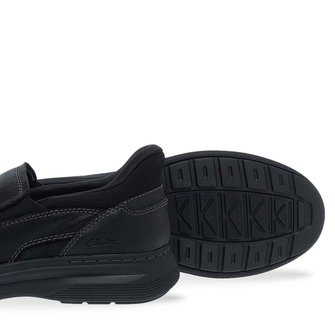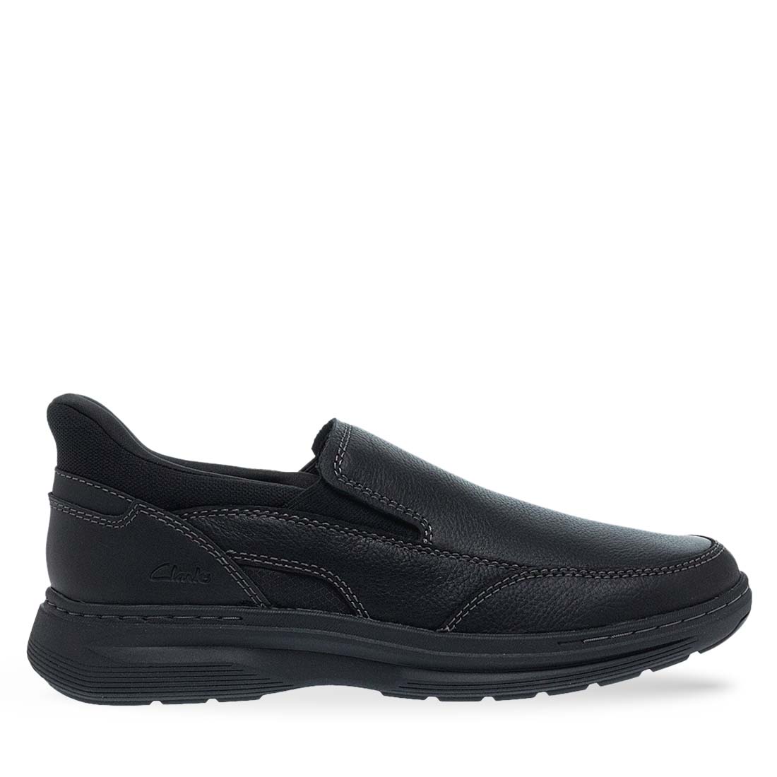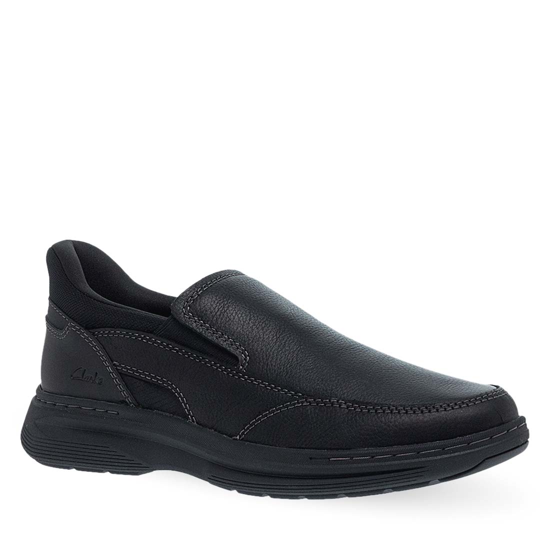 Men''s leather slip on shoes by Clarks. Men’s Clarks black leather slip-on shoes offering effortless wear and comfortable support. Ideal for everyday use and smart business looks.