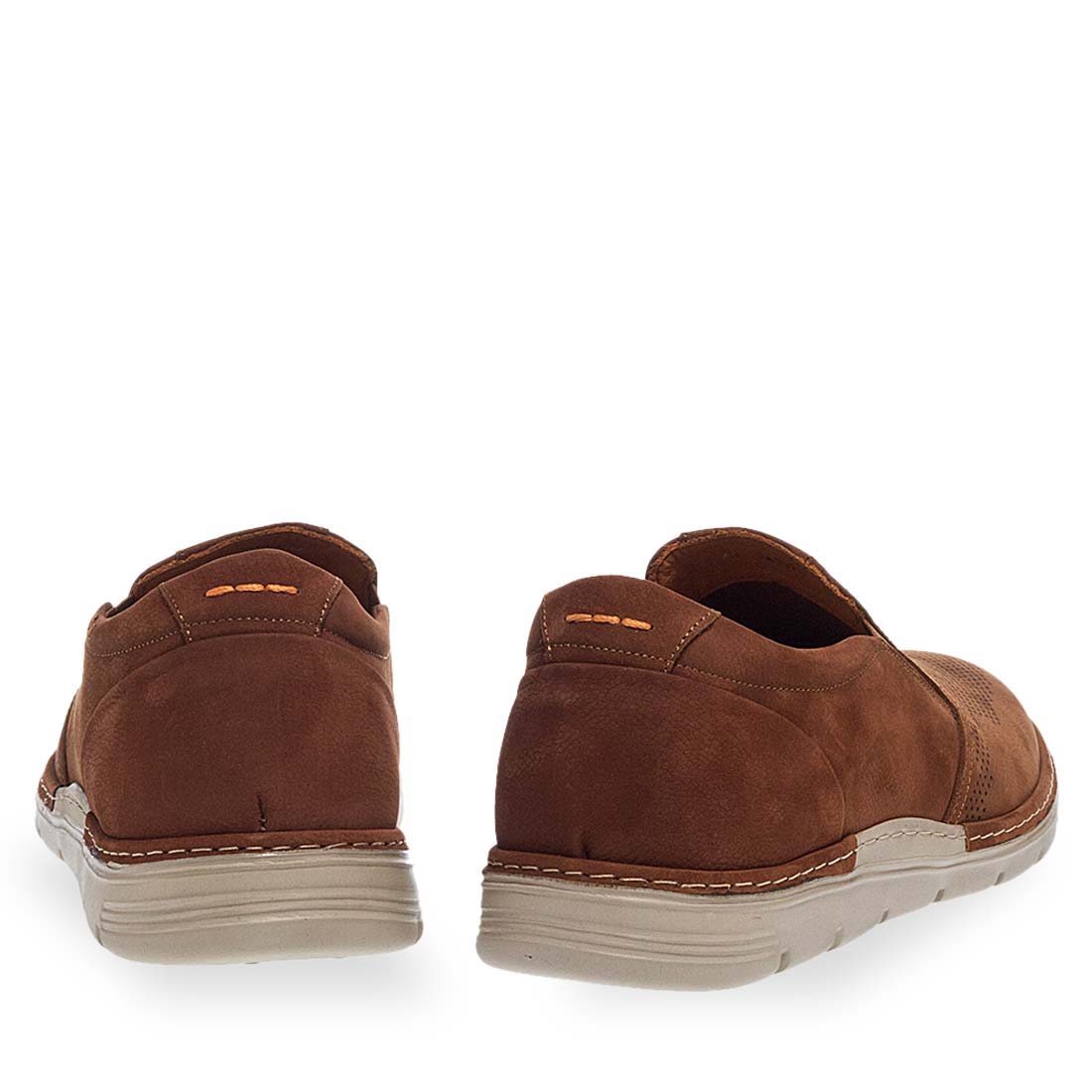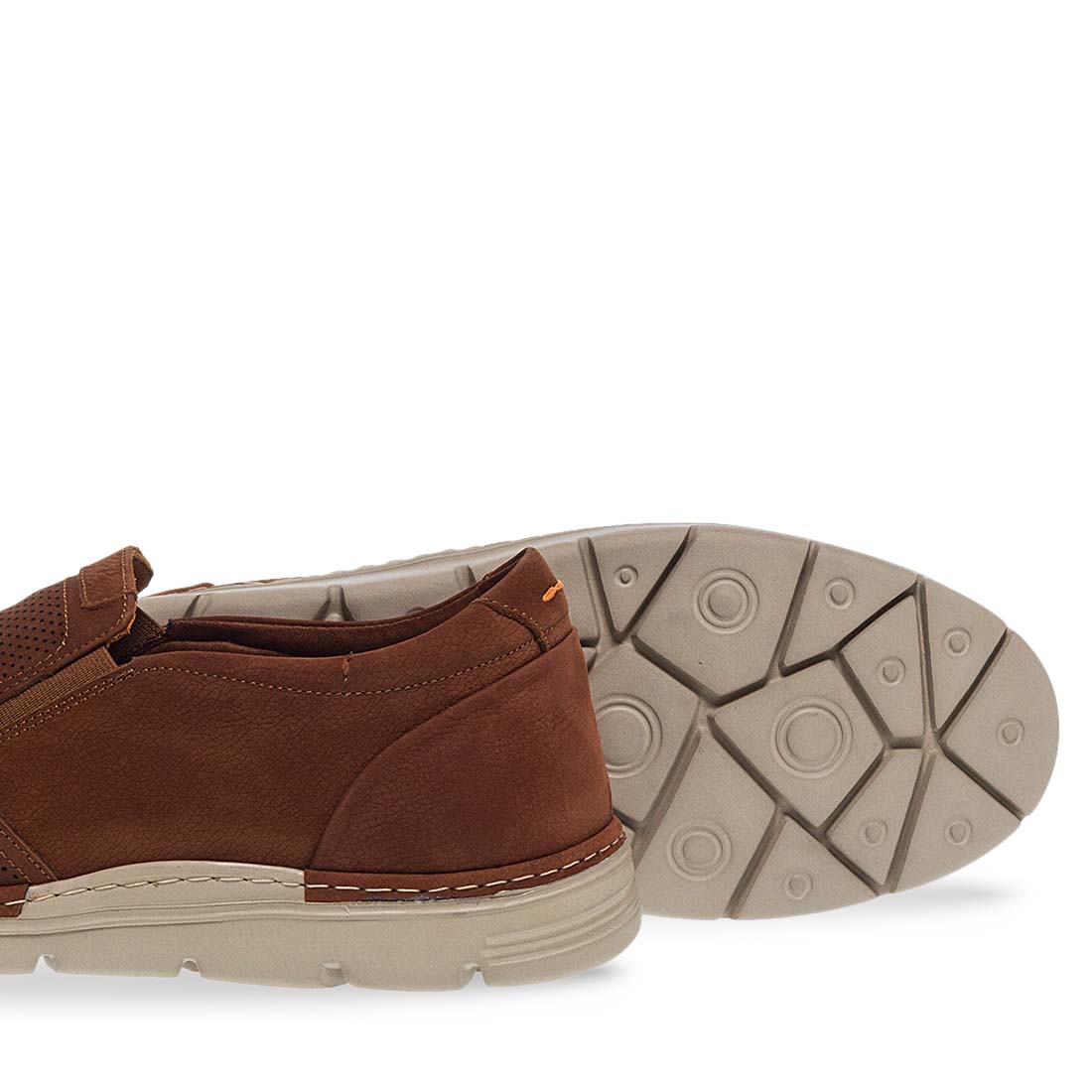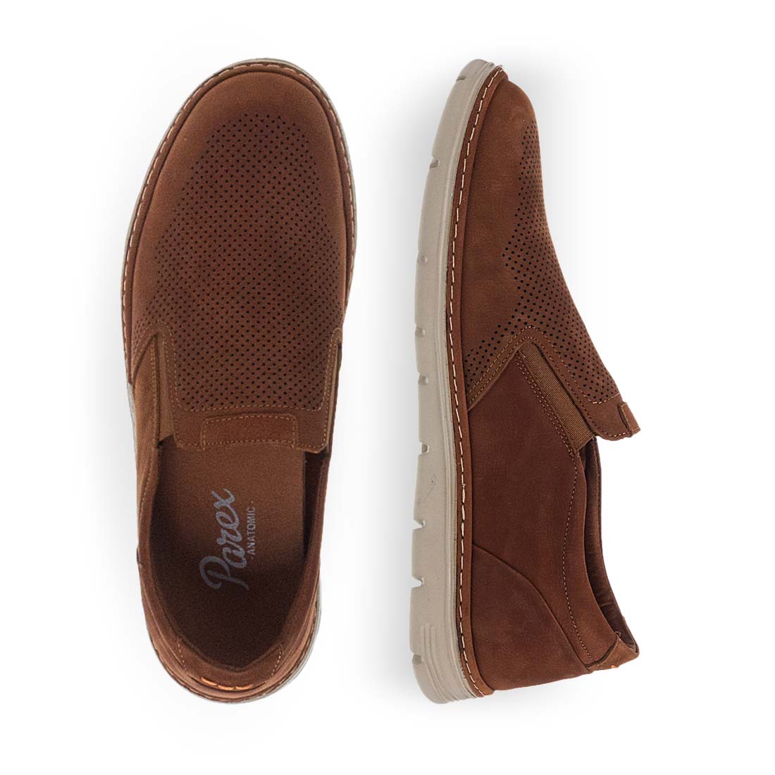 Leather slip on for men by Parex. Elasticated panel in the front for easy fit on any type of foot. Available in beige and tan color. With a durable sole and a soft footbed.
