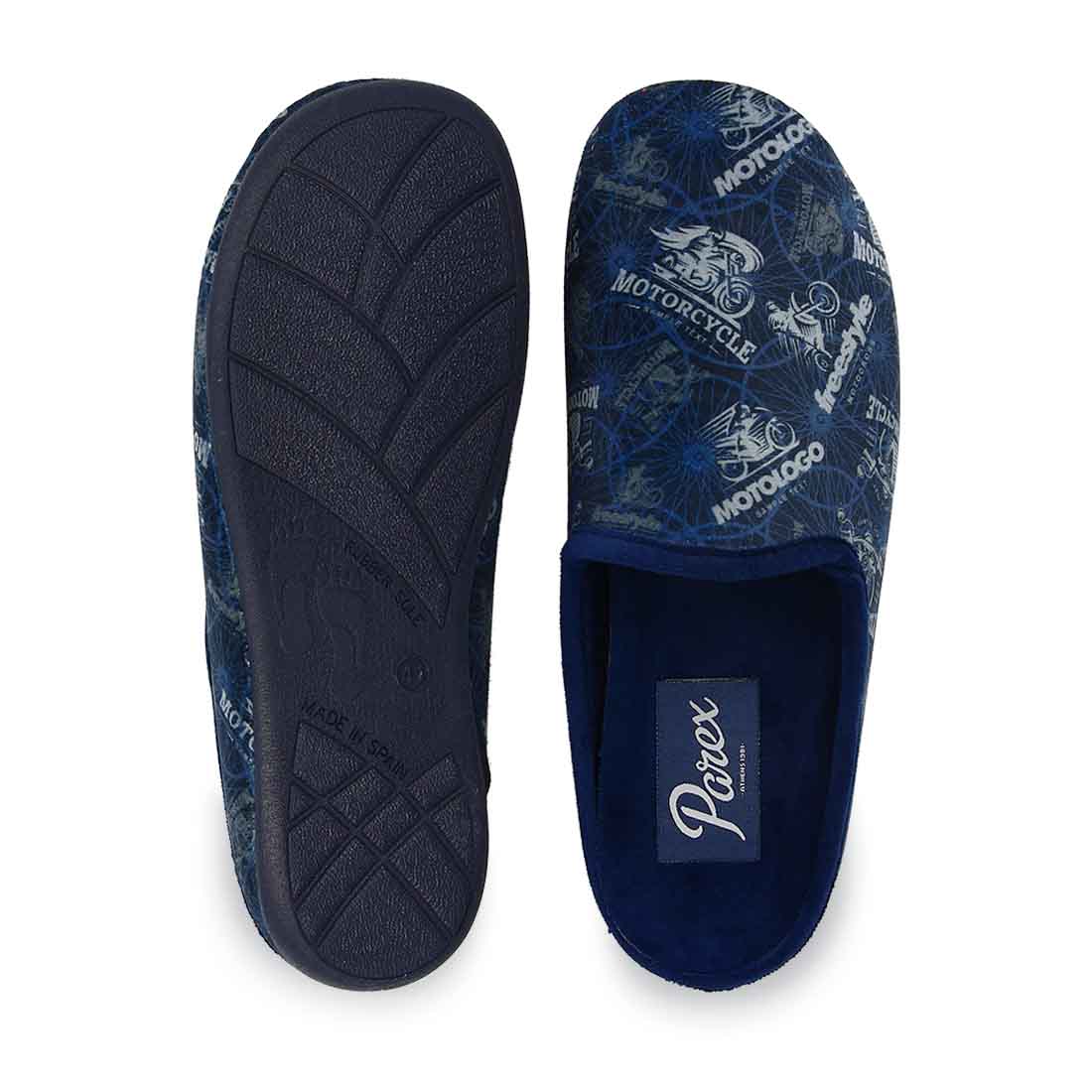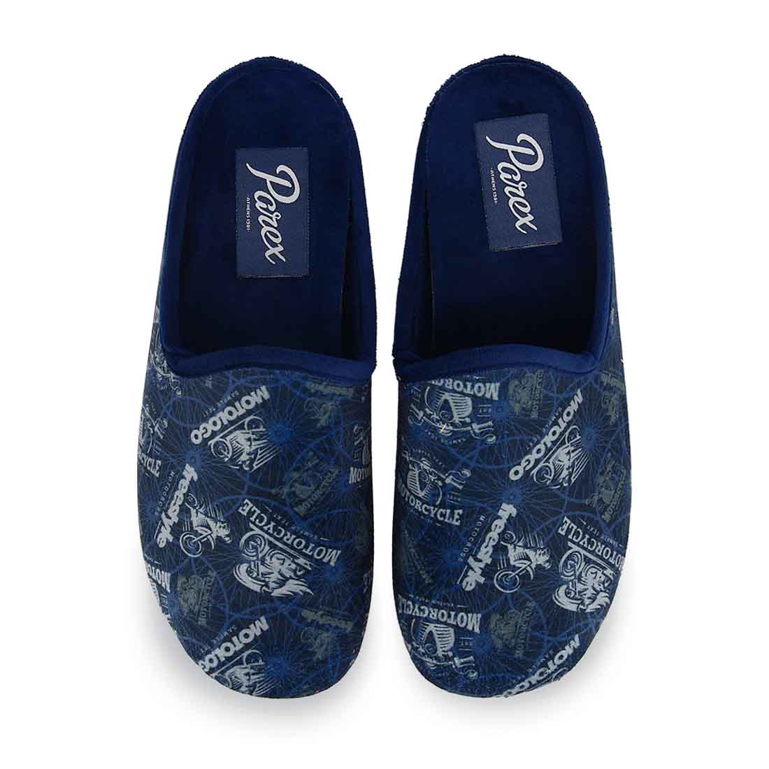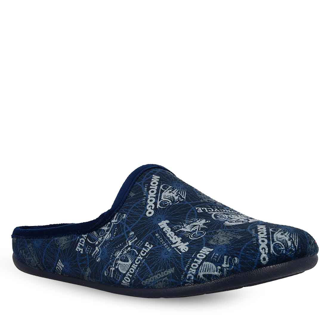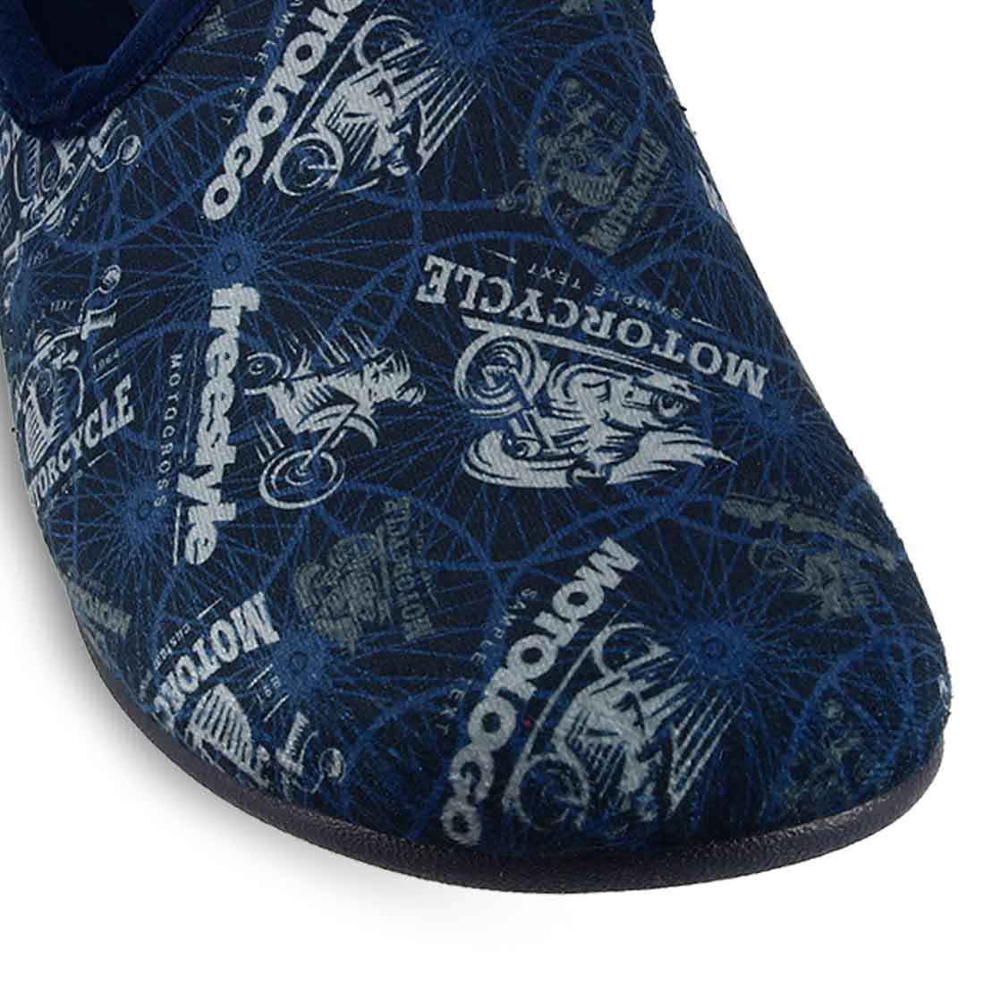 Non slip house slippers with moto logos prints. Royal blue pair designed from velvet fabric.