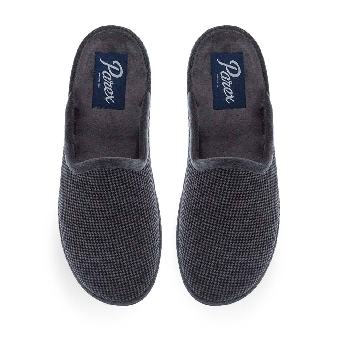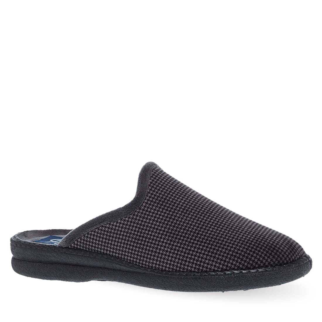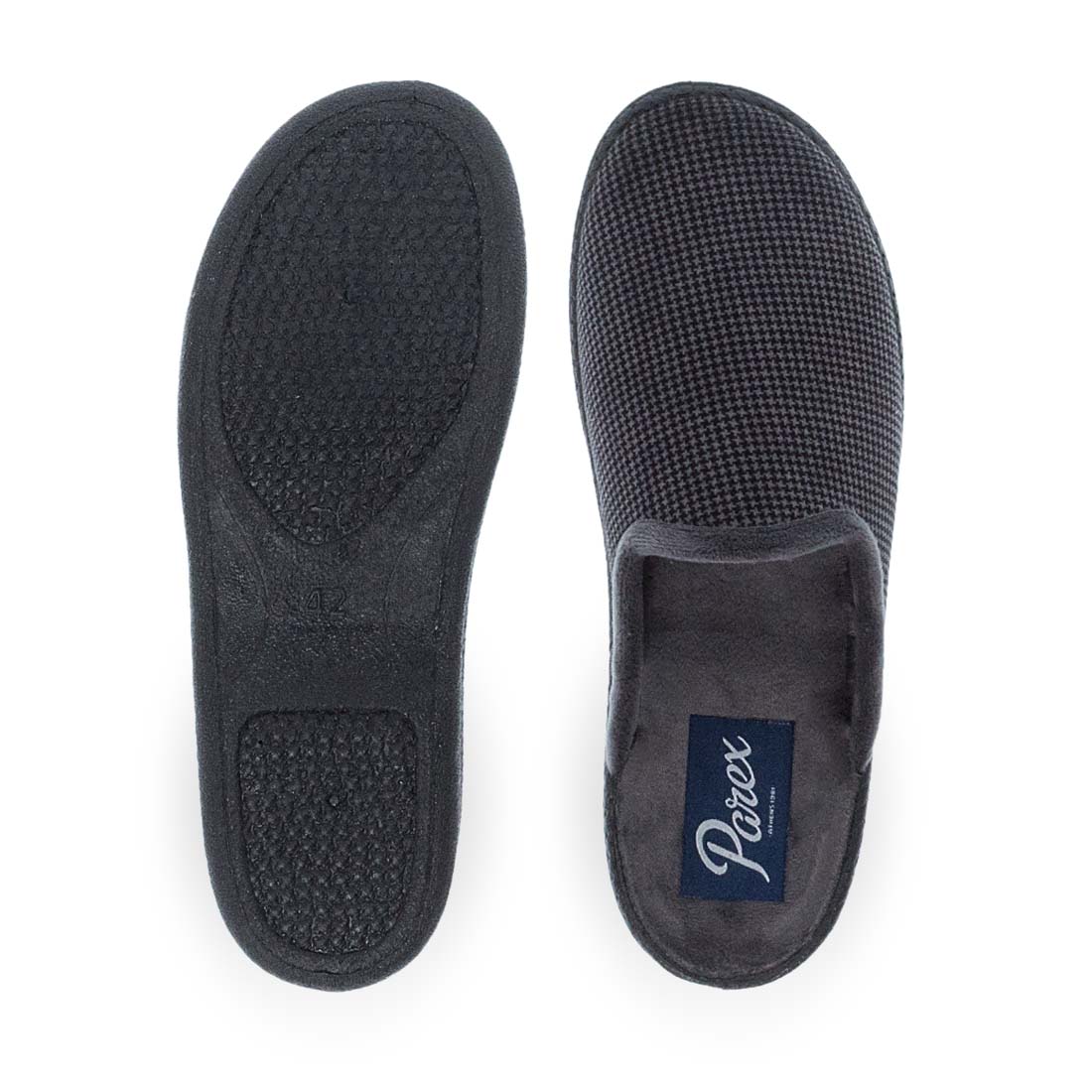 Monochorme house slippers by Parex. Comfortable design with rubber sole for comfort and stability all day. Easy to wear and relaxed fit. Available in blue and gray color.