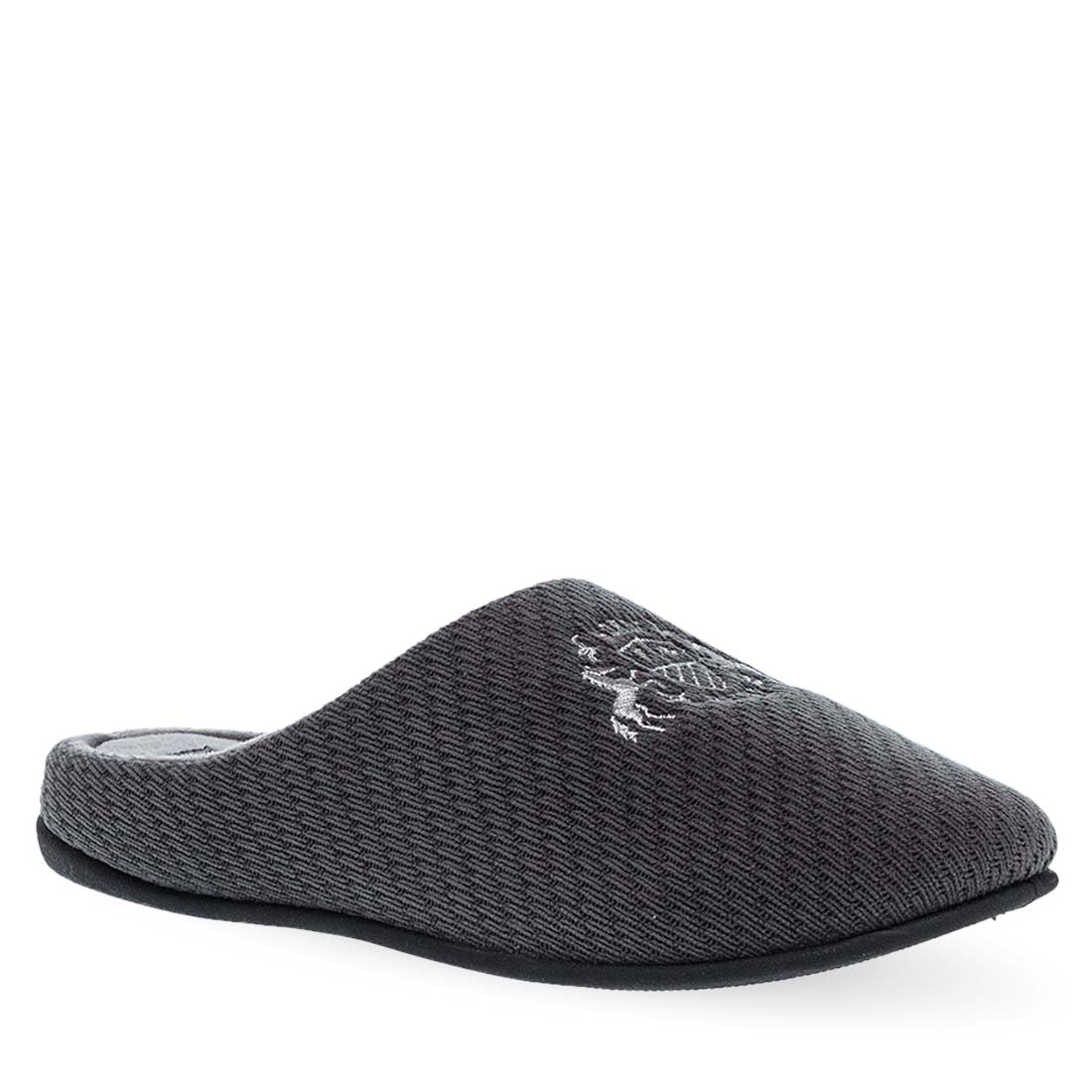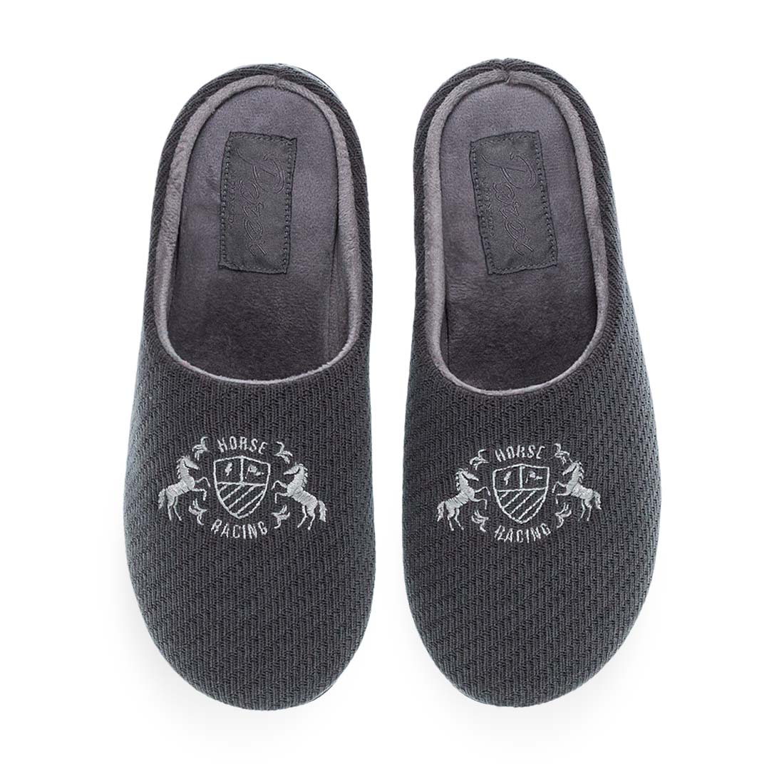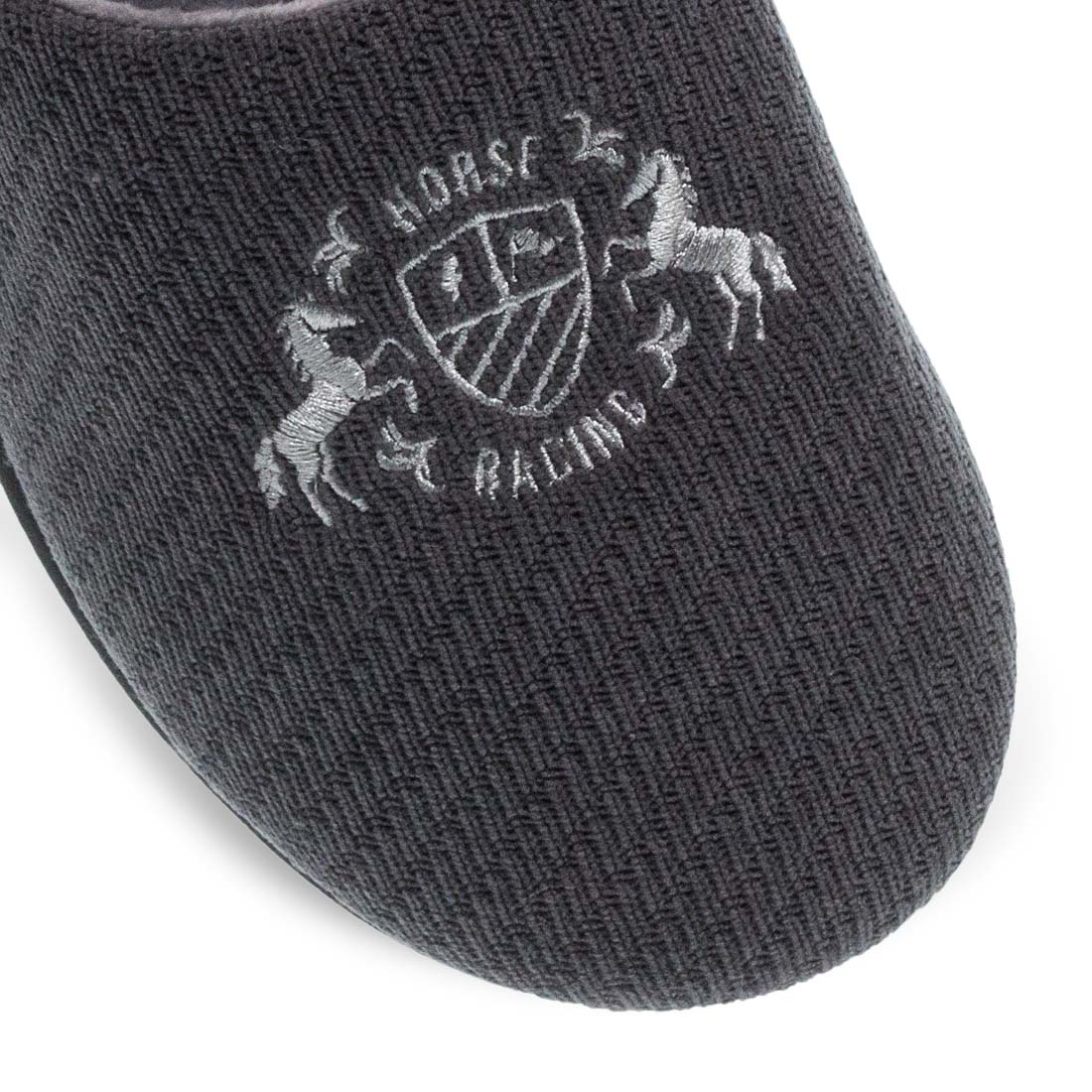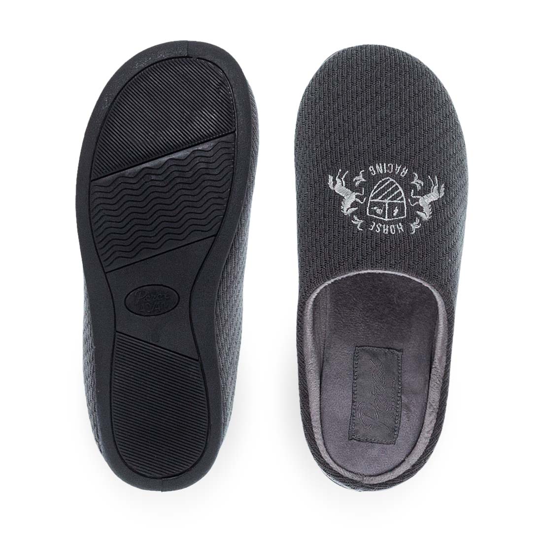 Men''s house slippers by Parex. Men’s Parex slippers in dark grey and navy blue with Horse Racing embroidery. Sturdy construction and casual design.
