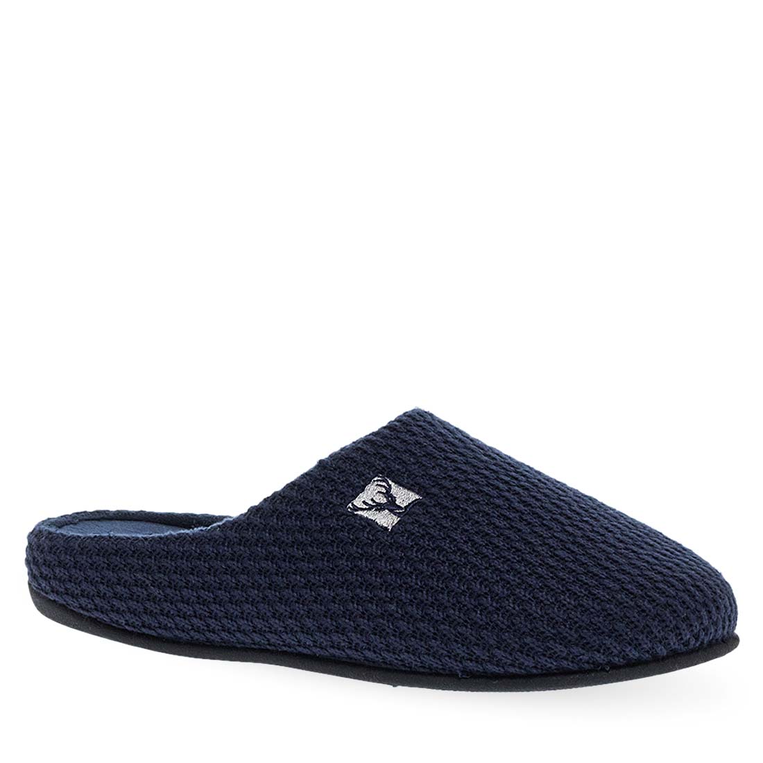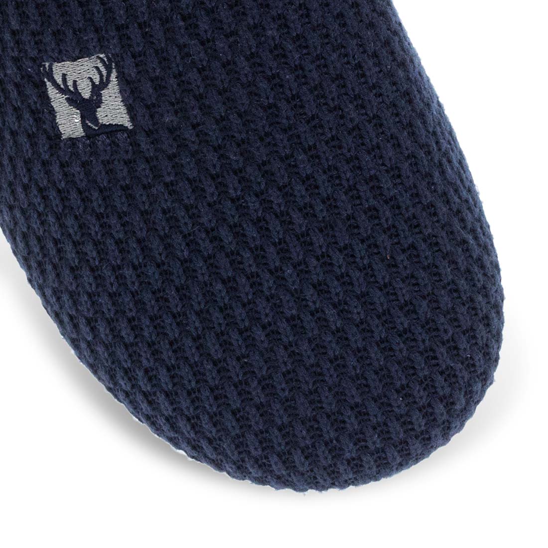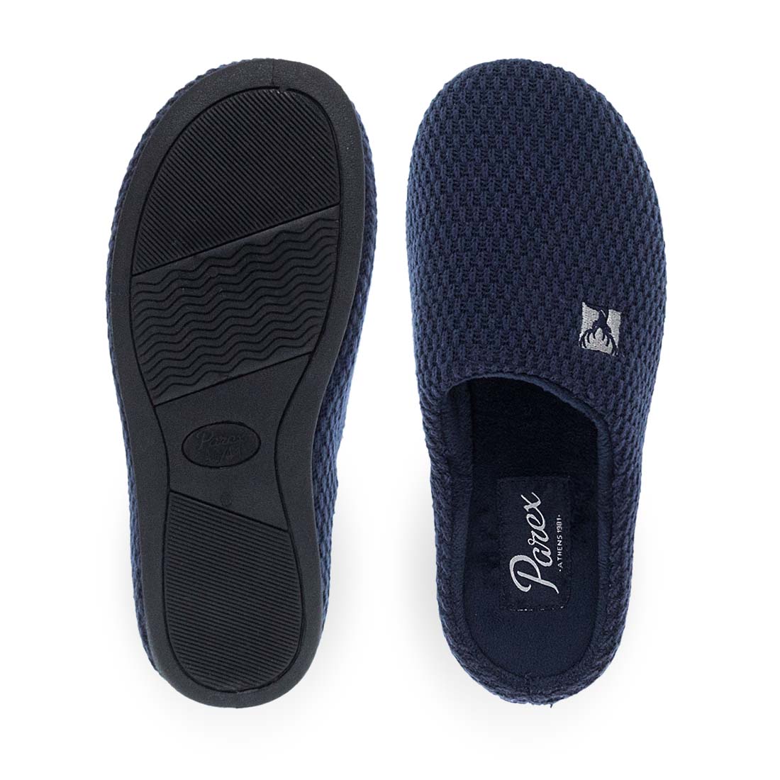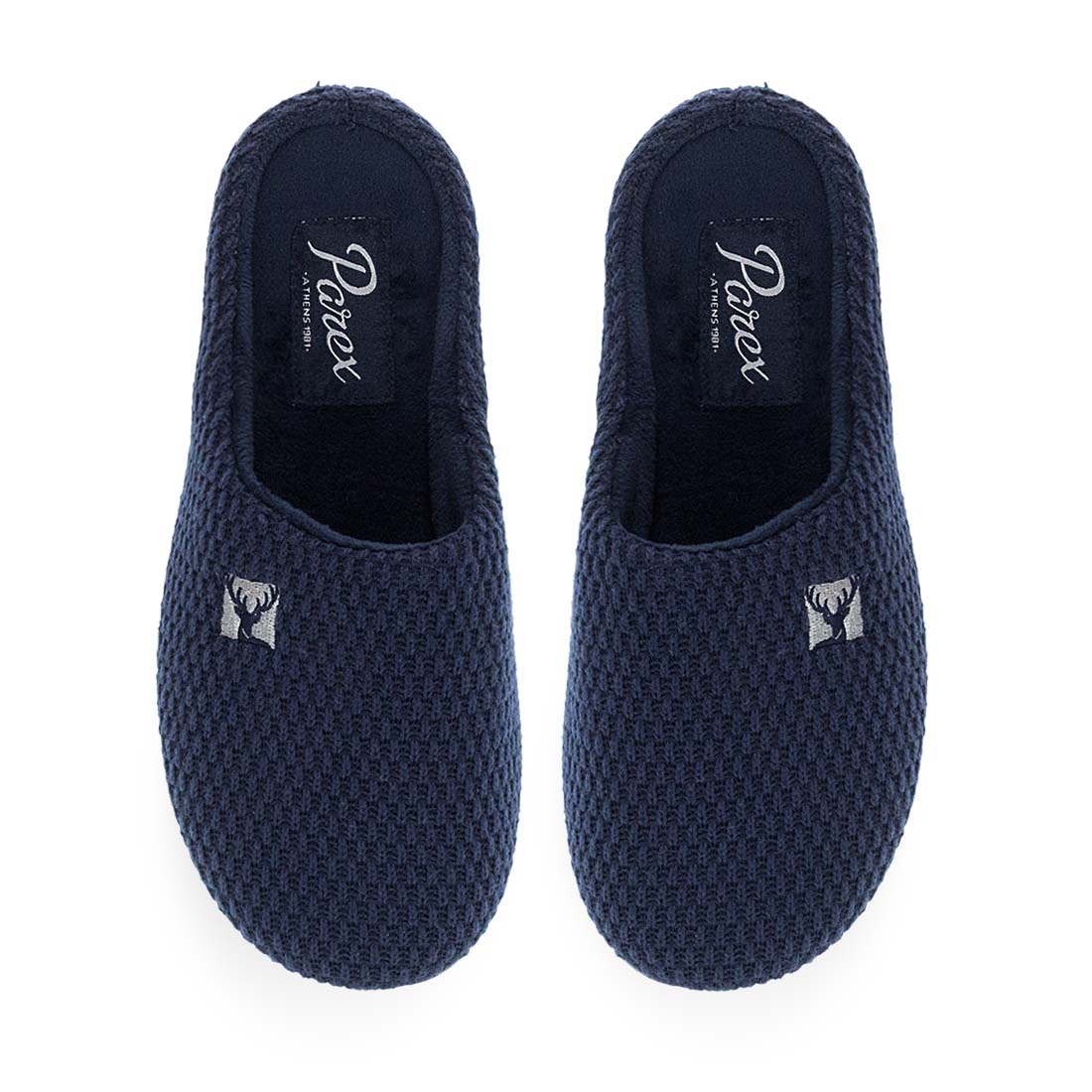 Men''s house slippers by Parex. Men’s Parex slippers in black and navy blue colors with embossed knit and deer design. Warm and stylish for everyday use.
