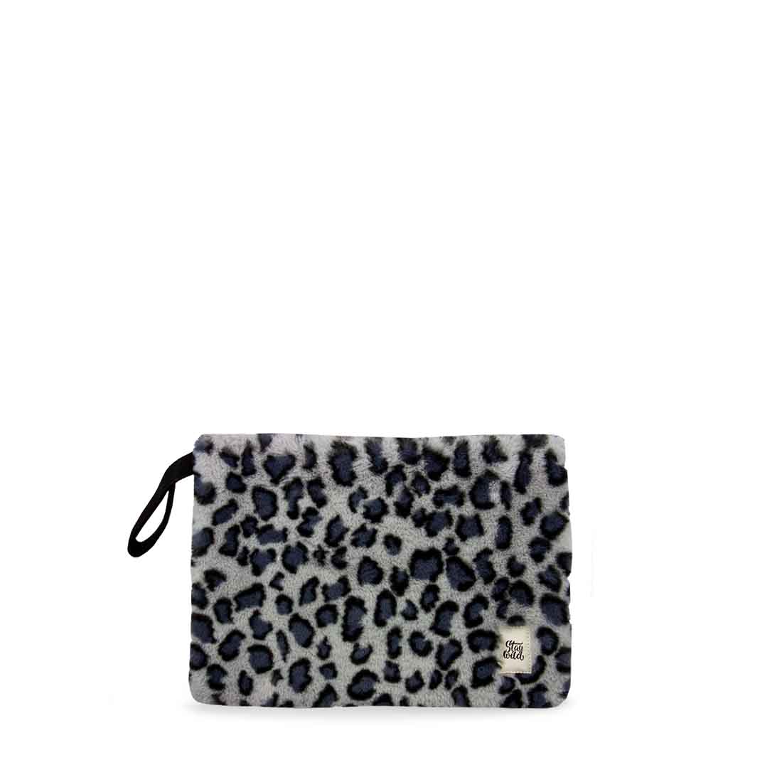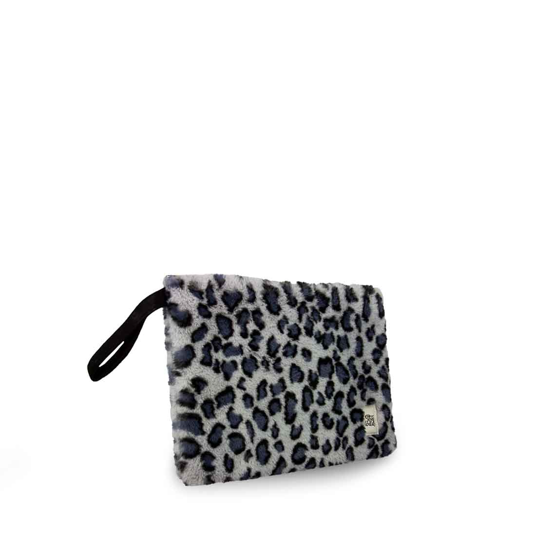 Modern bag made of soft fabric in beige and grey color with leopard details. Zip closure. 25X18CM
