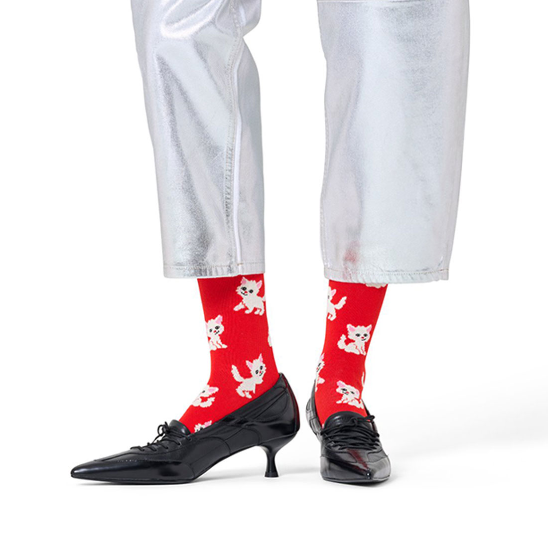 Women''s socks by Happy Socks. Women’s Happy Socks with cute white kittens on a red background. A playful, joyful design that adds charm and personality to any look. Made from soft cotton for all-day comfort.