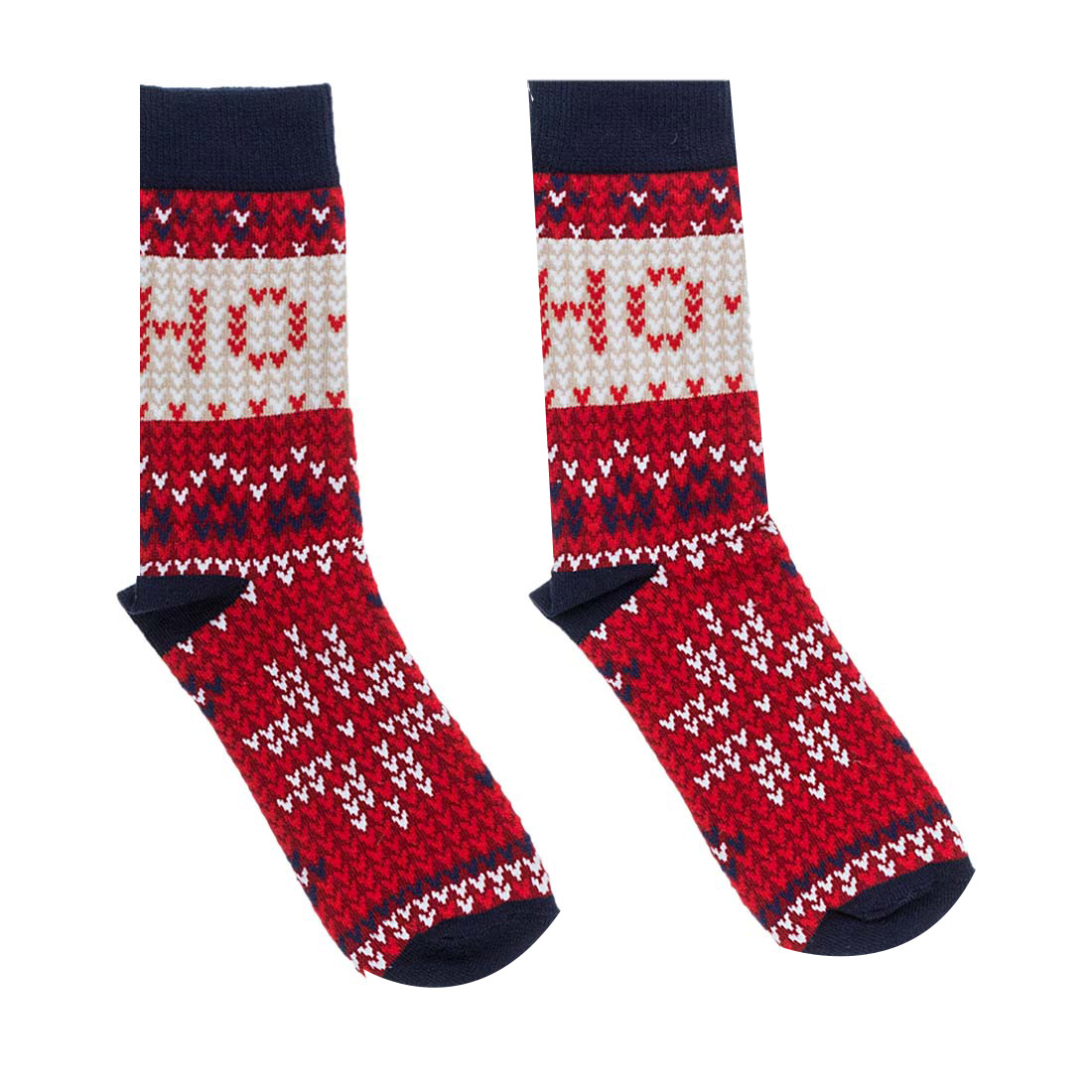 Women''s socks by Parex. Red and navy socks with traditional Christmas knit pattern. Warm, cozy, and festive.
