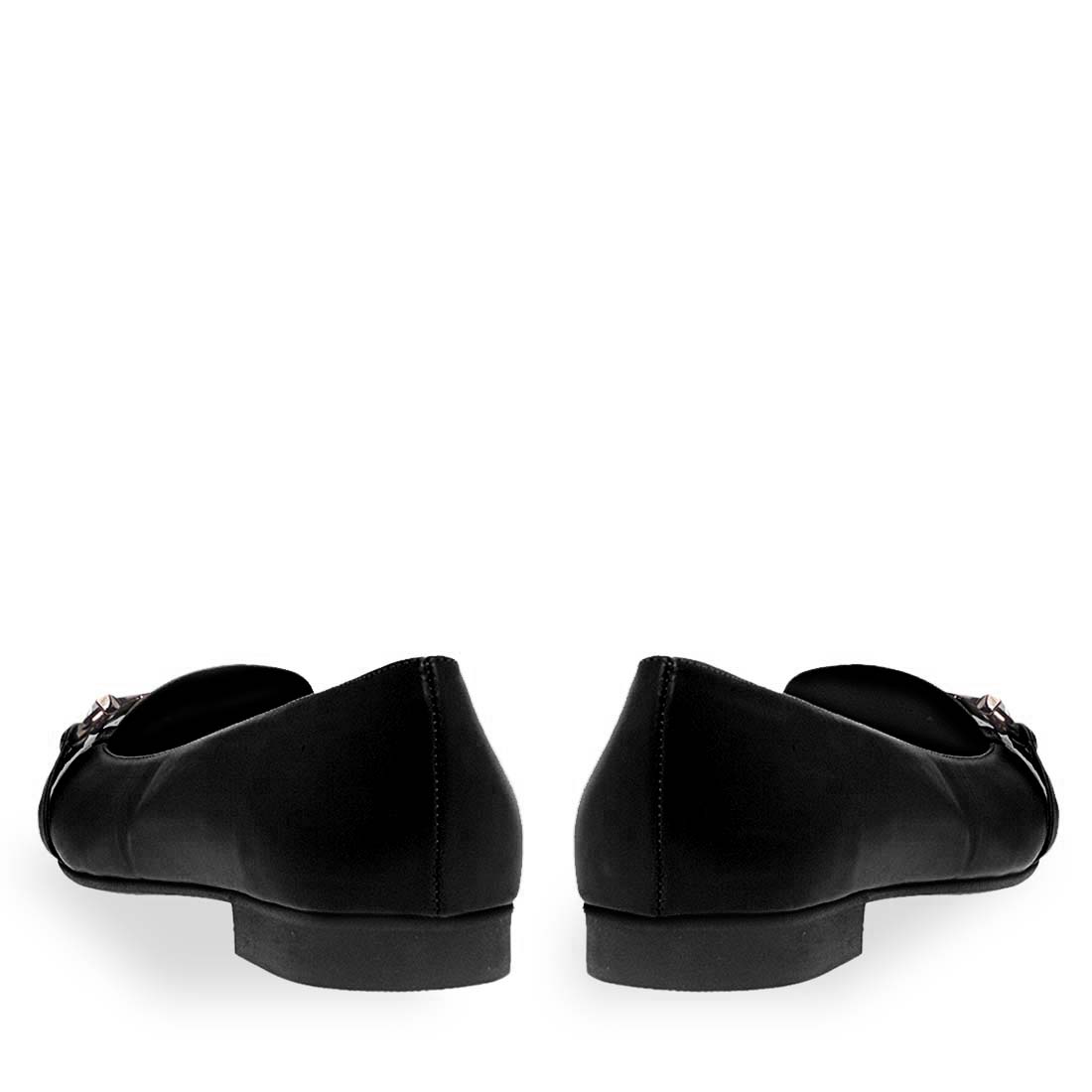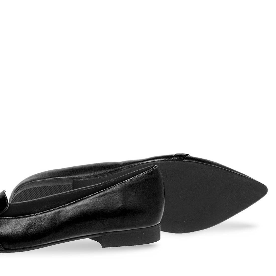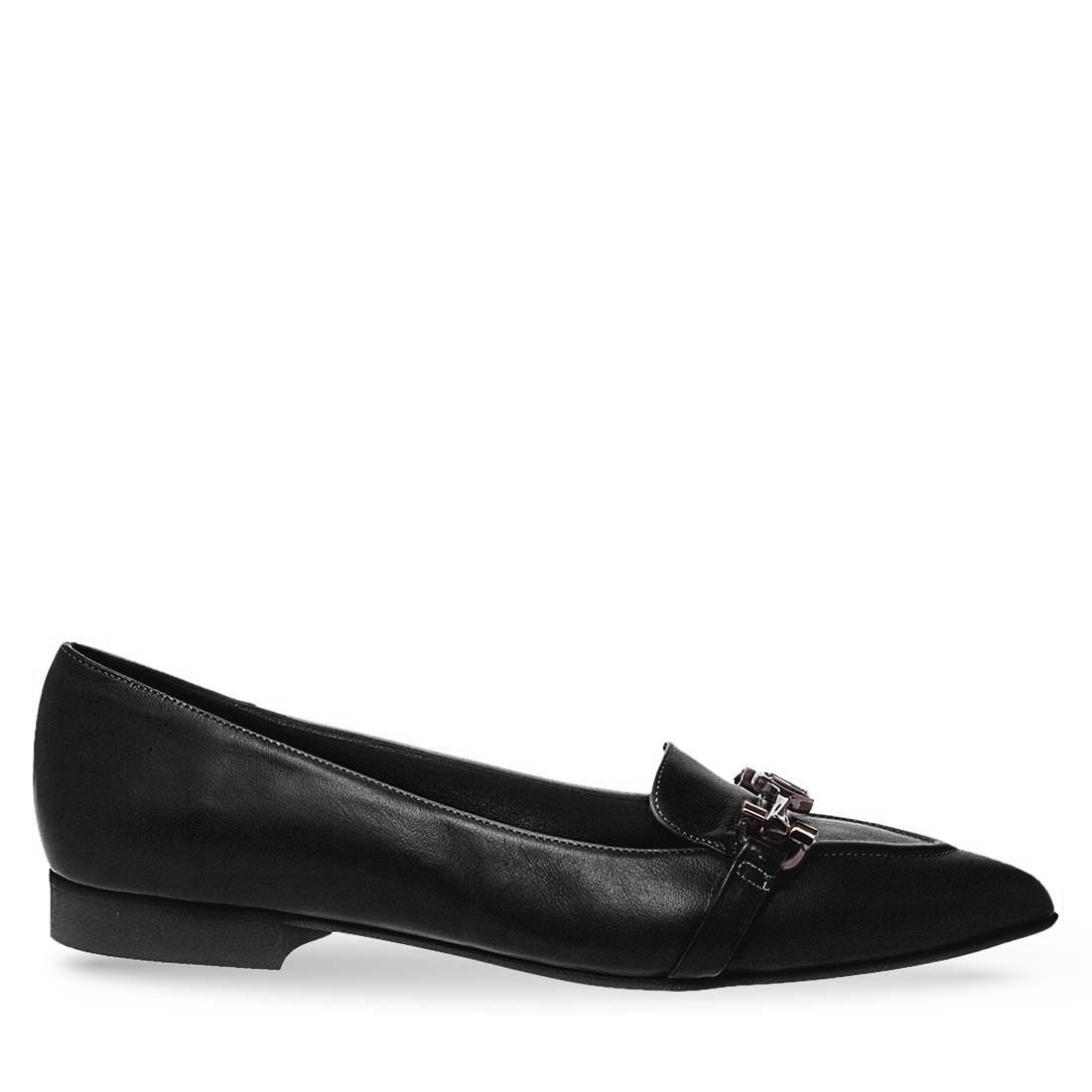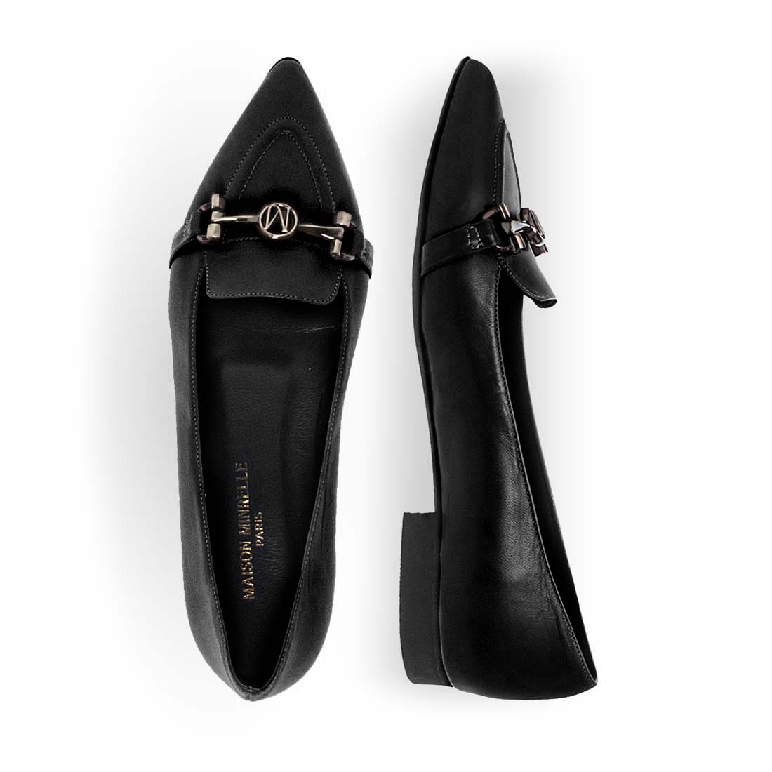 Flat, pointed toe ballerinas by Maison Minrelle. This leather design is adorned with chic gold tone detail. This pair is the perfect choice for your office look.
