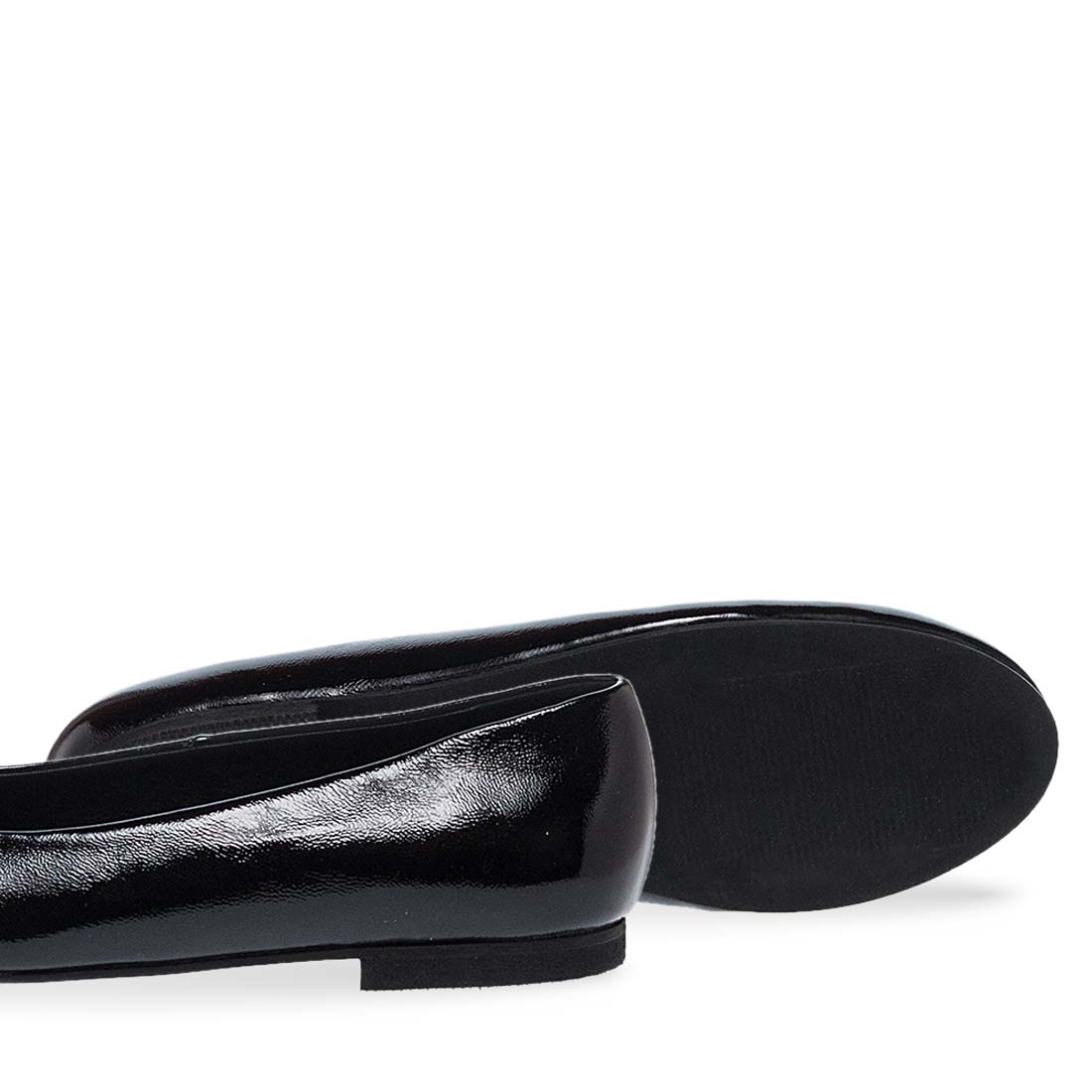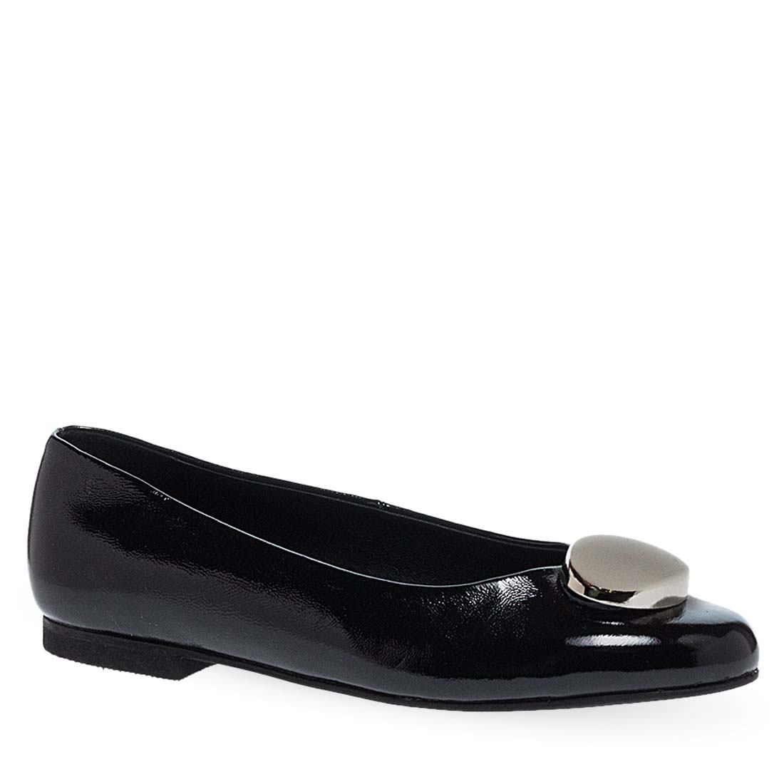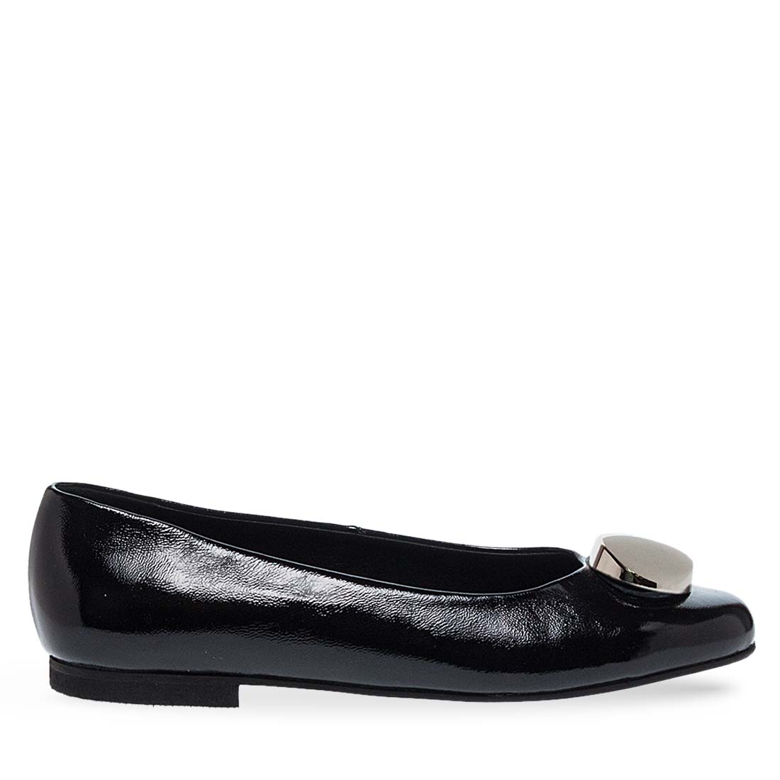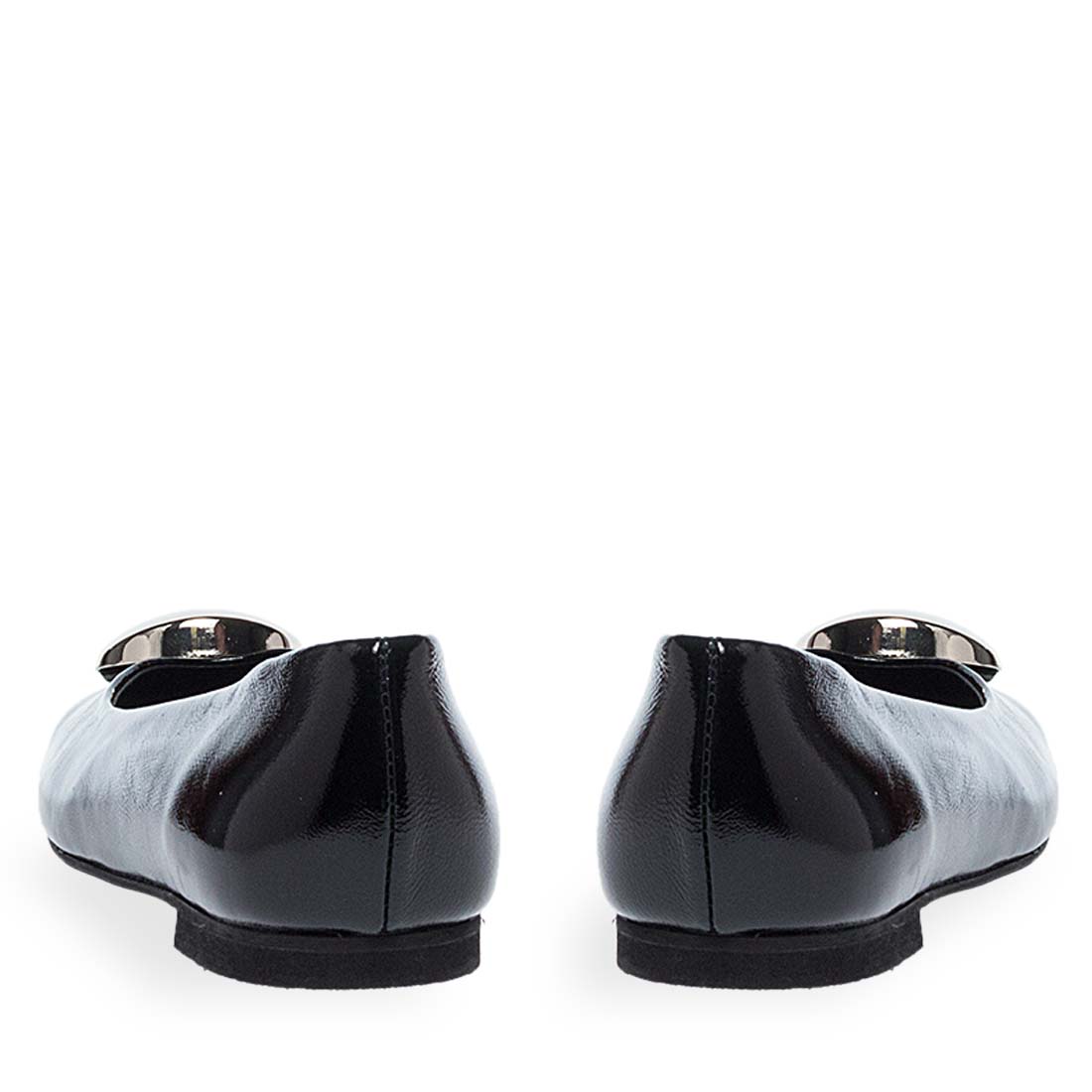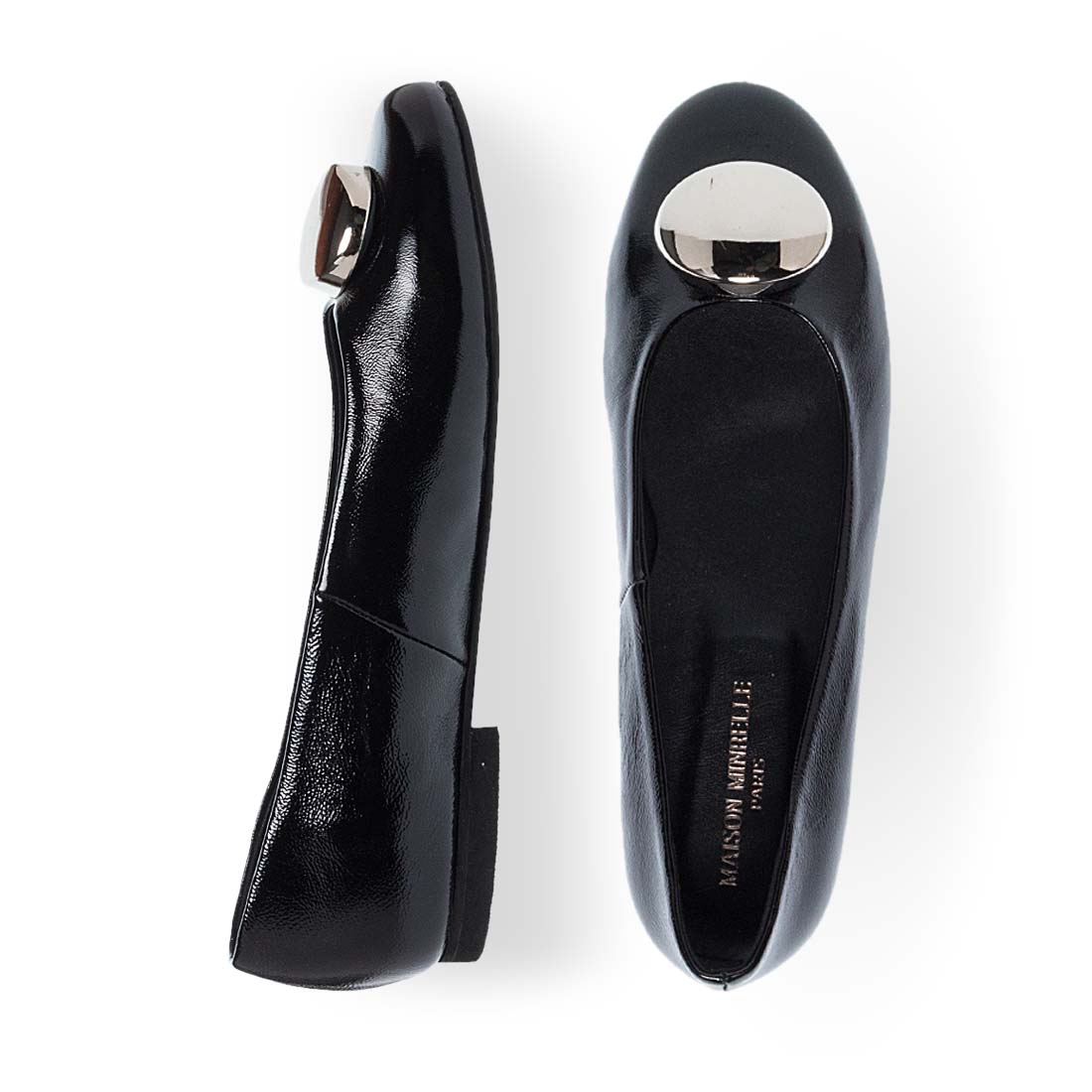 Women''s leather ballerinas by Maison Minrelle. Women’s black leather ballet flats with a round metallic detail, perfect for elegant yet comfortable outfits.