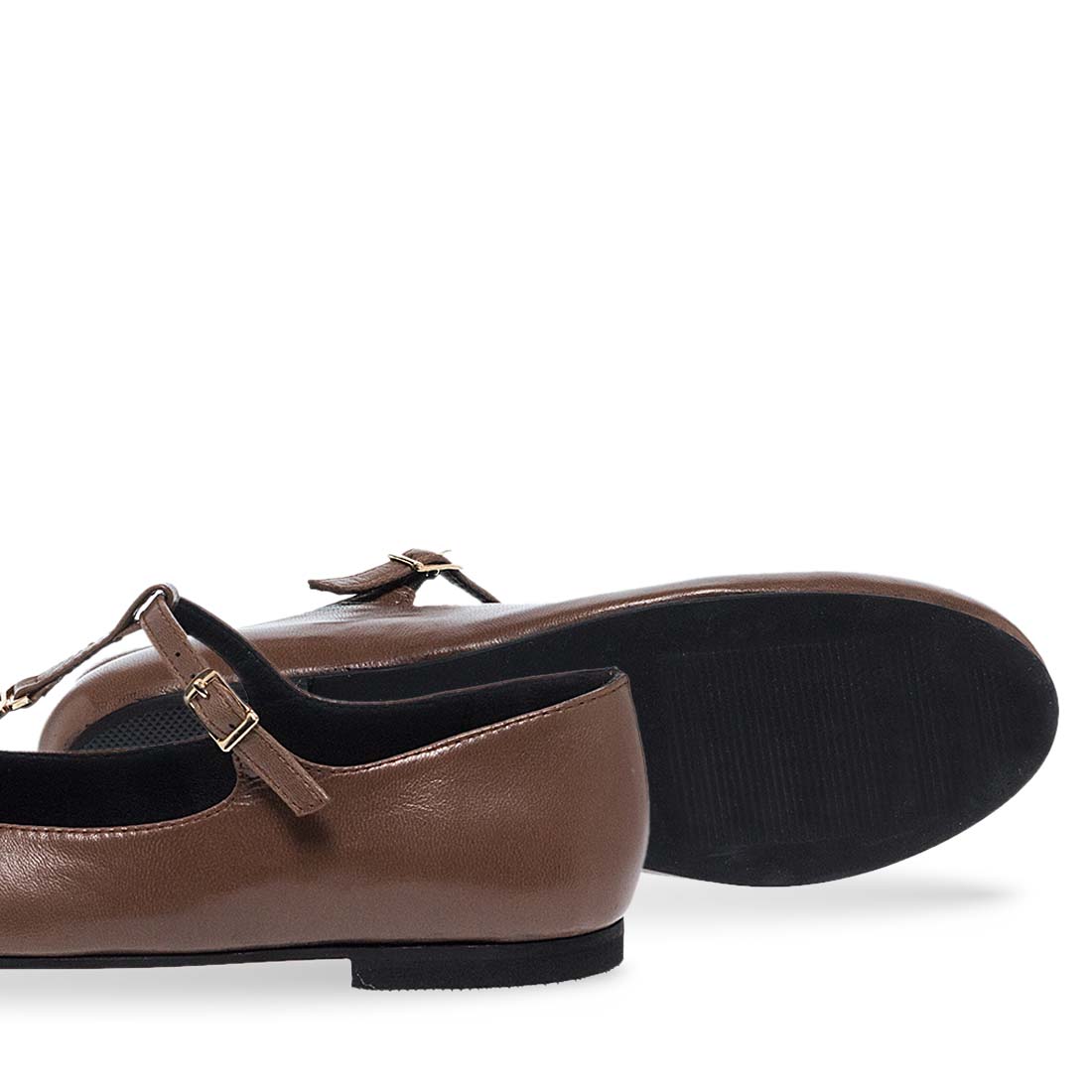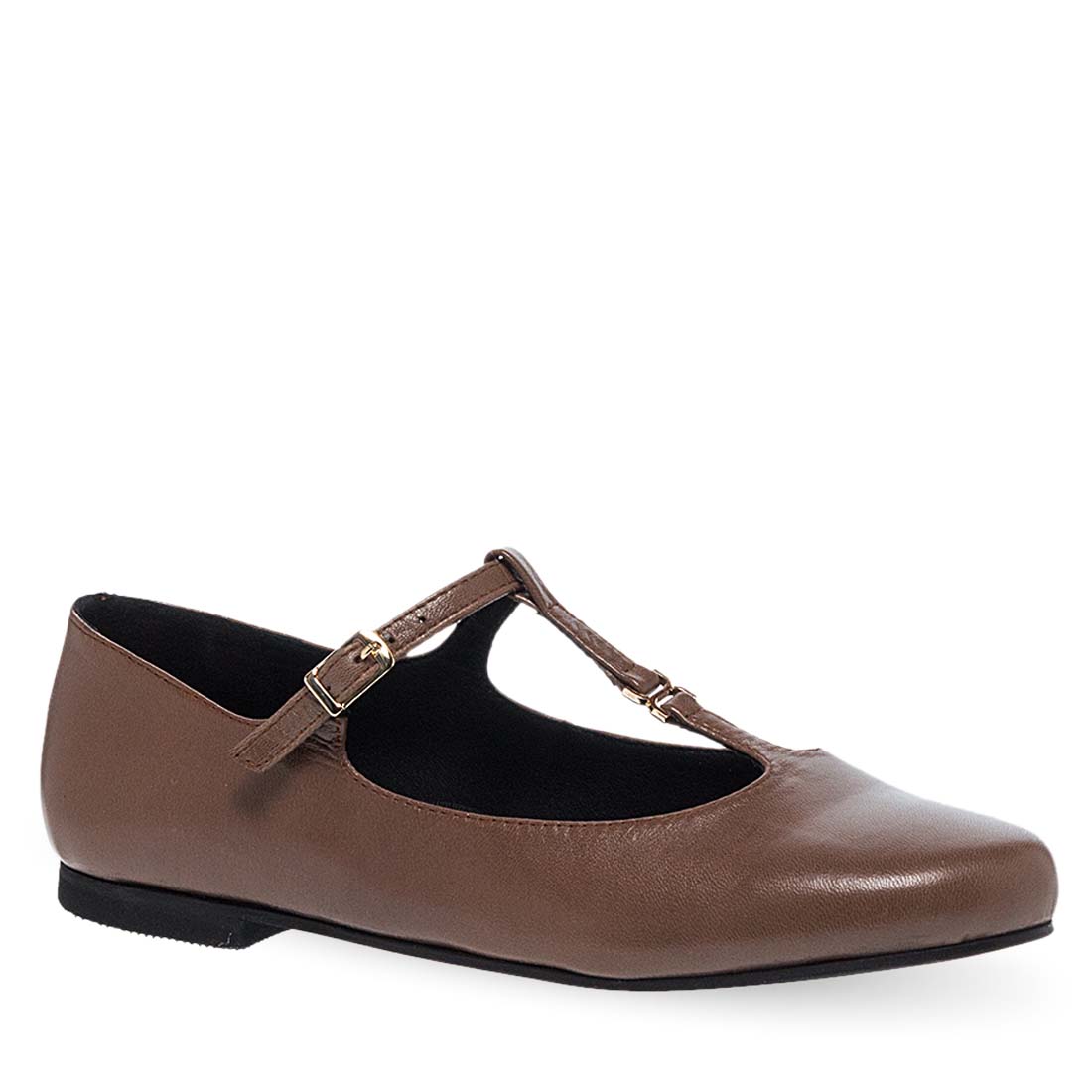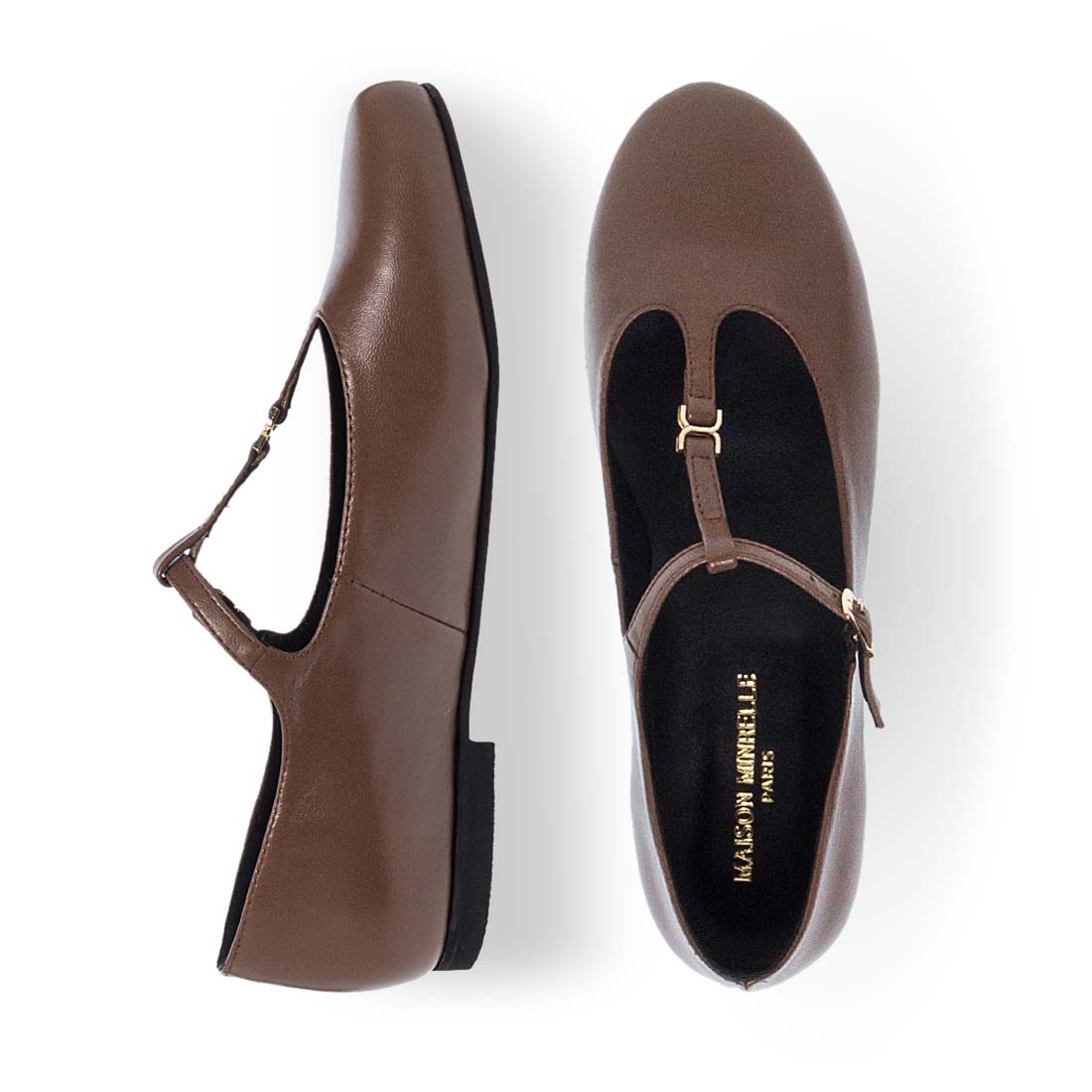 Women''s leather ballerinas by Maison Minrelle. Black T-strap leather flats with gold buckle for a vintage-inspired look.