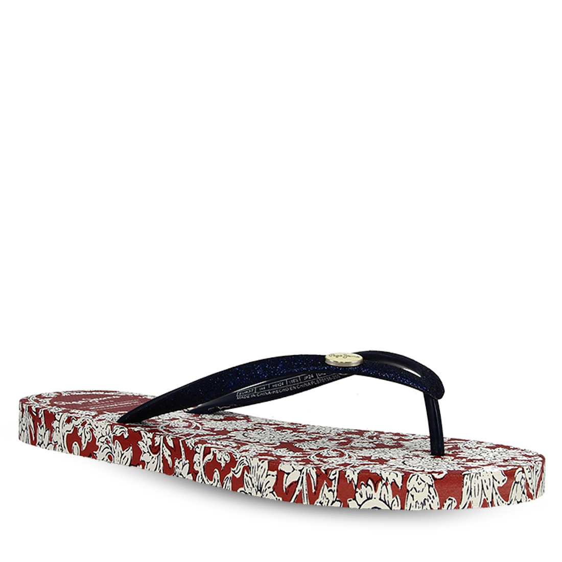 Durable flip flops with printed flower on footbed. Thong slim-straps. Flat sole. Durable outsole. Easy to wear.