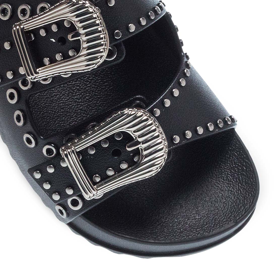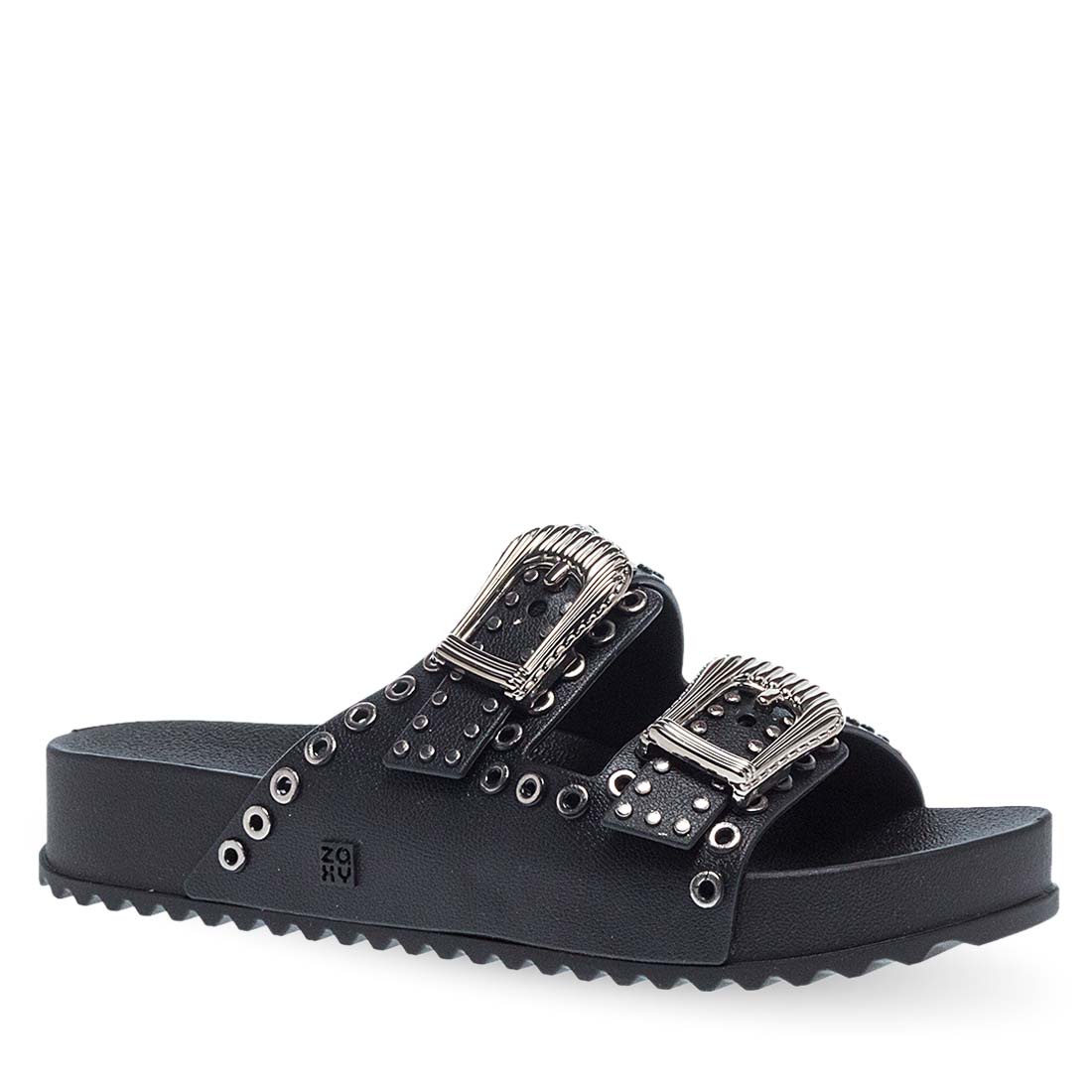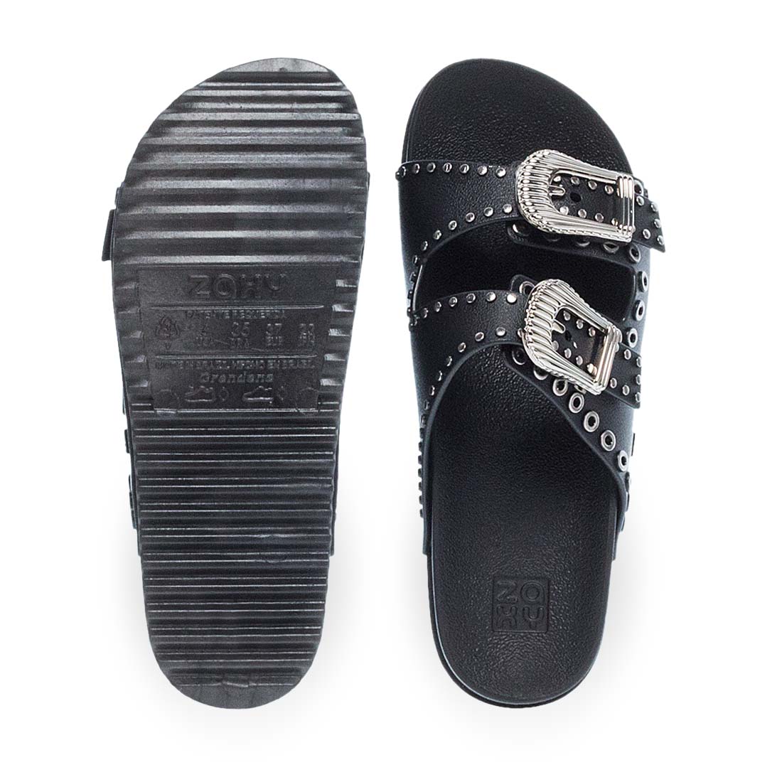 Black flip flops by Zaxy with buckle fastening. Modern and comfortable design. Ideal to use day to night. Relaxed fit. Easy to wear and clean.