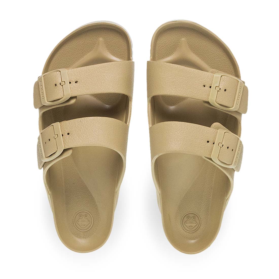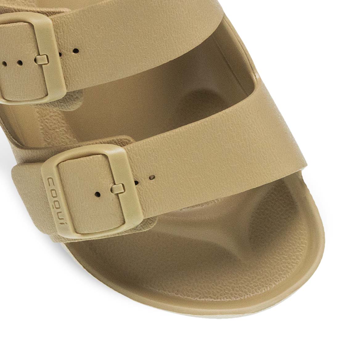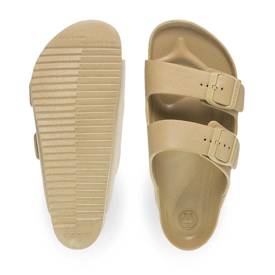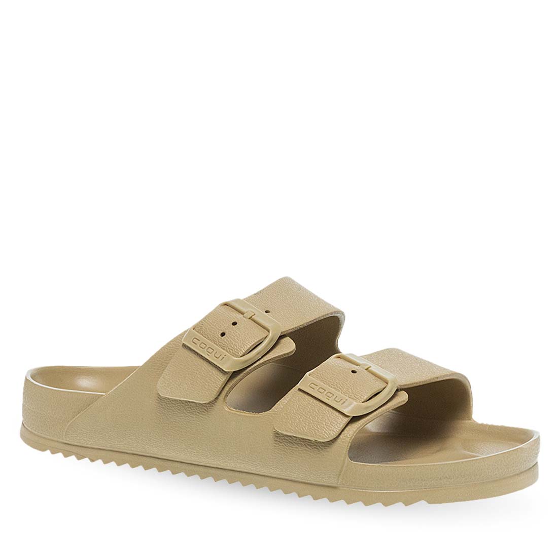Coqui slides with two plastic buckle straps. Made of excellent synthetic material and plastic. A stylish pair with moulded sole. Easy application.