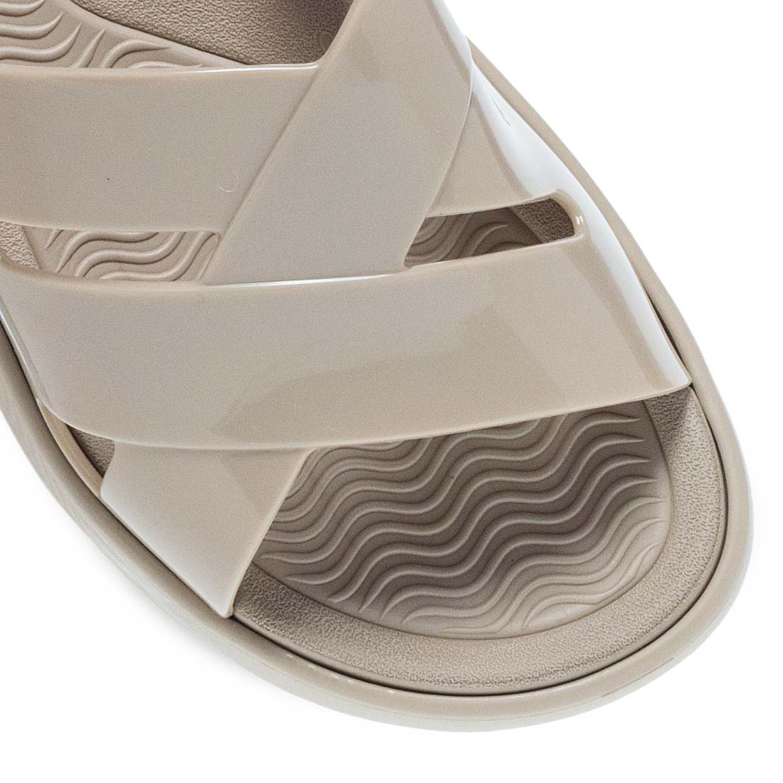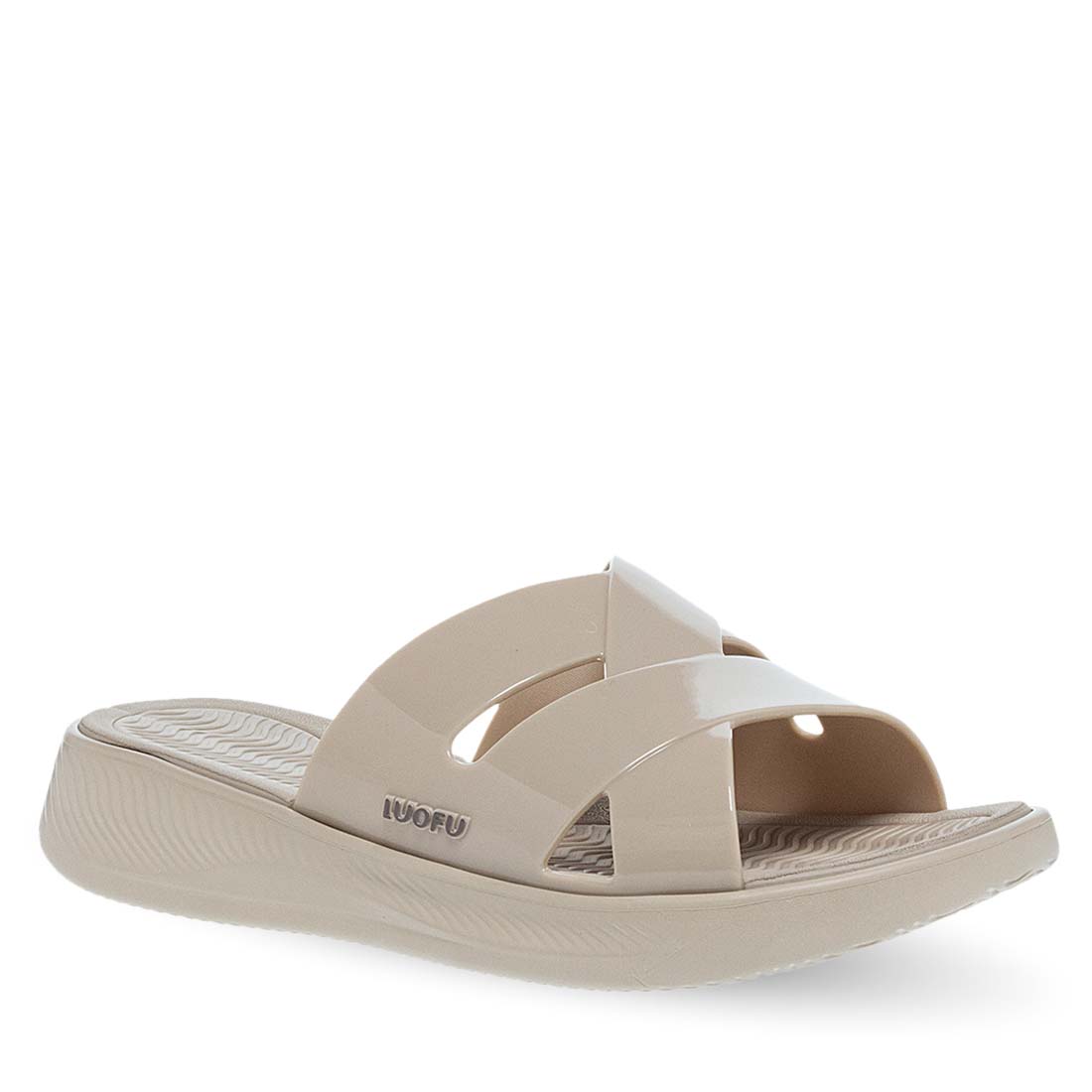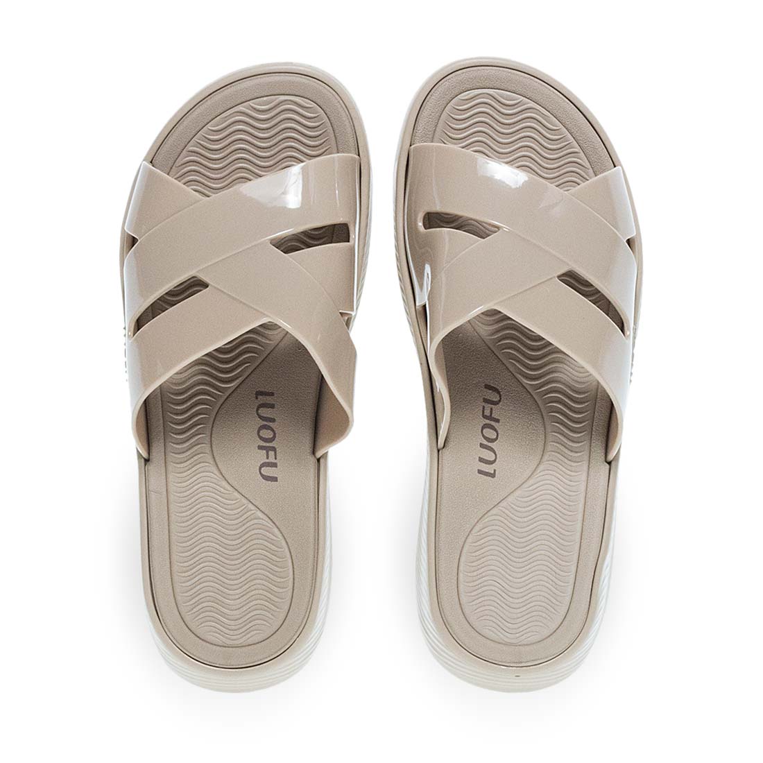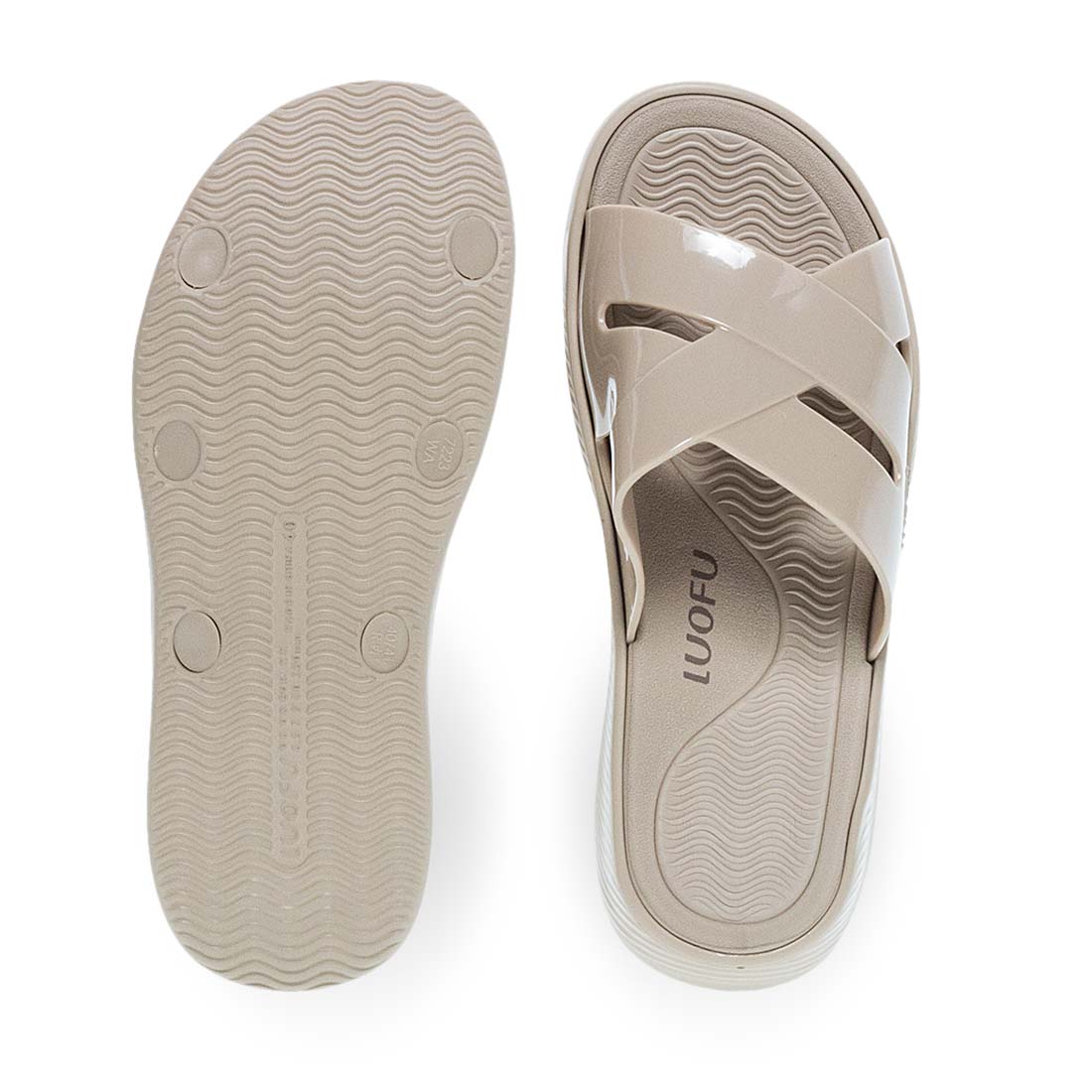 Monochrome and comfortable slides by Luofu. Wide strap on the upper. Stylish design with low platform sole. A lightweight design to wear on the beach. Available in several colors.