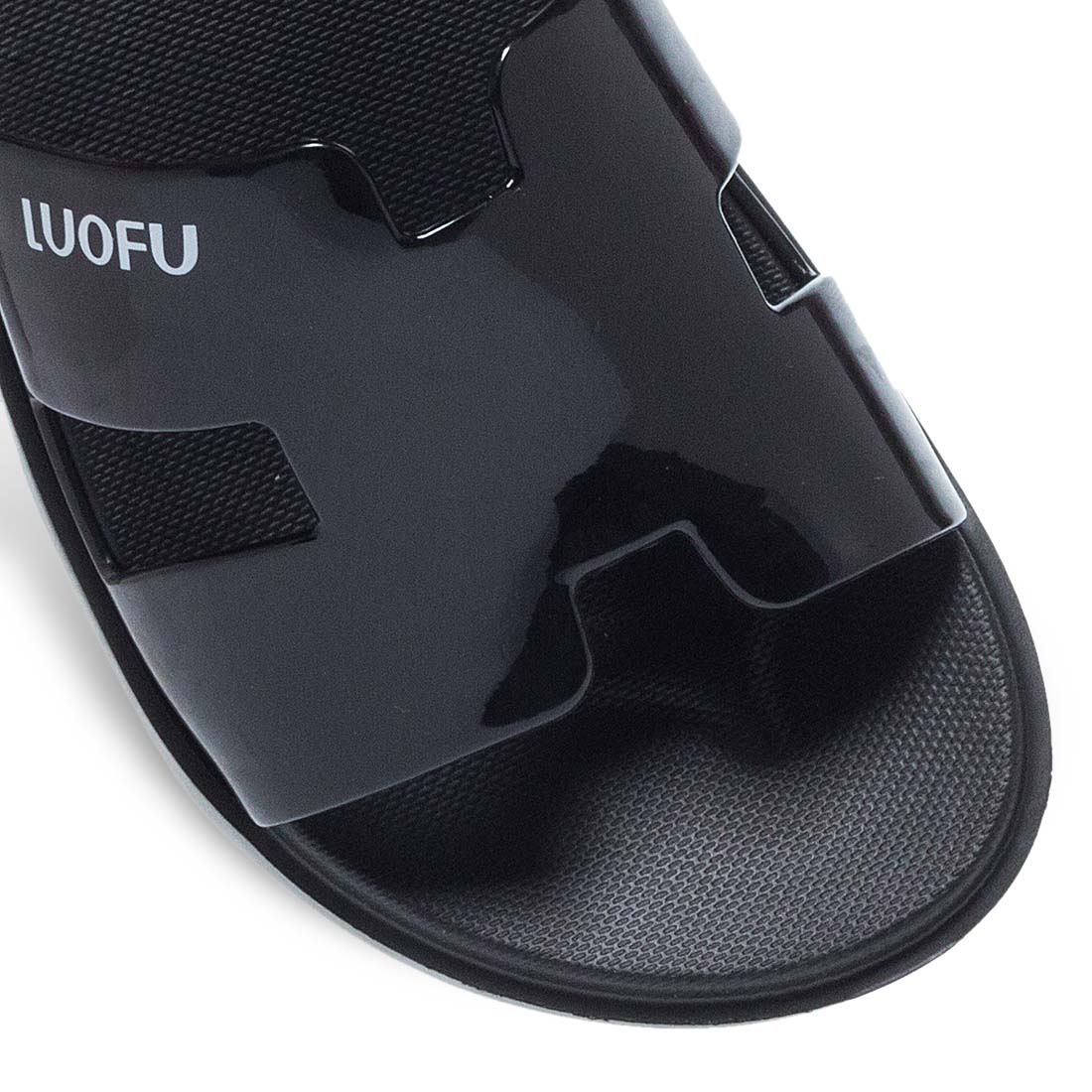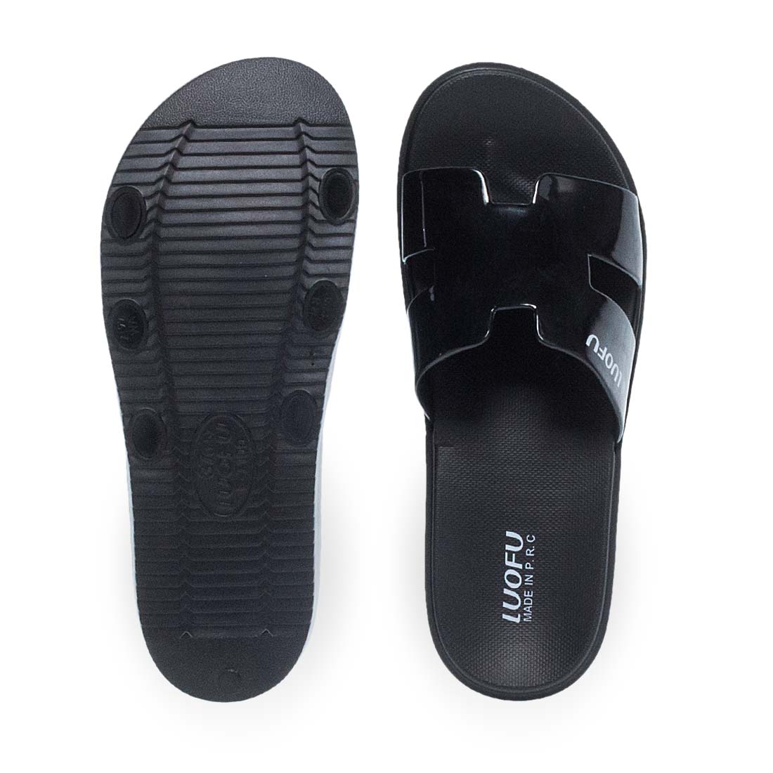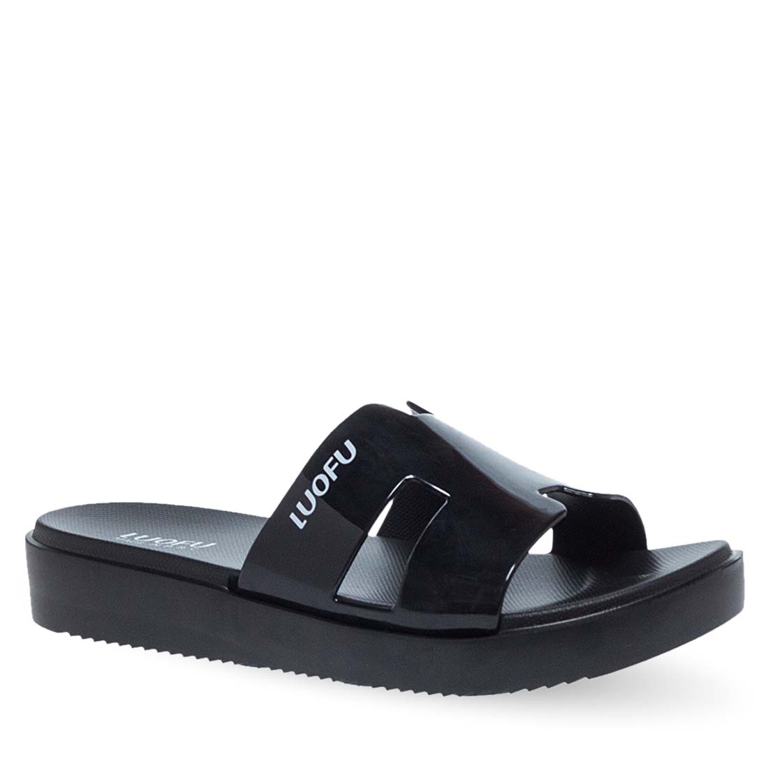 Monochrome slides by Luofu. Made from plastic. Synthetic, comfortable sole. This model is easy to wear and clean. Soft insole.