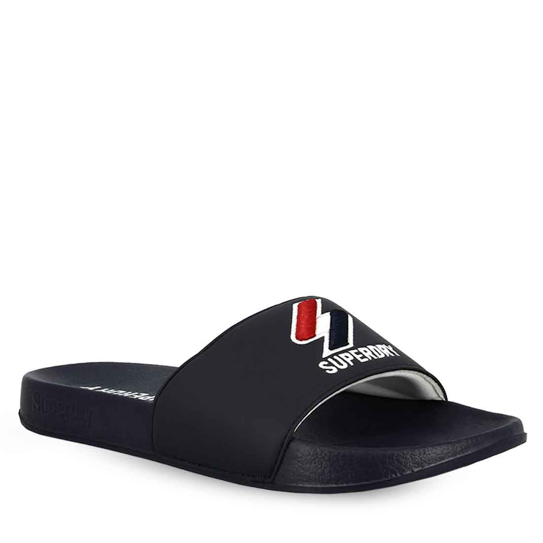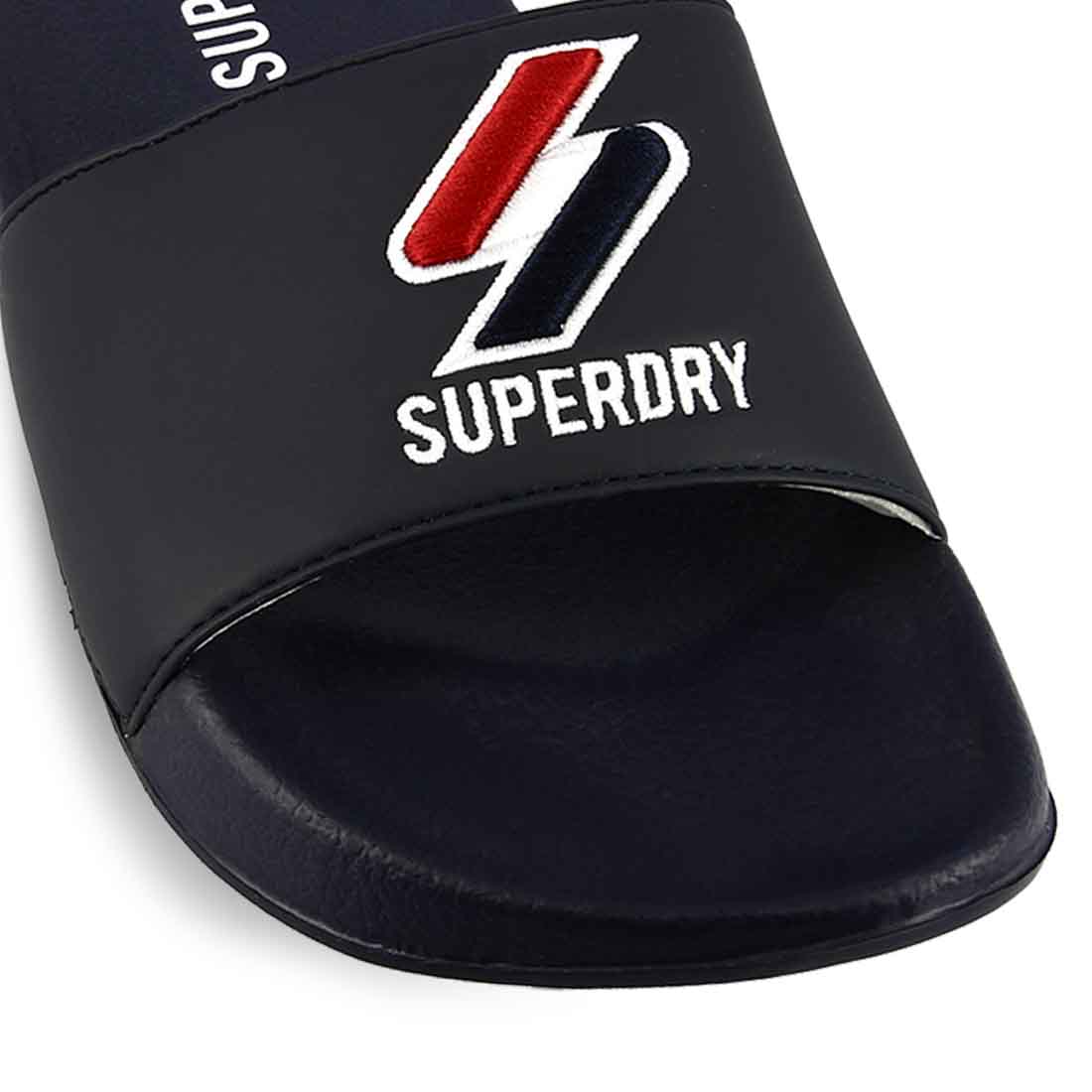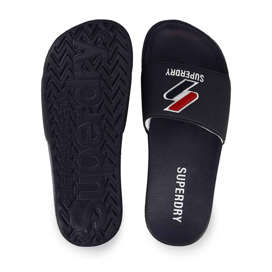 Superdry slides with embroidered logo on top. Soft strap. Moulded footbed. Slip-free sole. Safe design to wear next to pool! S=36/37 M=38/39 L=40/41