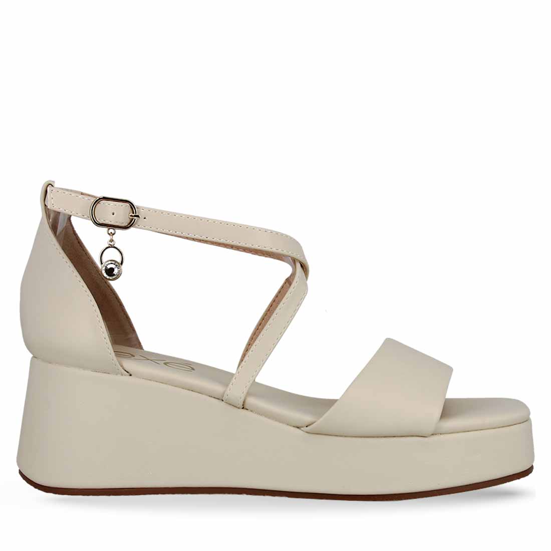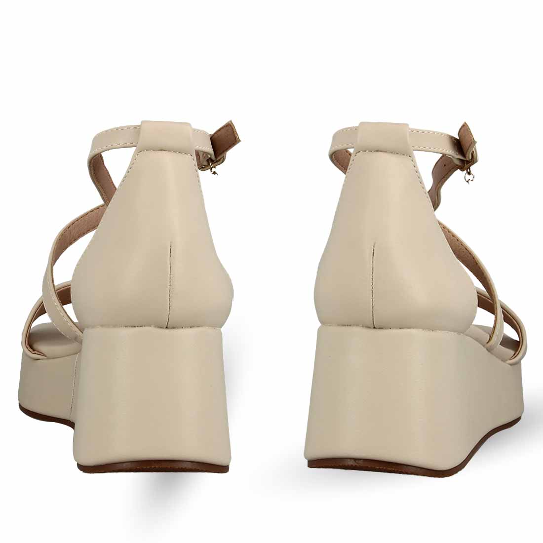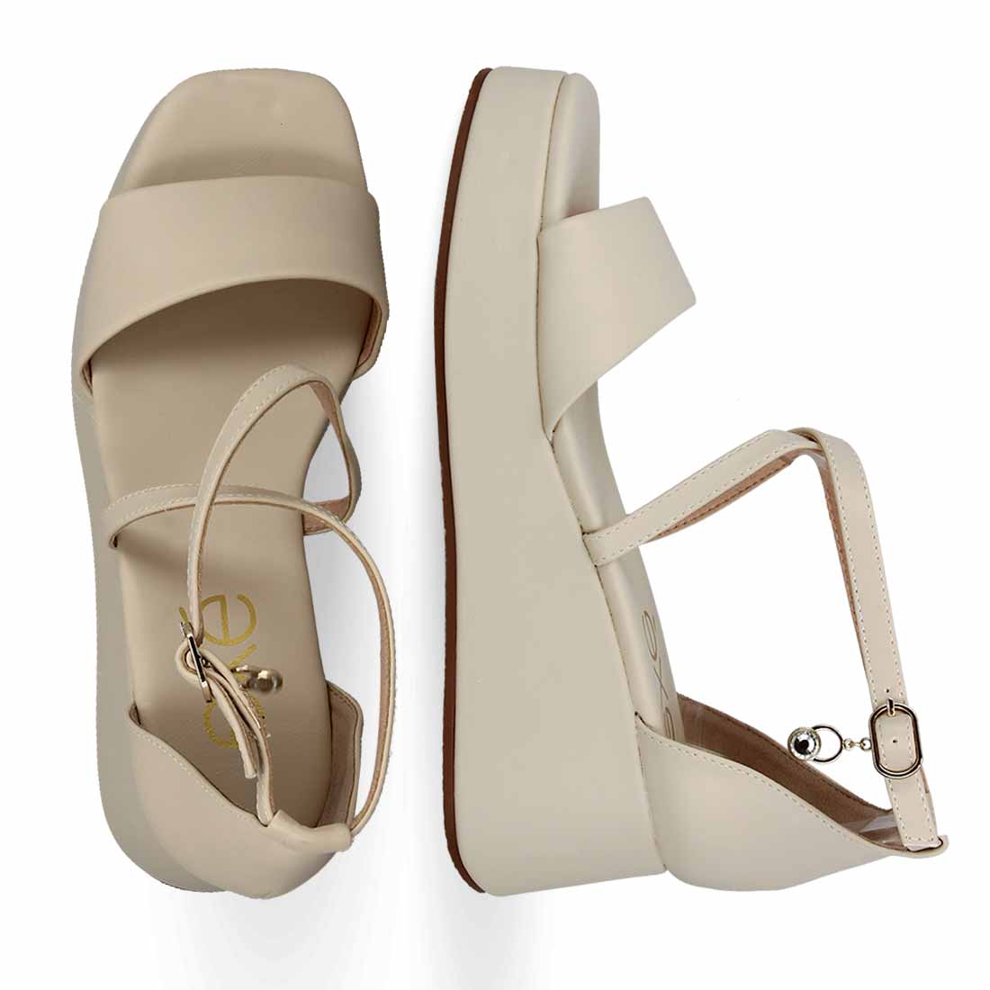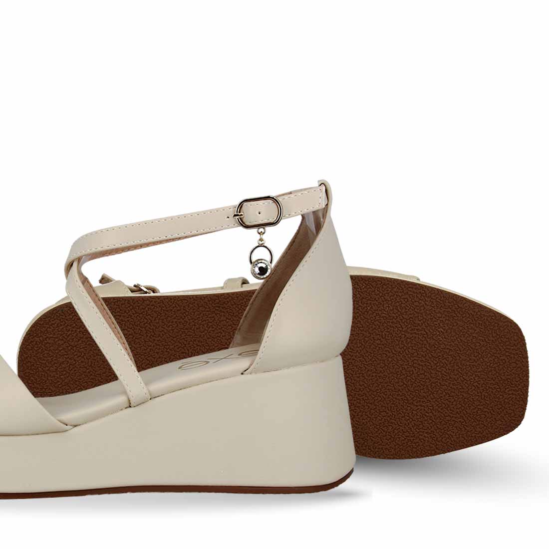 Add comfort and style to your every step with these monochrome women''s flatforms by new Exe collection. Cross ankle straps and side buckle closure. Available in a classic beige color that you can combine with your entire collection. Excellent combination of materials and colors. They have a very soft insole and a durable platform sole for stylish and comfortable steps.