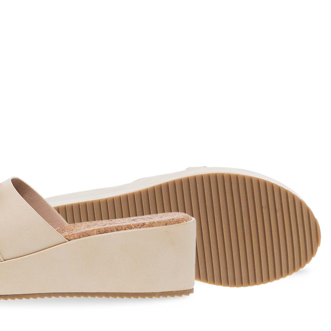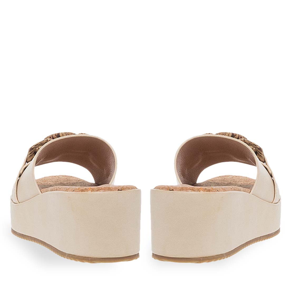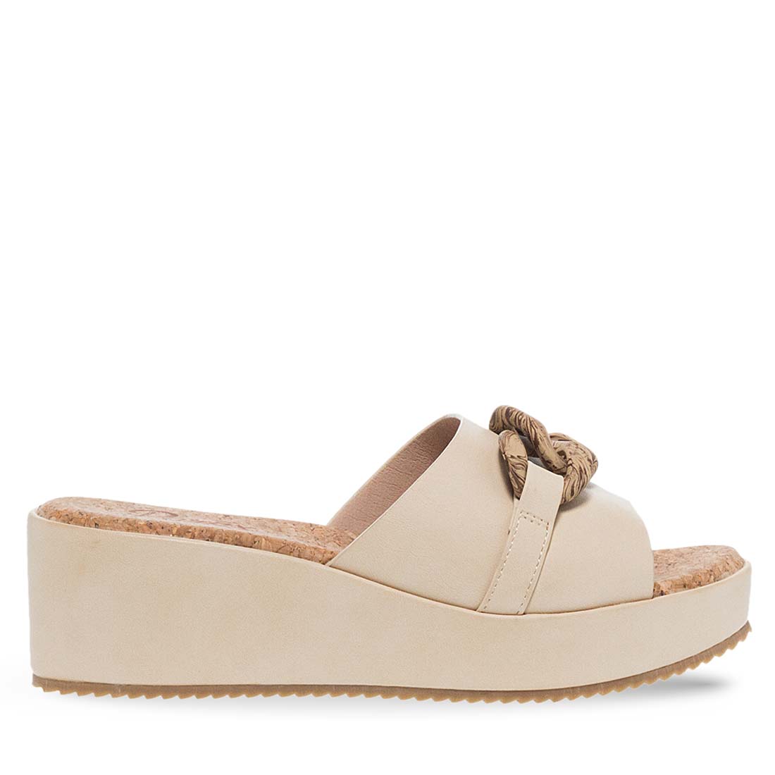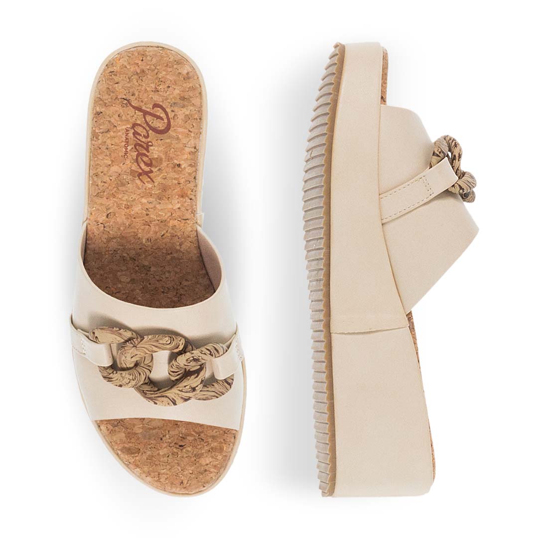 Step up your look with this great pair of flatform for women by Parex. Available in black, off-white and tan color, made of excellent quality eco leather. Soft cork sole and stable tractor sole. Wide strap at the upper with bone detail and velcro fastening at the ankle.