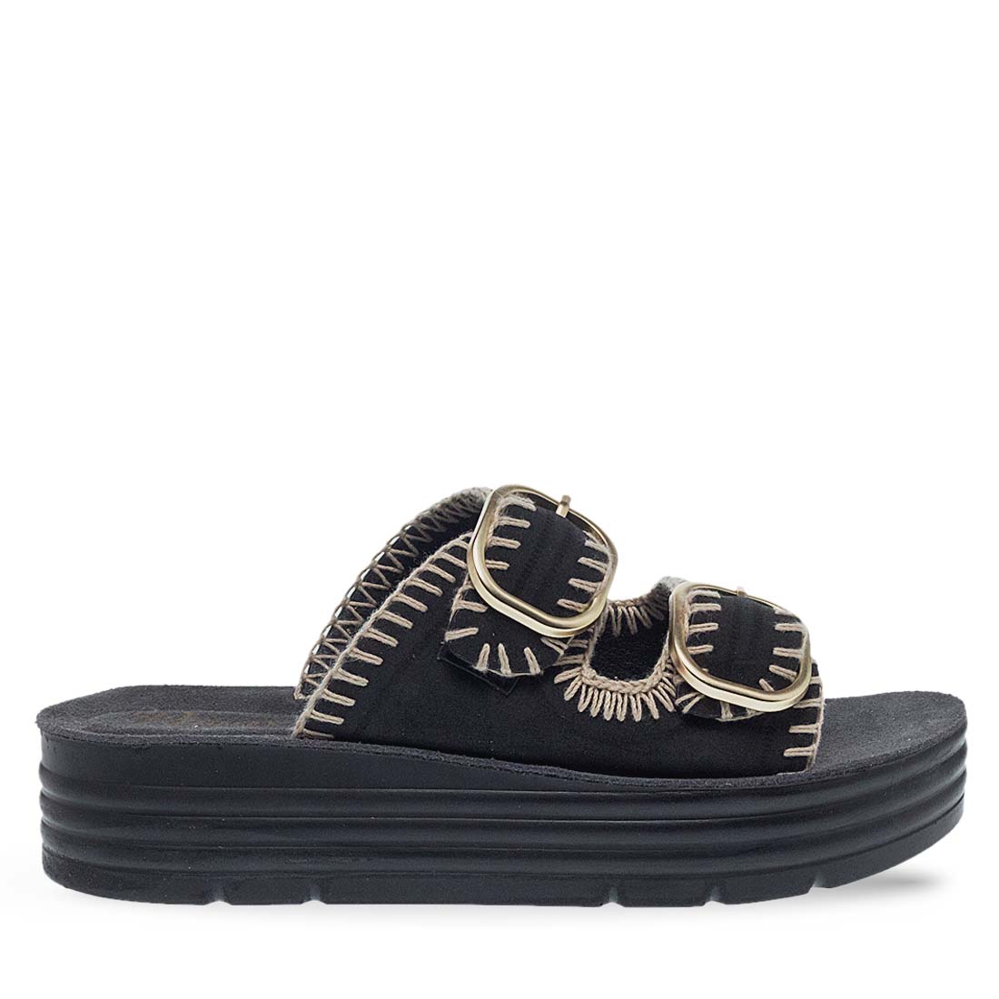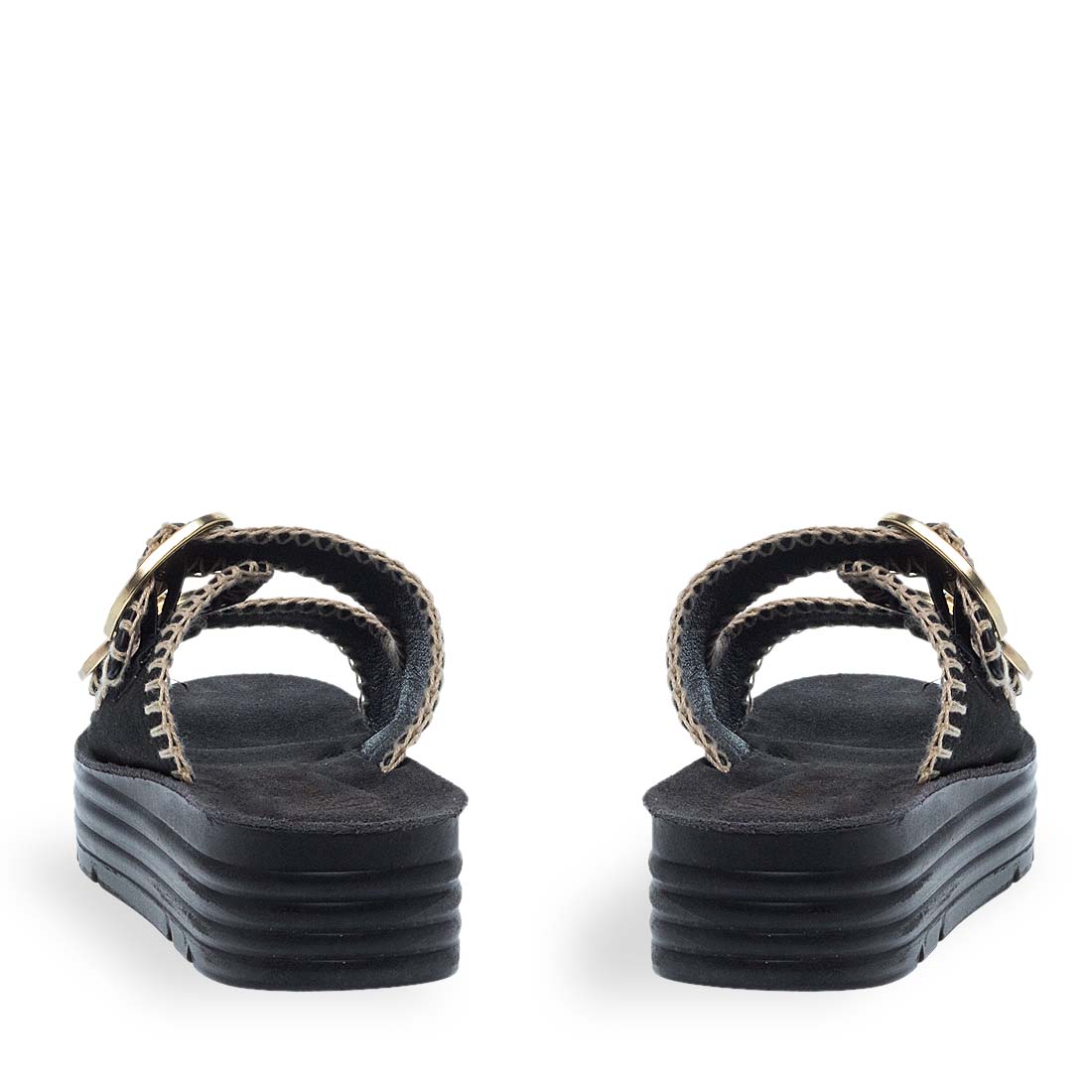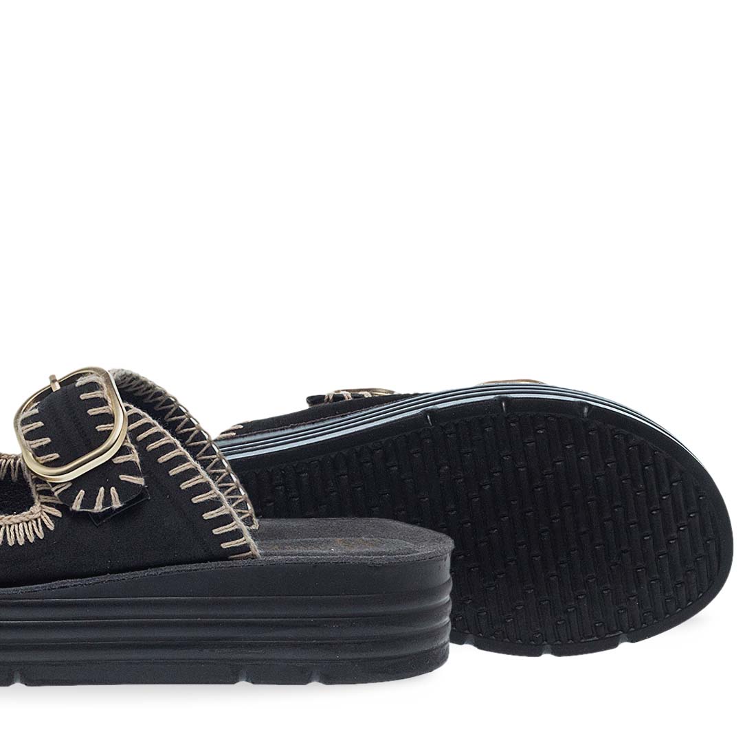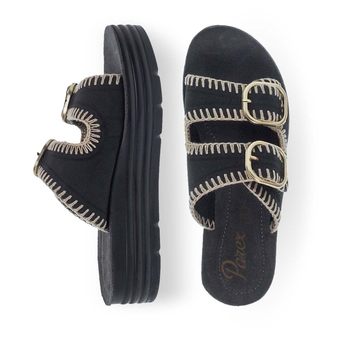 Give cool vibes to your look with these flatforms for women by Parex . Soft leather footbed and firm platform sole. Wide straps with a metal buckle fastening. The upper part is crafted from fabric. Suitable to wear day to night.
