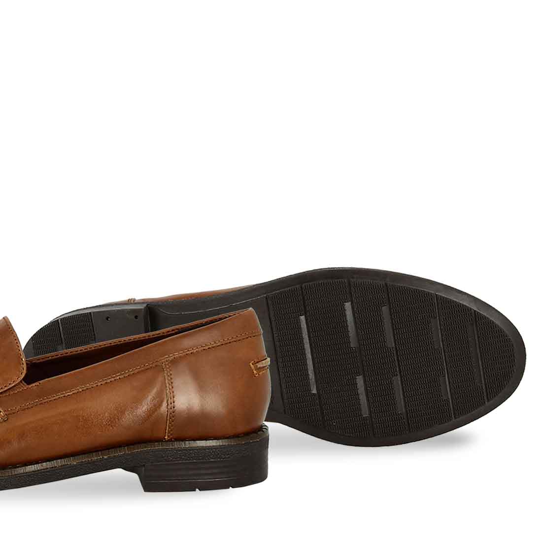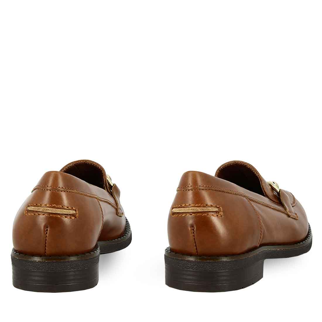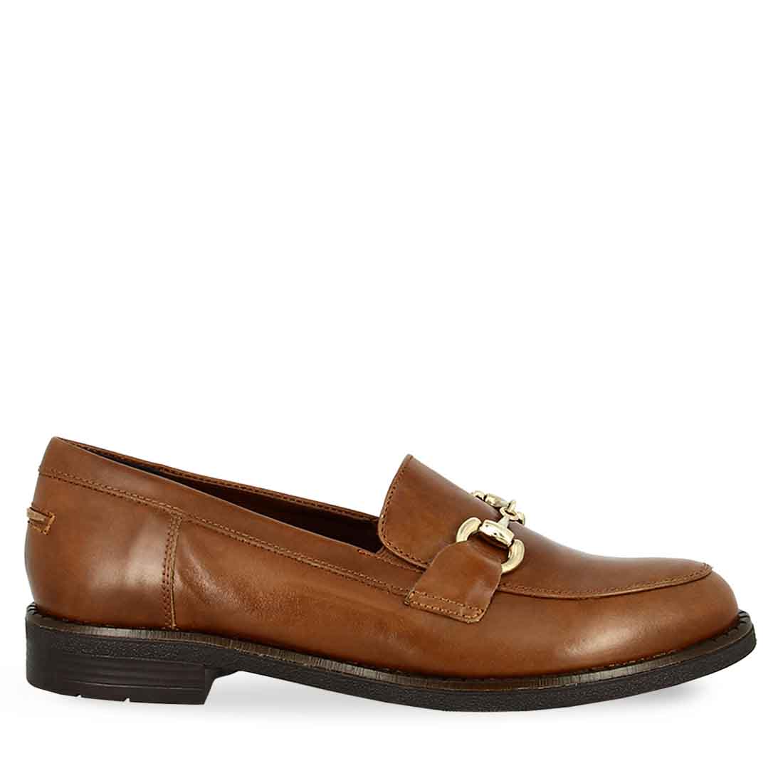 Monochrome moccasins with metallic detail on the upper part. Available in 2 colors. Comfortable leather footbed and a low heel for comfortable and stable steps all day.