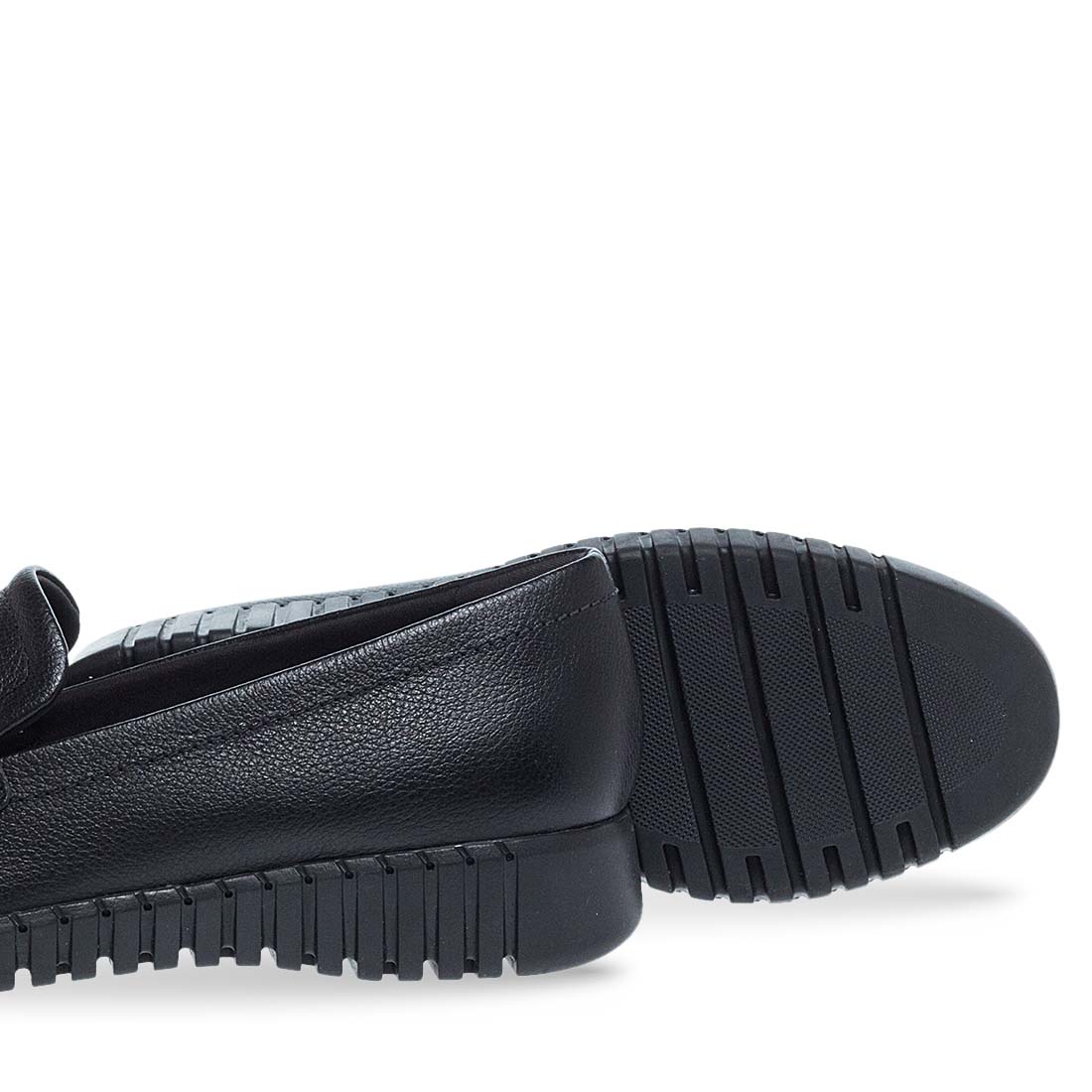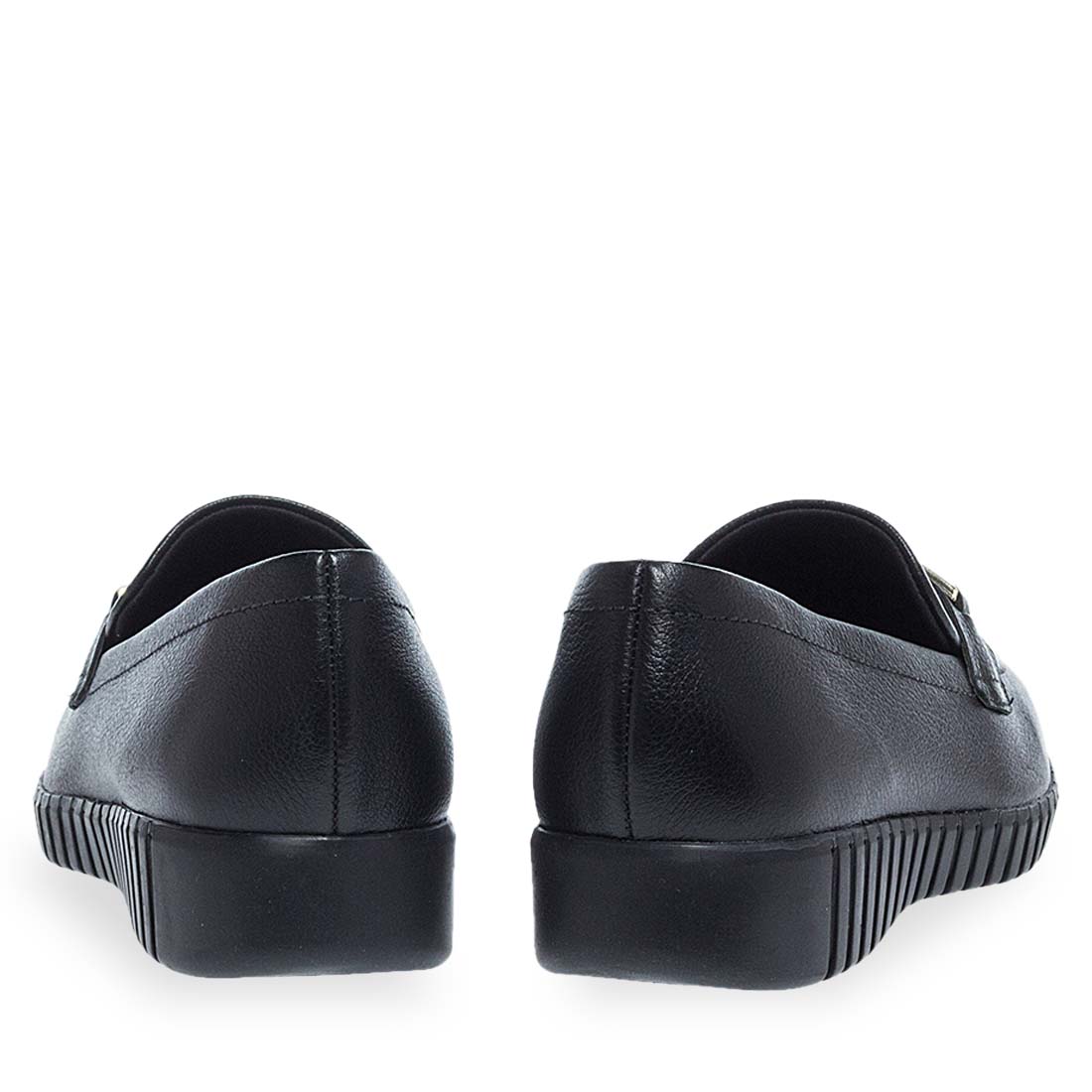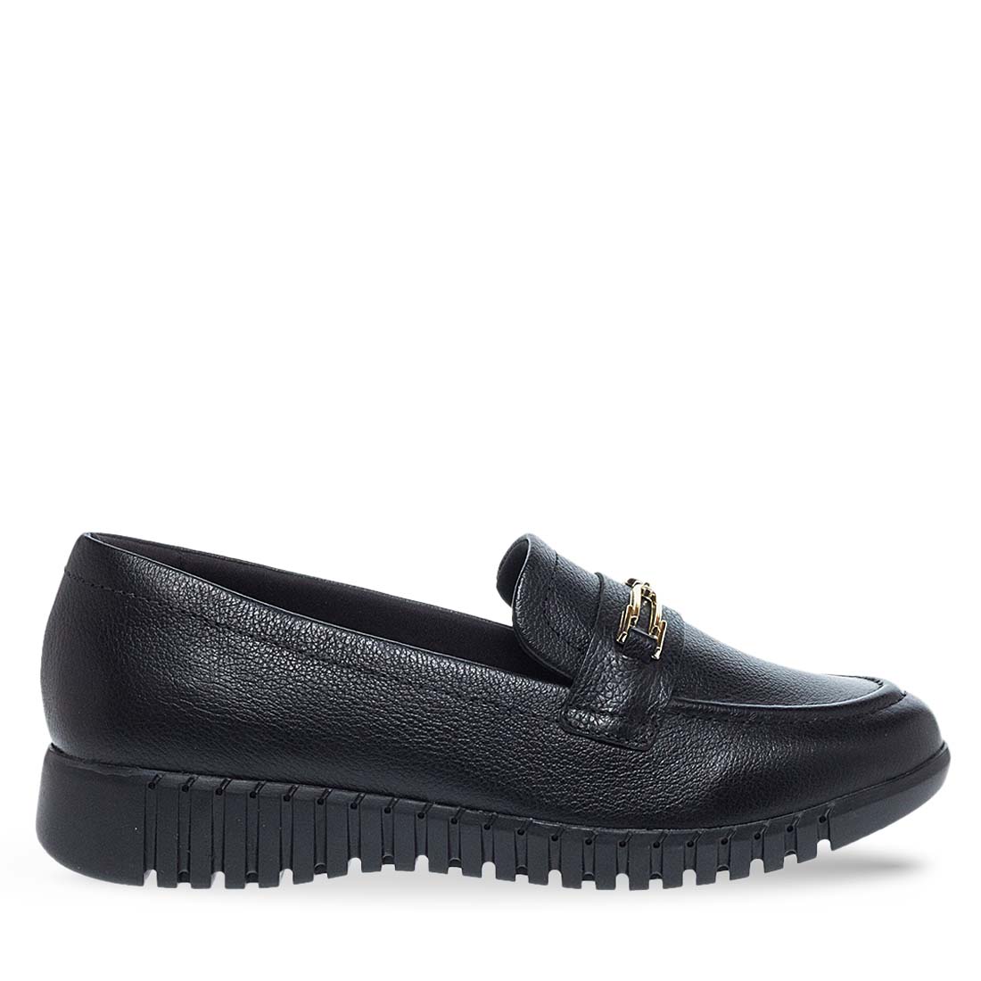 Comfortable moccasins by Comfort Flex. Extremely soft insole and durable stable sole. Available in black color. Detail of chain on the upper.