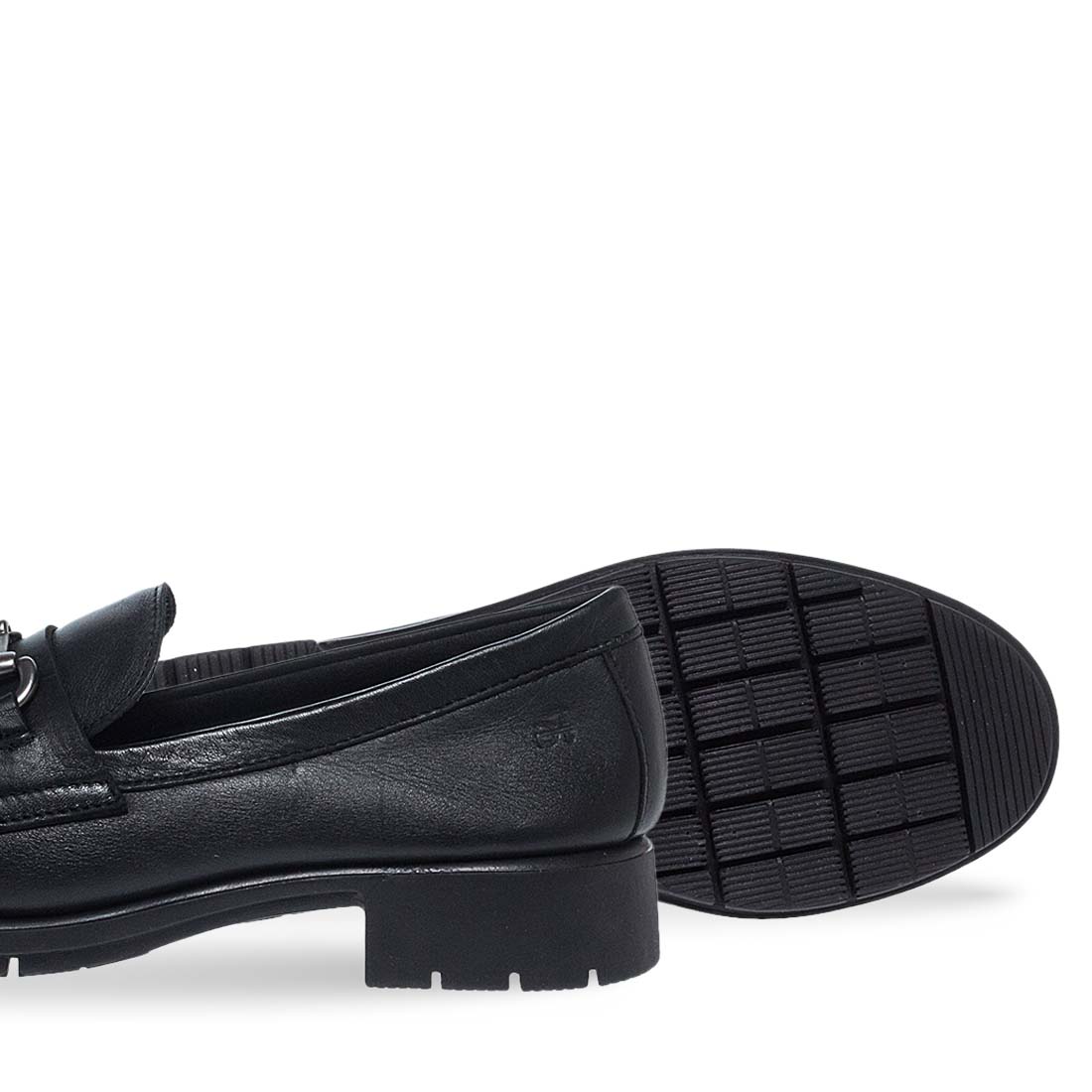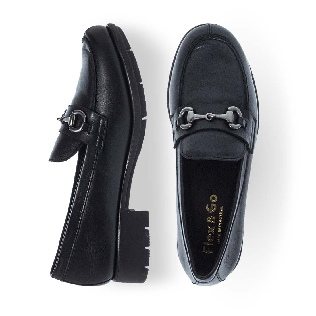 This design will upgrade your look. Leather moccasins for women by Flex&Go. Comfortable insole. Available in black color.Match yours with a mini skirt to add a feminine note in your style. Metallic detail on the upper.