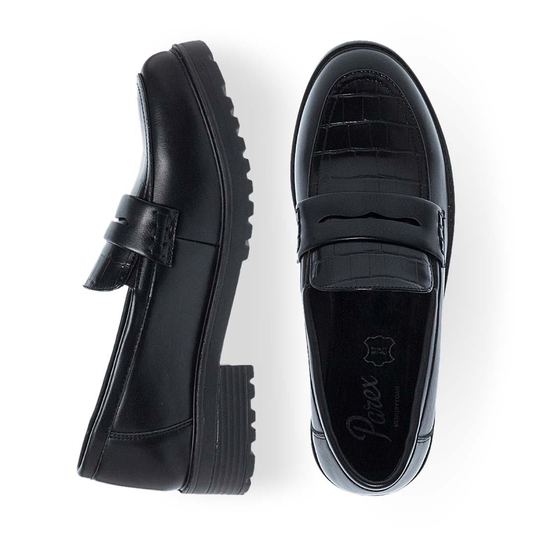 Women''s moccasins by Parex. Women’s black moccasins by Parex with croco detail on the upper and a comfortable sole. Ideal for casual chic looks. "Infuse" technology. Embeds lightness, comfort, and durability into the shoe''s core, ensuring flexibility and performance are integral to its design.