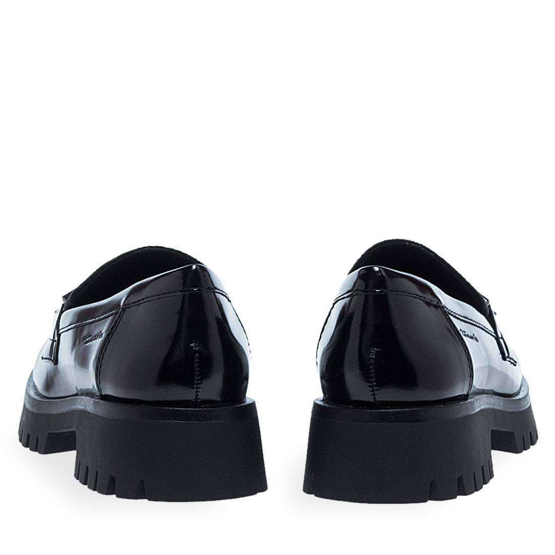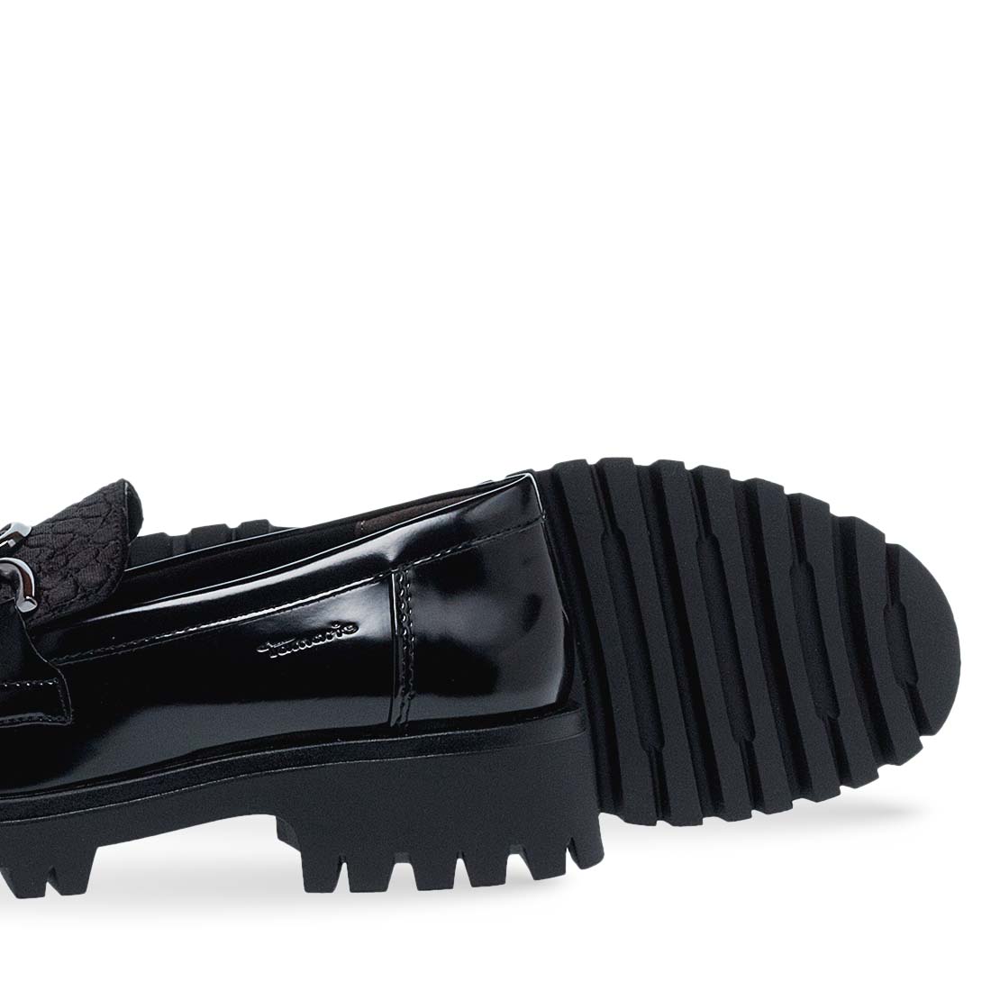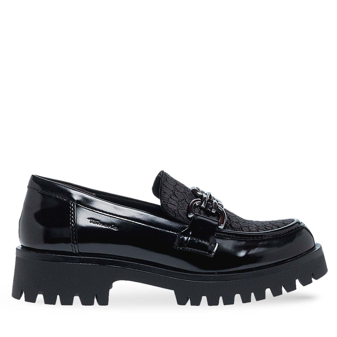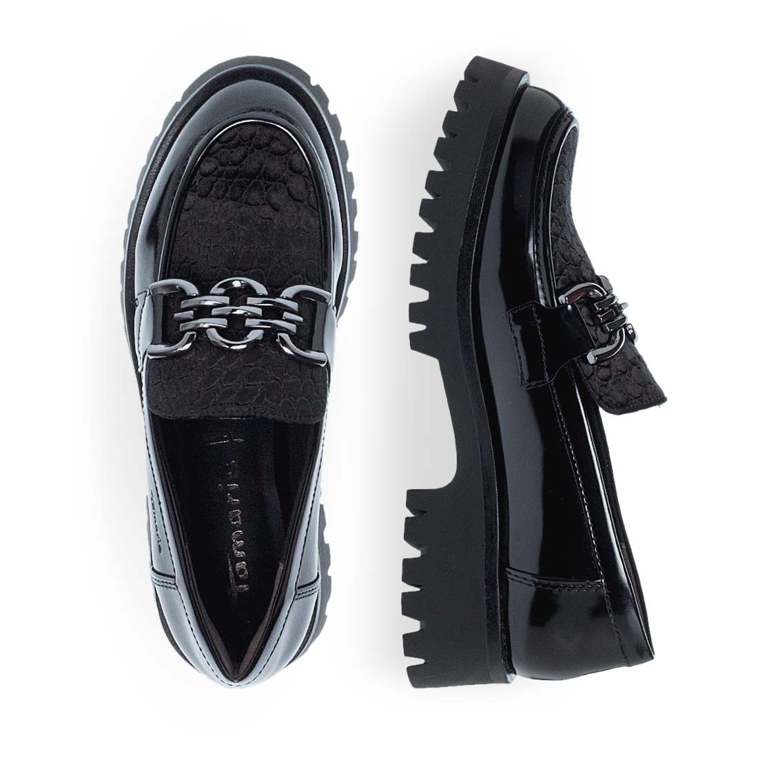 Women''s moccasins by Tamaris. Patent moccasins with embossed texture, chain detail and lug sole for bold fashion looks.