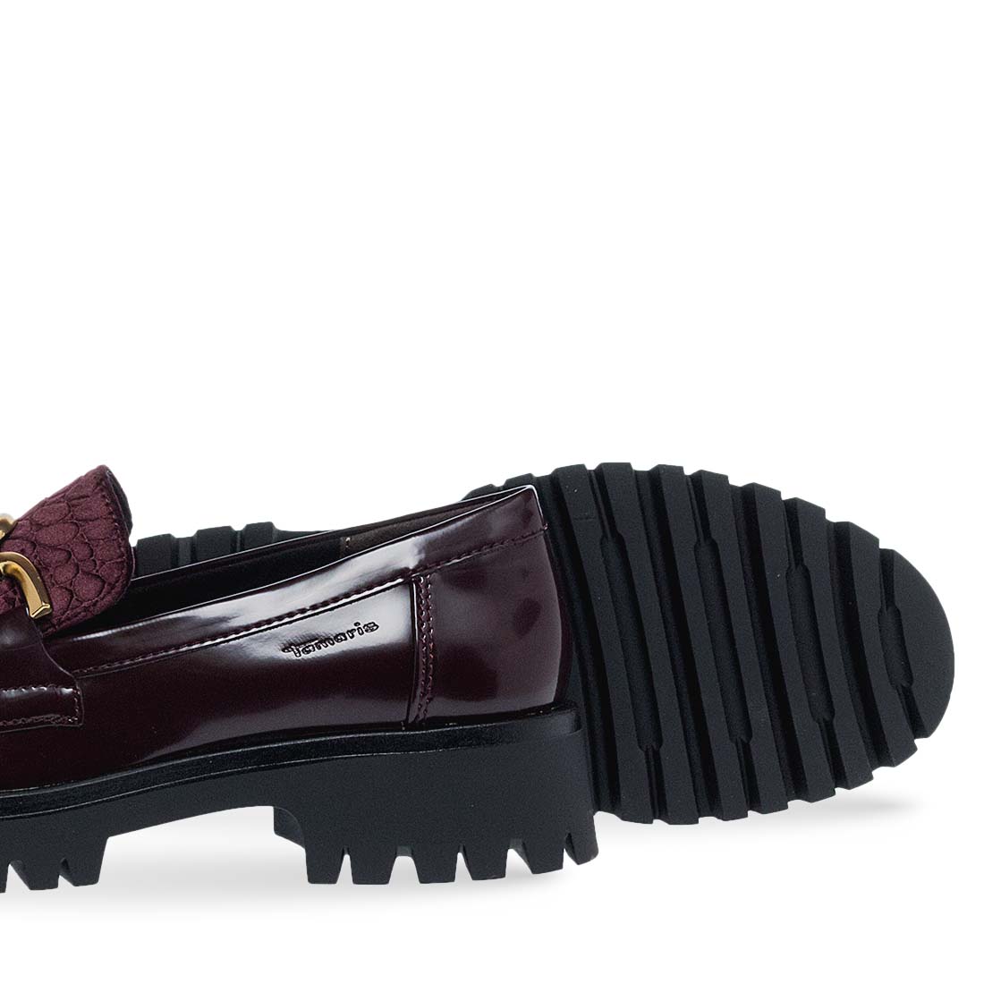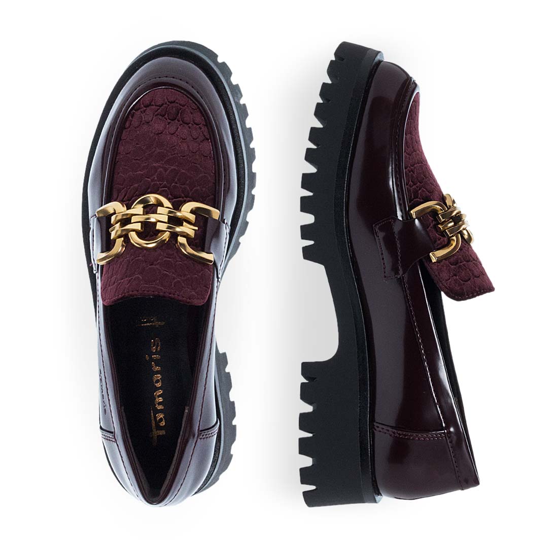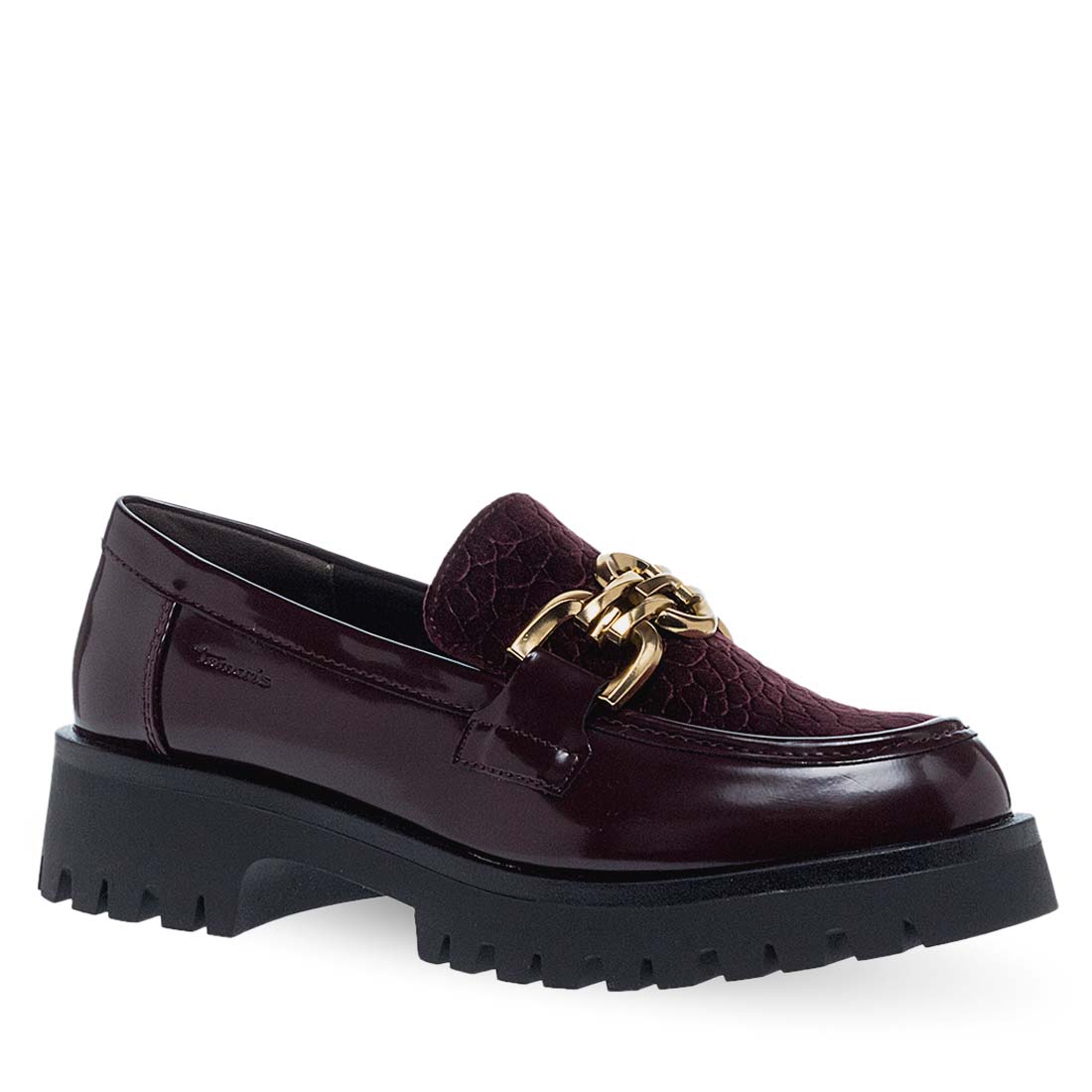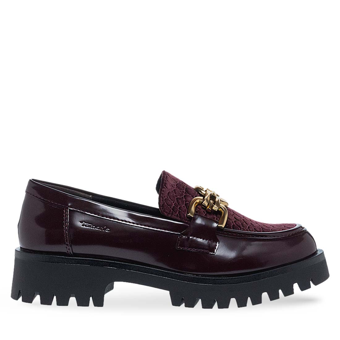 Women''s moccasins by Tamaris. Women’s moccasins in burgundy with an eye-catching gold chain. These moccasins stand out for their chunky sole and comfortable fit. Ideal for both casual and more polished outfits, moccasins add a luxurious touch to any look.
