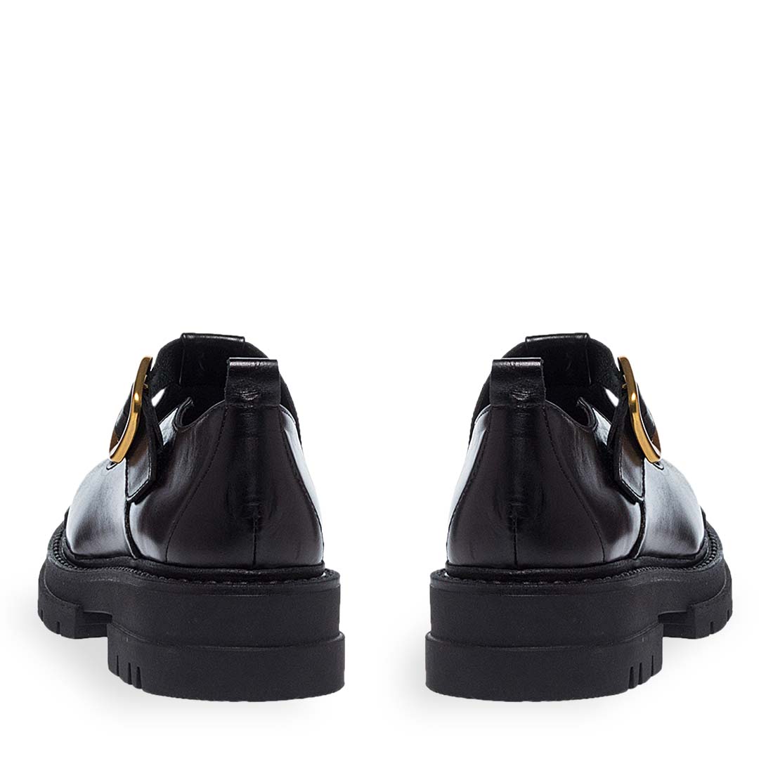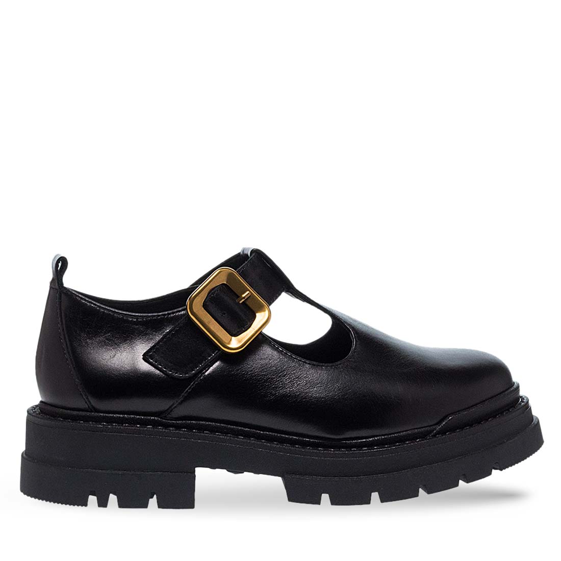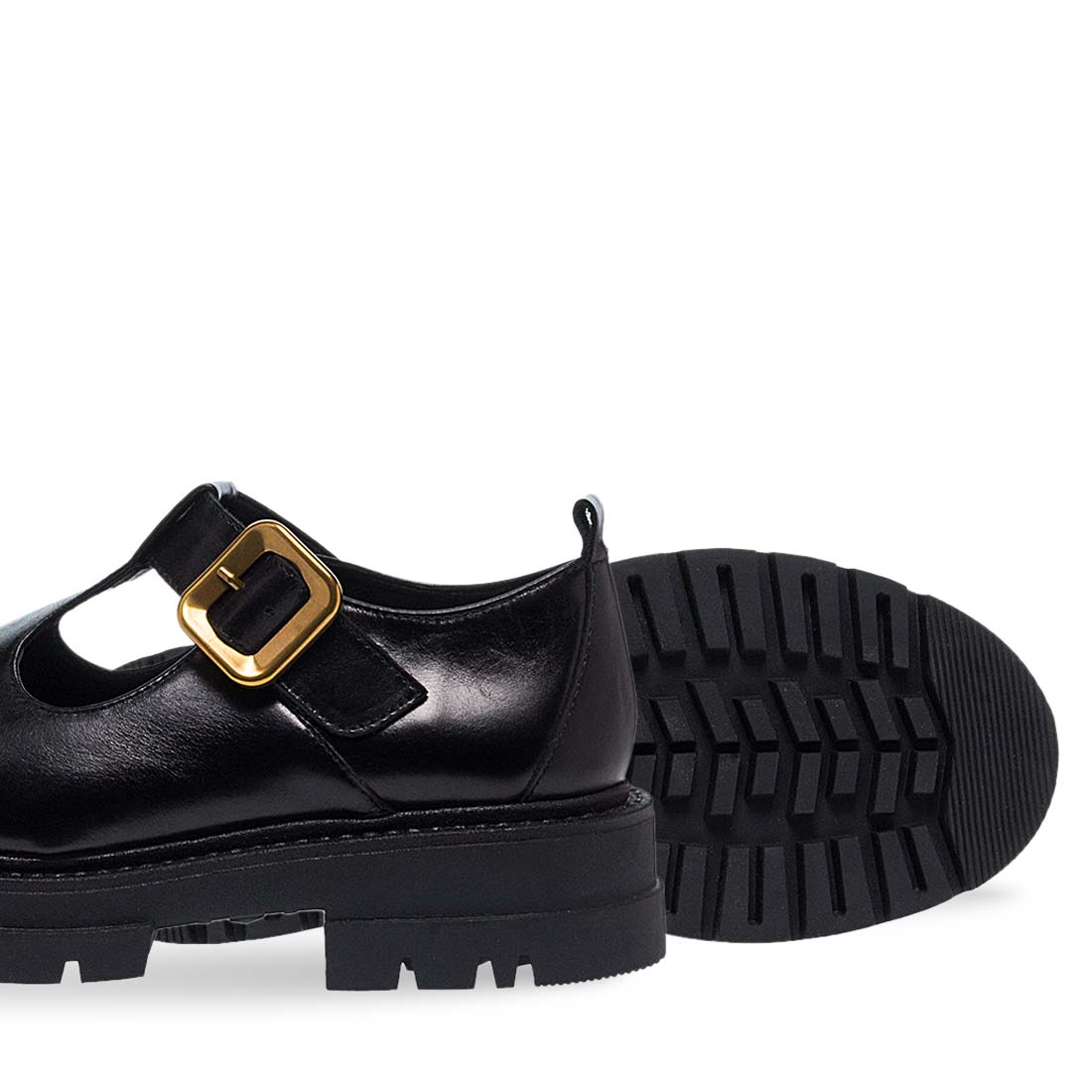 Women''s leather Mary Jane shoes by Maison Minrelle. Black Mary Jane shoes with chunky sole and gold buckle.