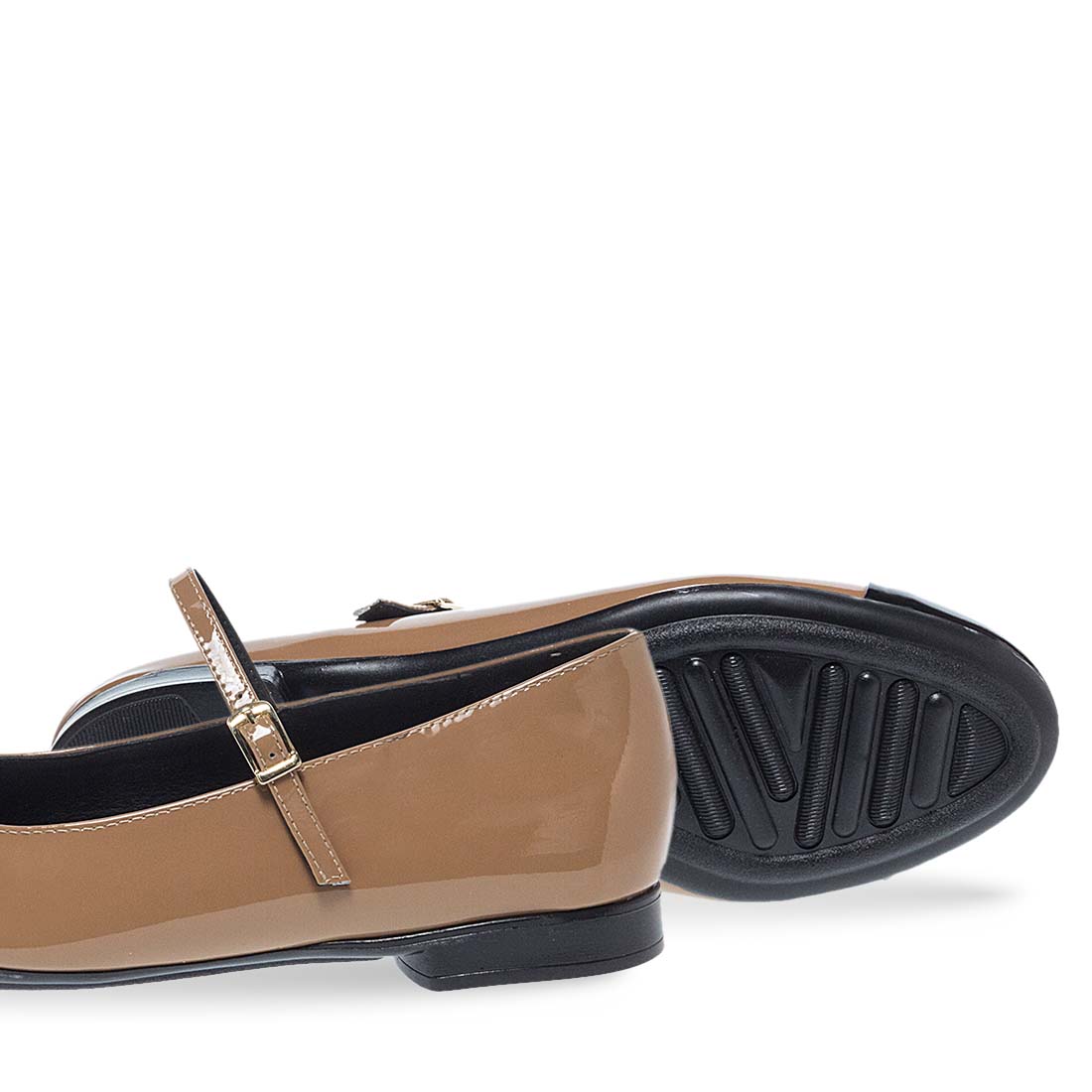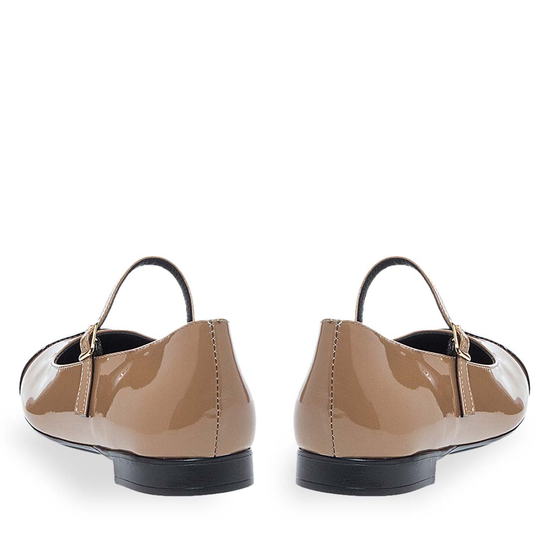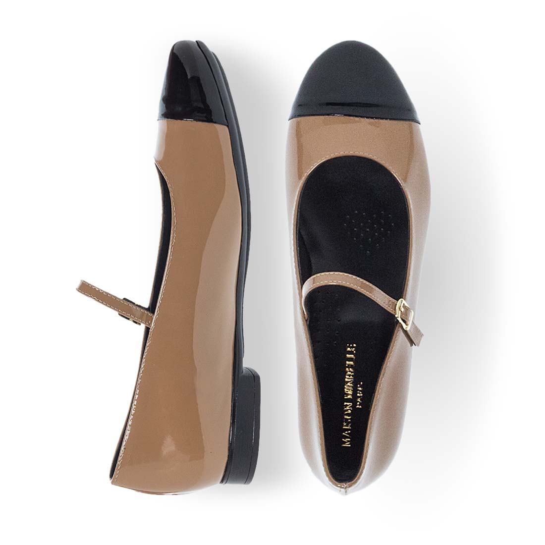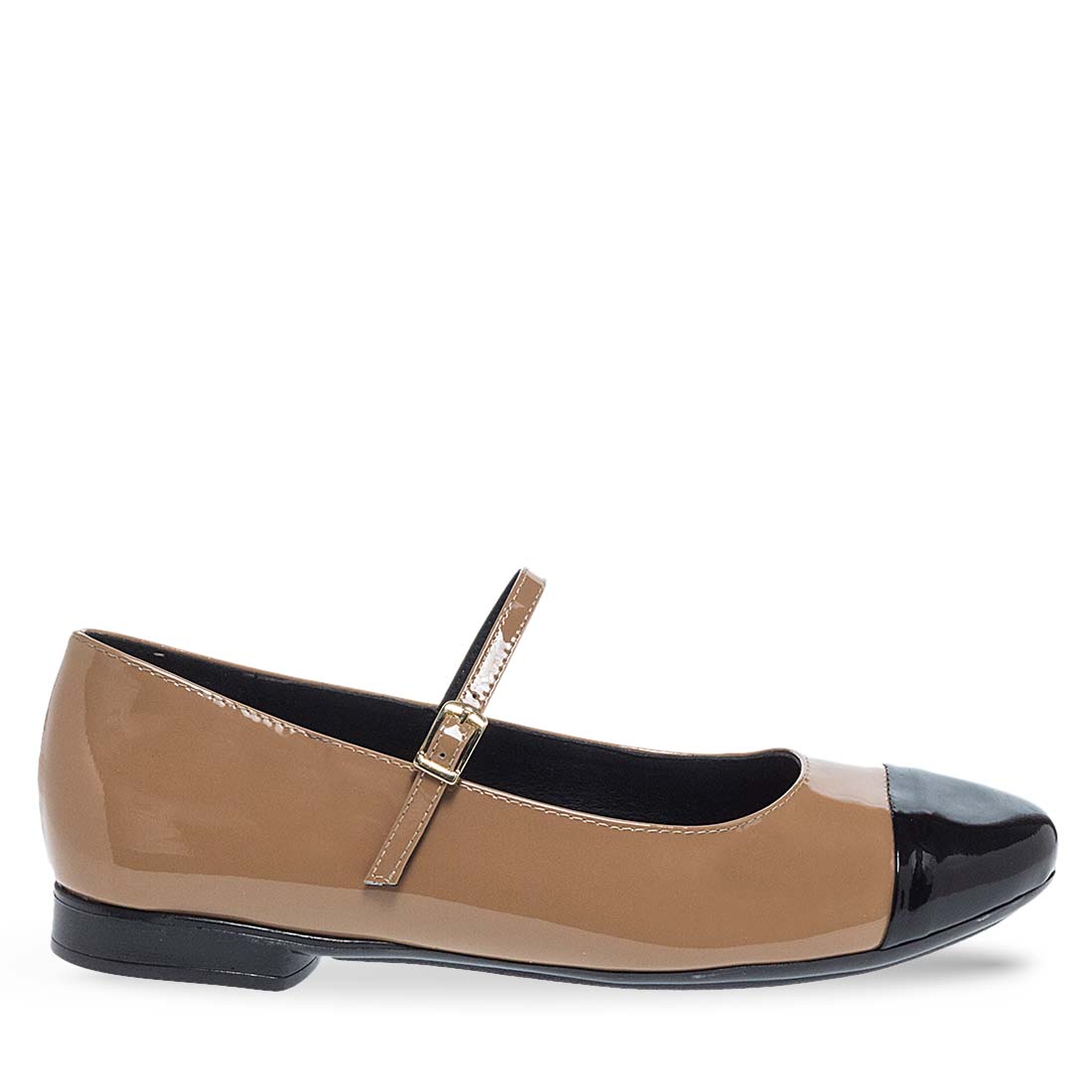 Elegant Mary Jane ballet flats with adjustable strap by Maison Minrelle new collection. This design comes in beige color with black patent round detail. Flat sole for all day comfort.