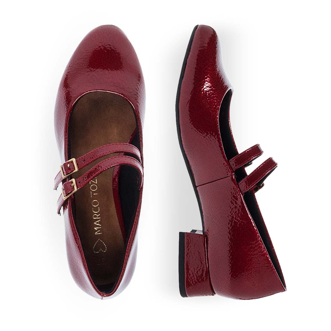 Women''s mary jane shoes by Marco Tozzi. Women’s Marco Tozzi Mary Jane shoes in red patent leather with double strap and metallic buckle. Stylish and comfortable, they add a bold touch to your look. Perfect for casual chic outfits or elegant evening wear.