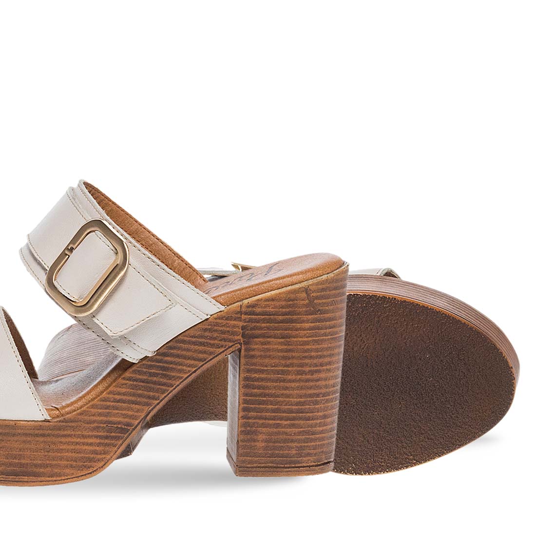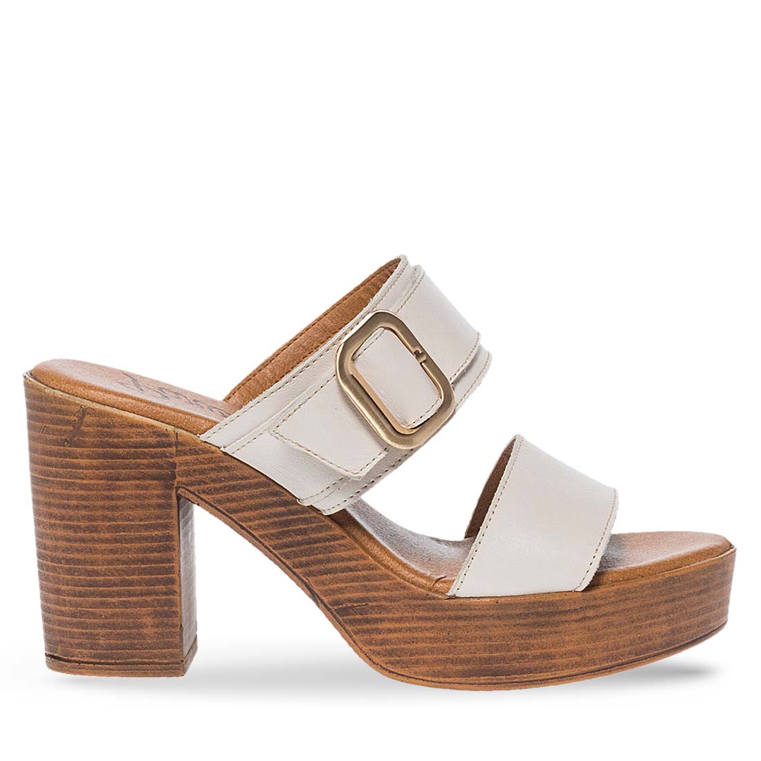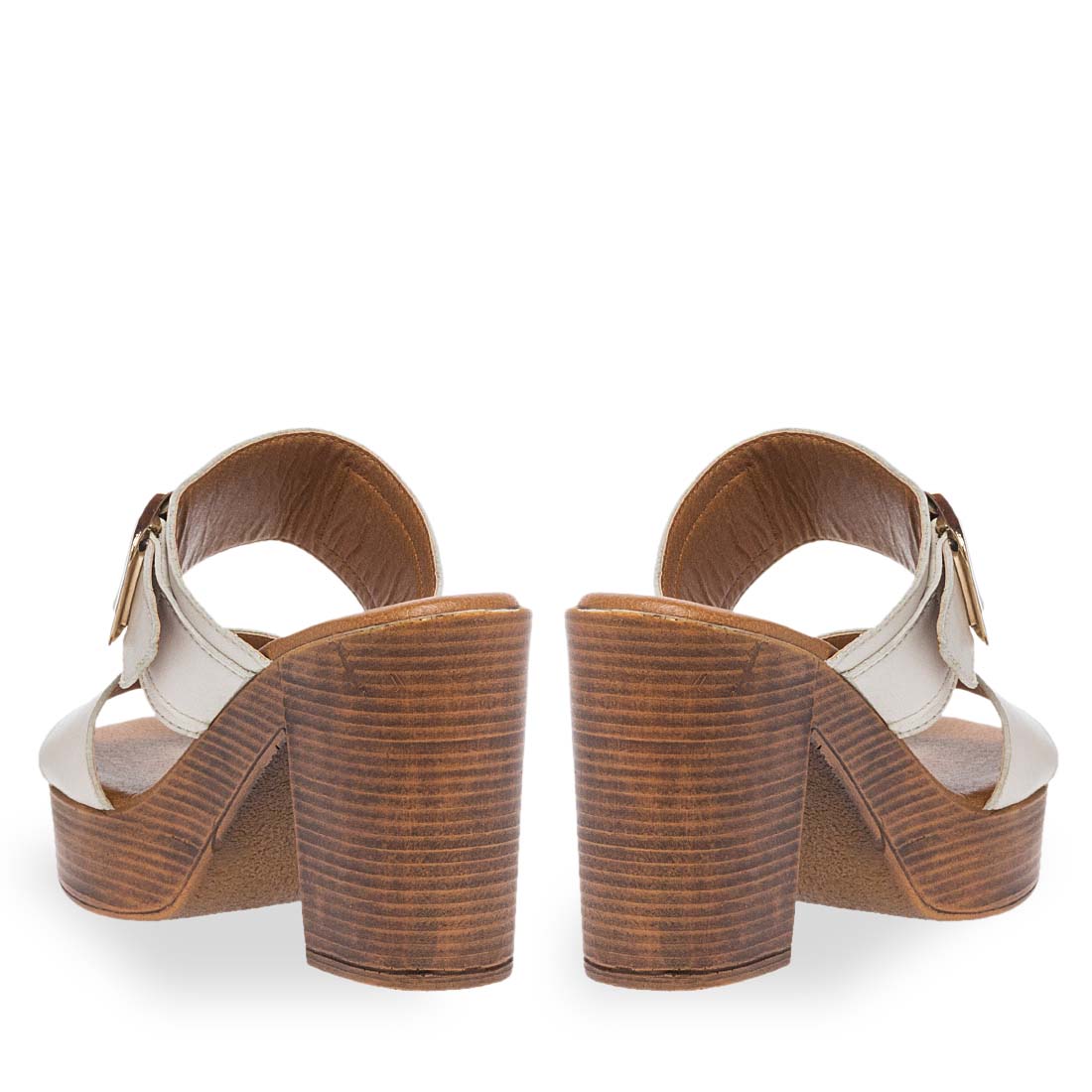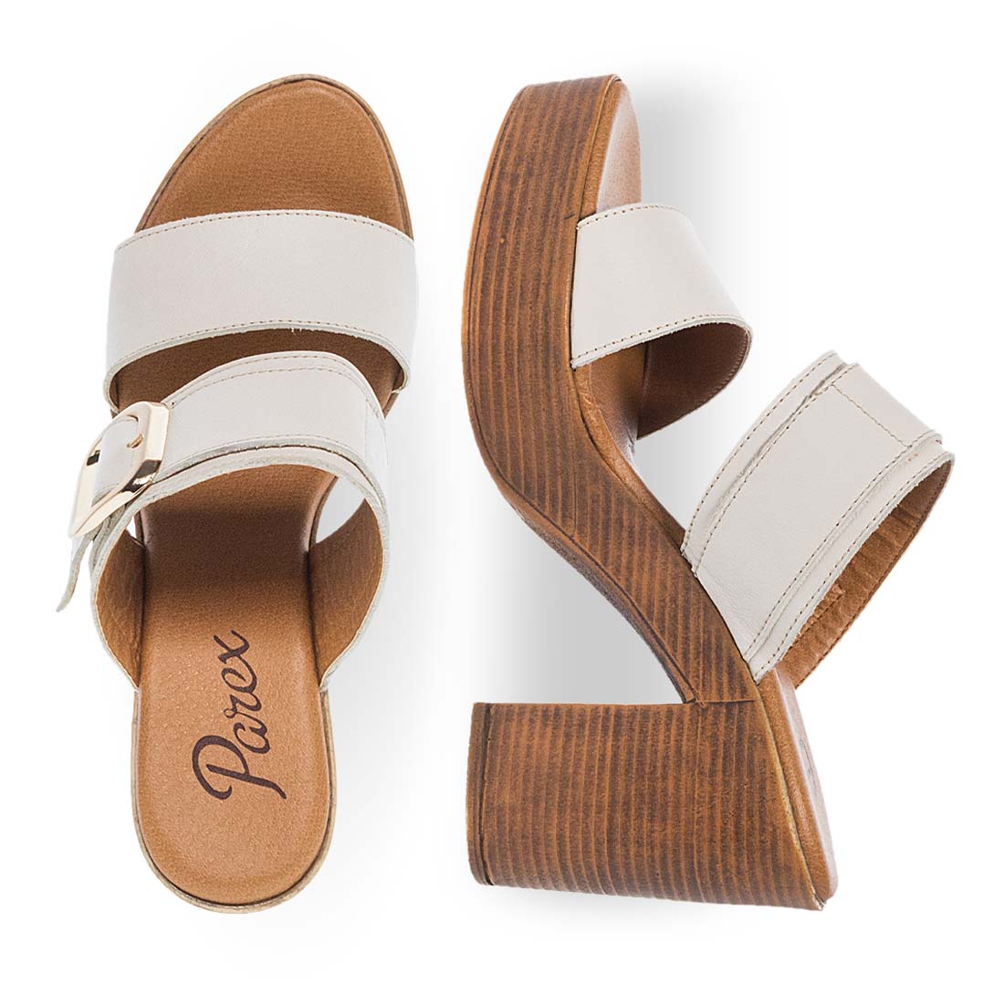 If you want to be chic all summer choose these leather mules by Parex. 2 straps on the upper, in one golden buckle fastening on the side. Comfortable leather insole and durable sole with high block heel. Available in black, ecru and taupe color so you can combine them with your entire wardrobe.
