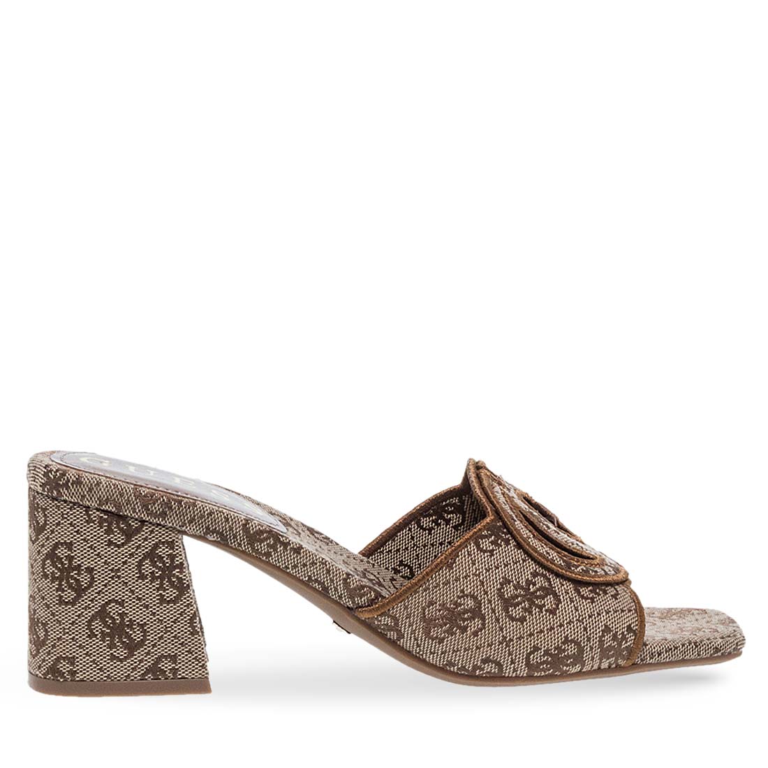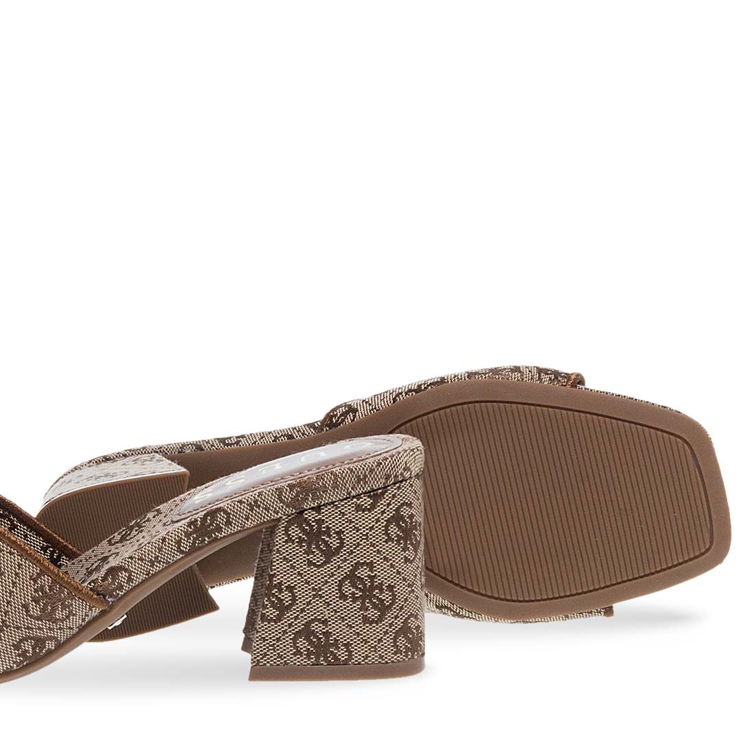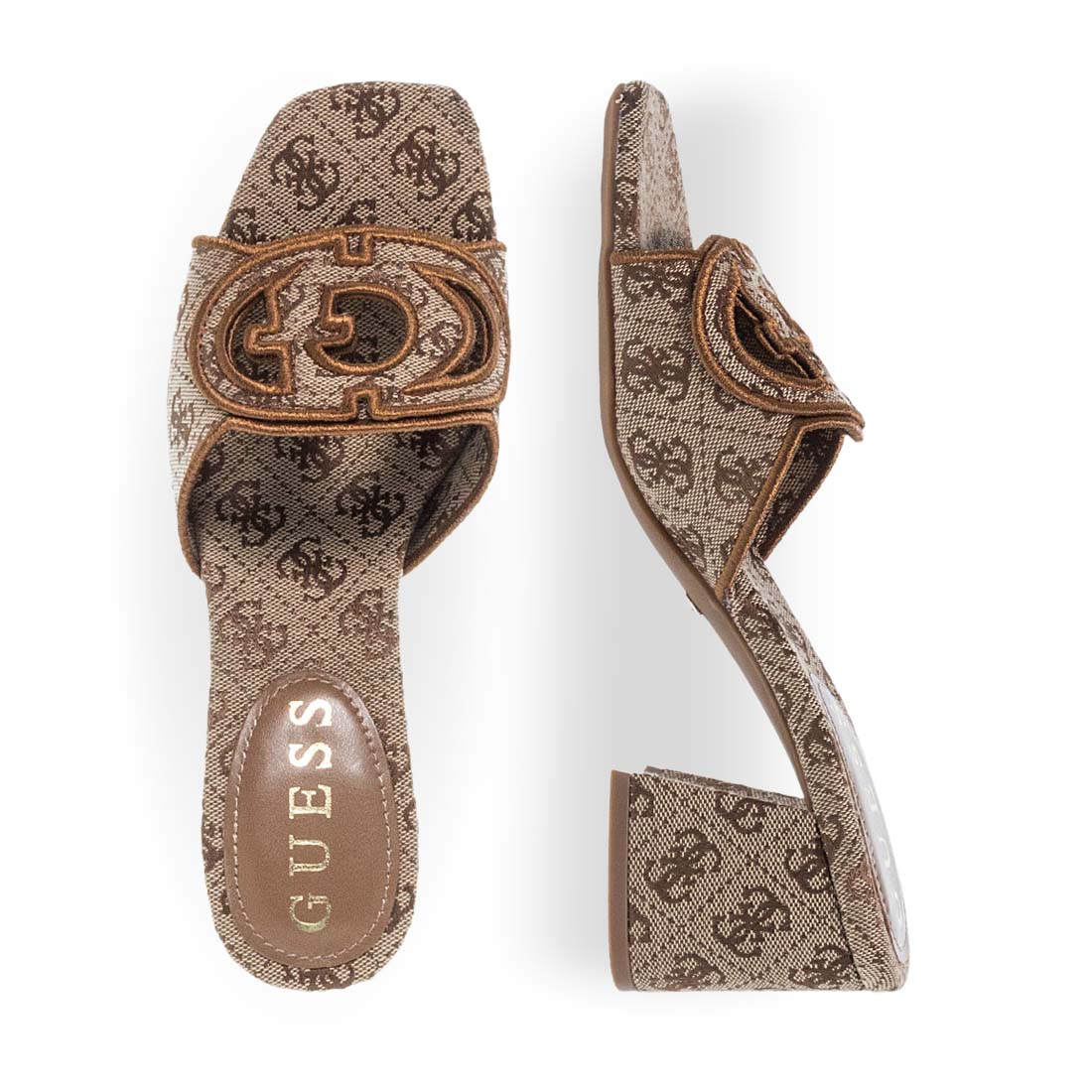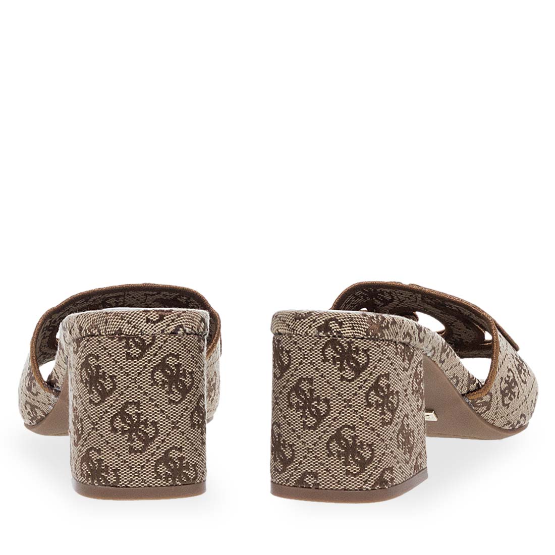 Women''s mules by Guess. Women''s heeled mules by GUESS with logo print in brown hue, ideal for elegant appearances.