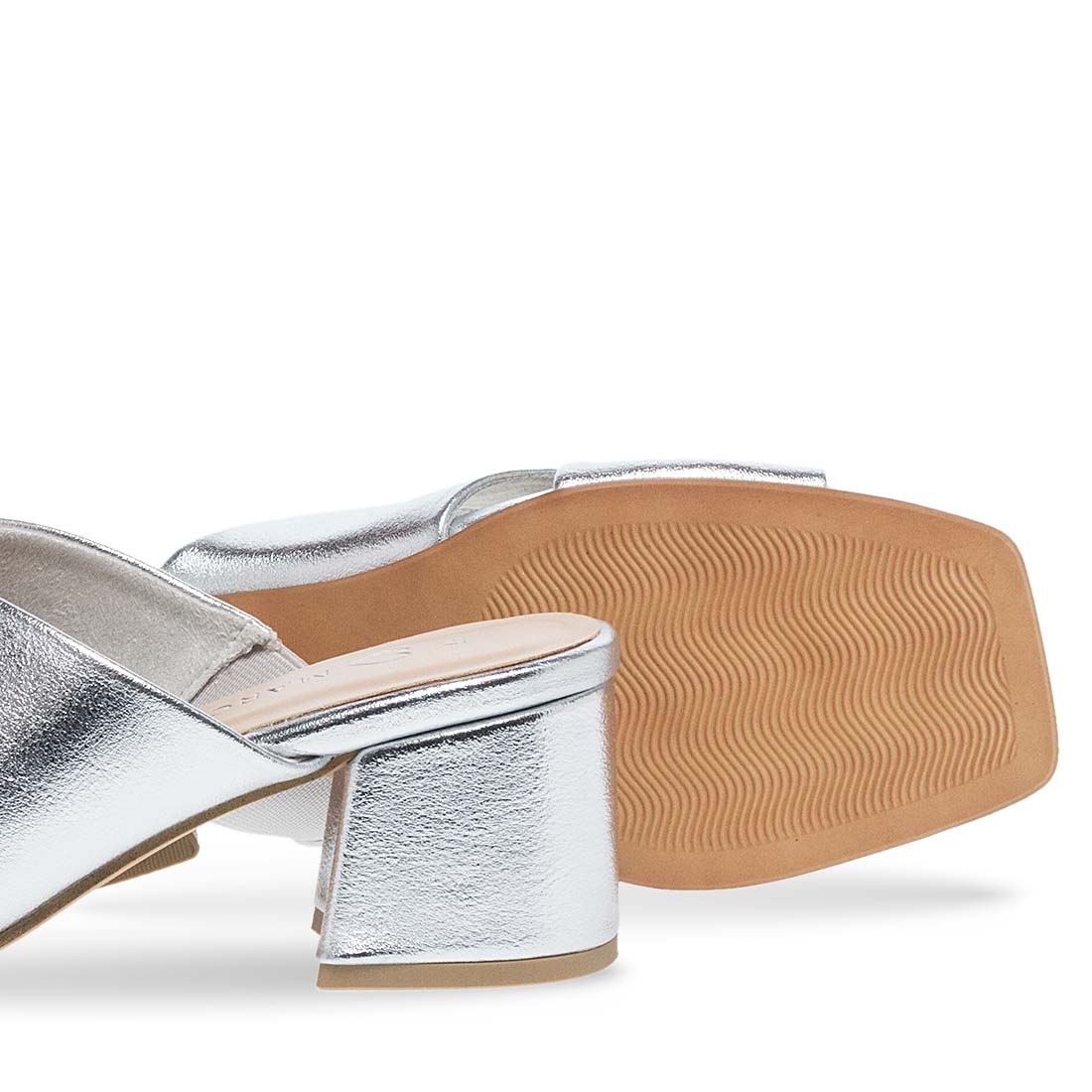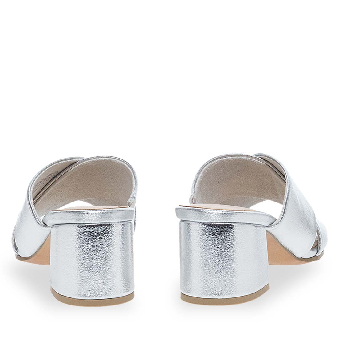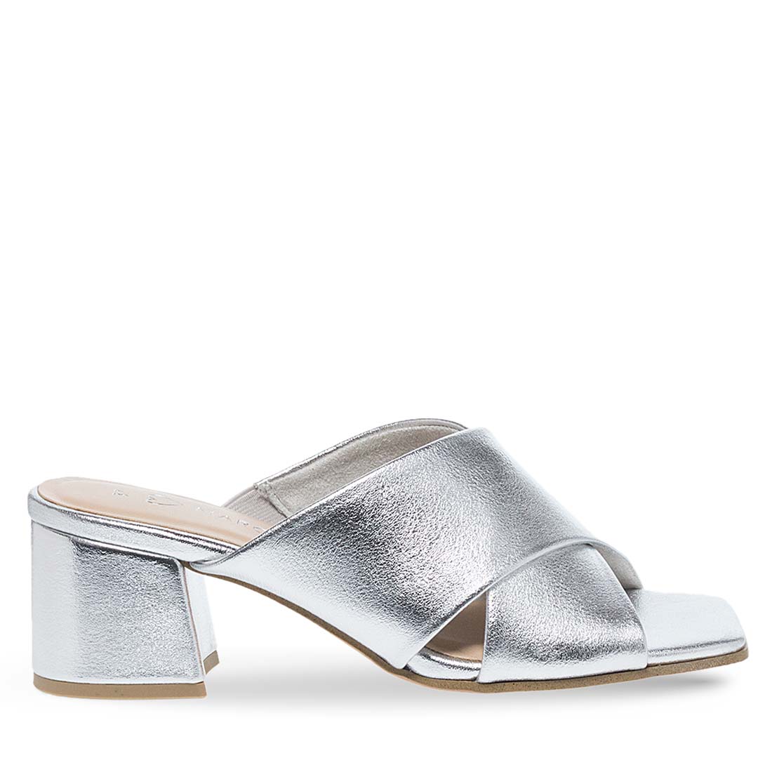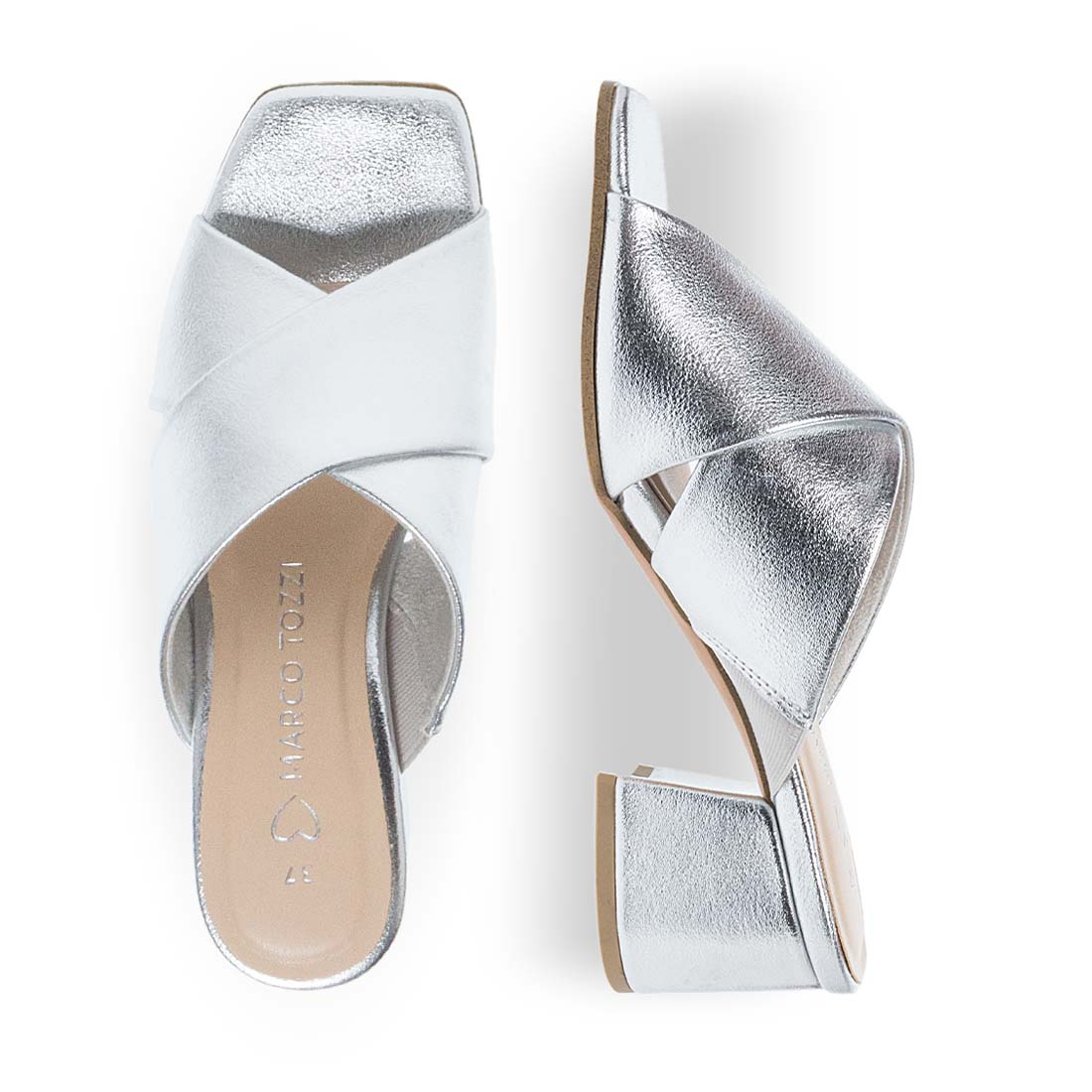 Crossed modern mules by Marco Tozzi. Mid heel. Soft insole.Take stylish and comfortable steps in these summer mules. Easy application. Available in silver color.