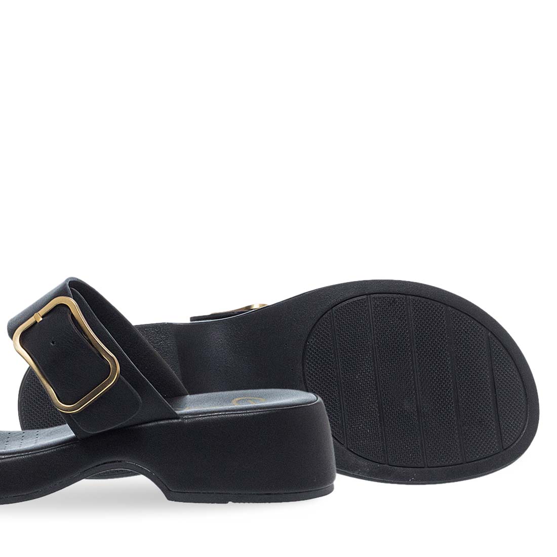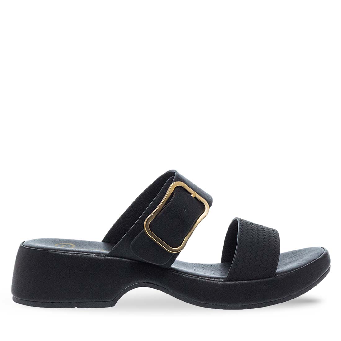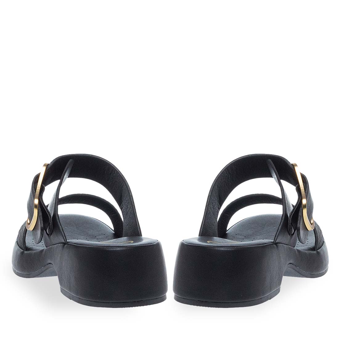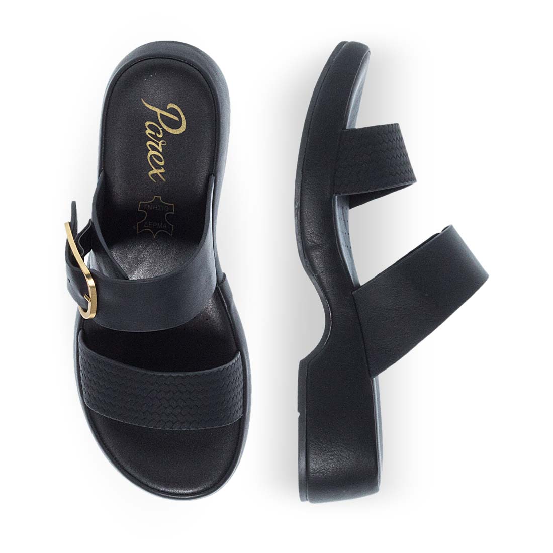 Add these leather mules by Parex in black color to your collection this summer. 2 straps on the upper with gold buckle fastening on the side. Super soft leather insole and firm sole with small block heel.