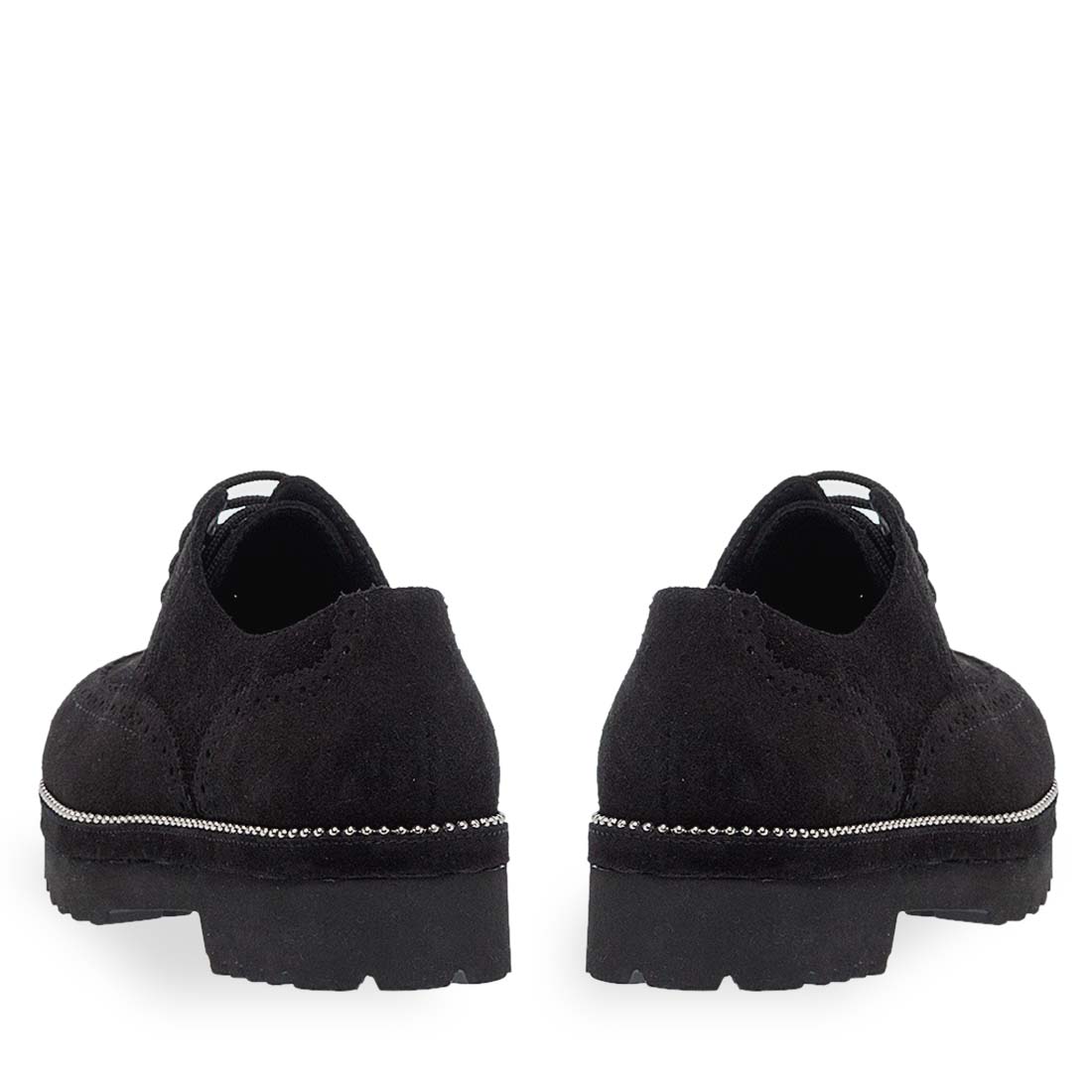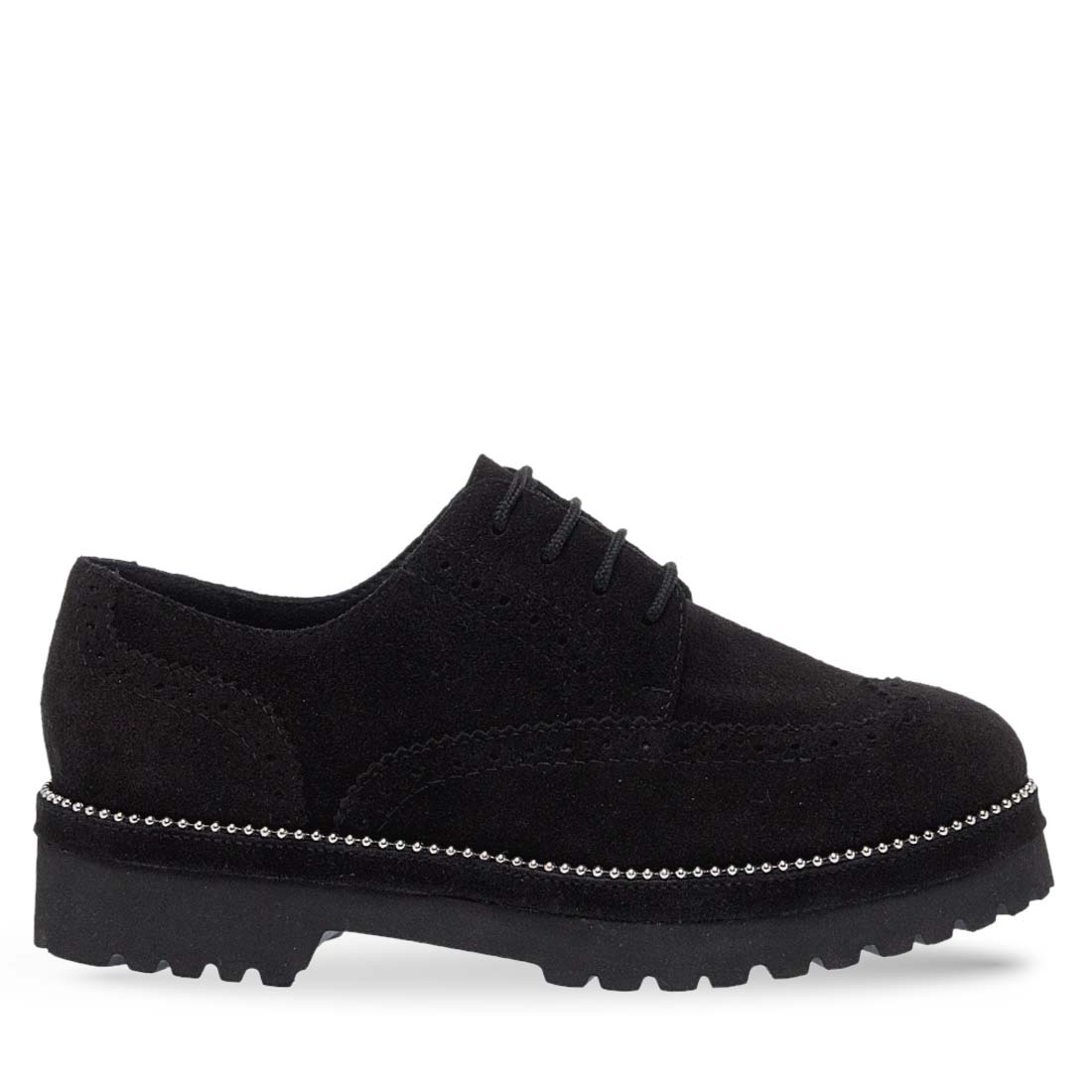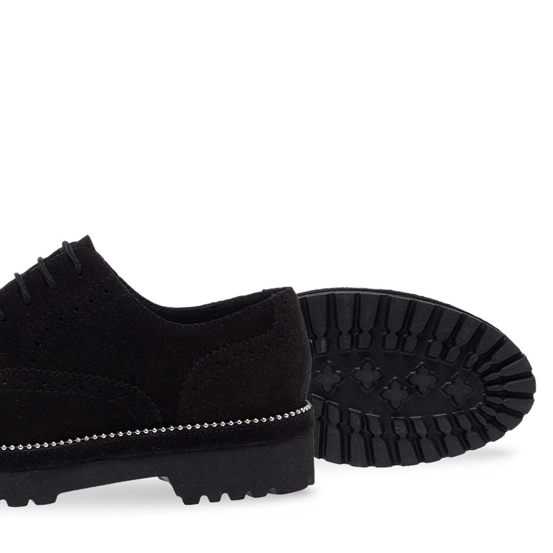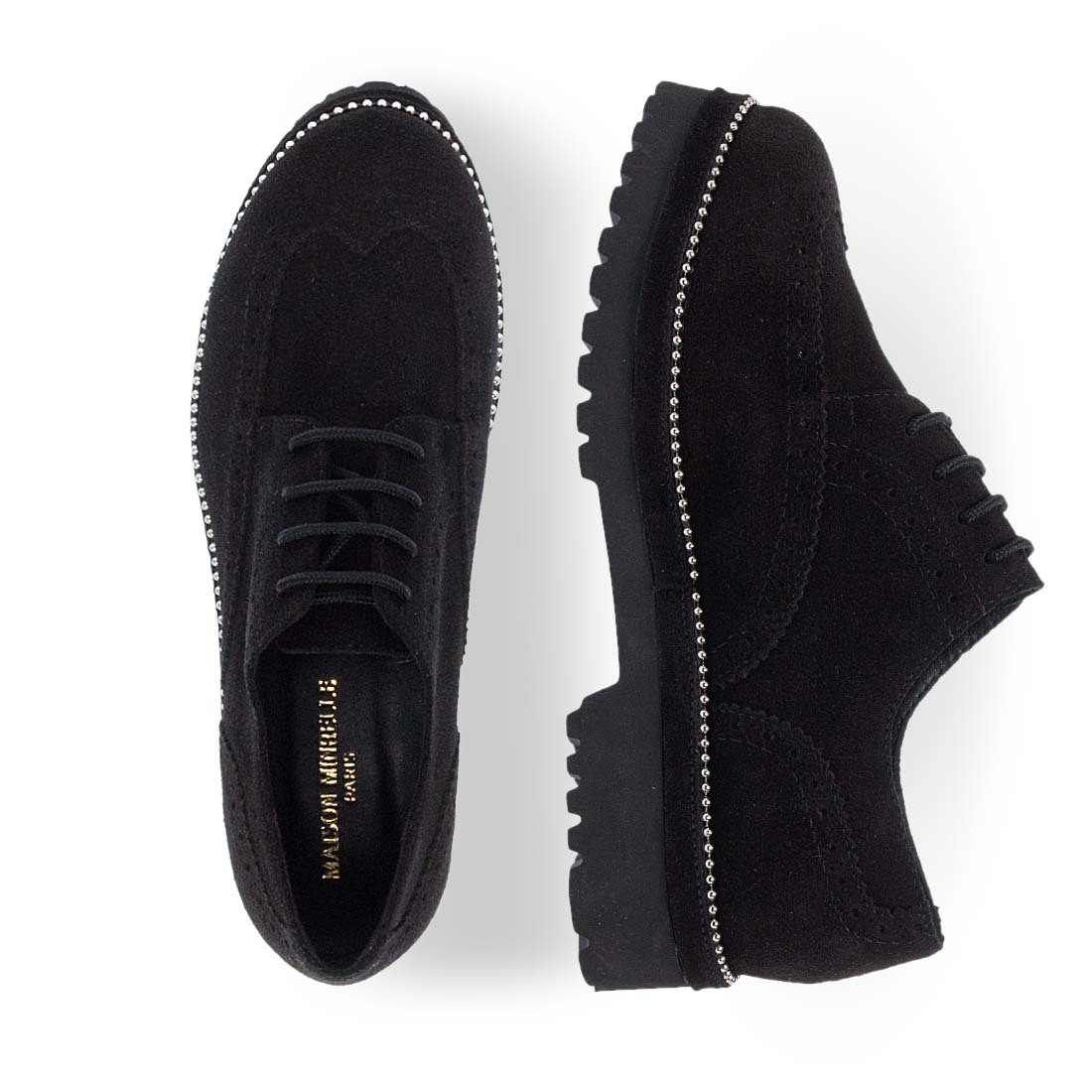 Women''s leather oxford shoes by Maison Minrelle. Women’s Maison Minrelle suede leather oxford shoes in black and brown, accented with metallic trim. Effortless sophistication and comfort.
