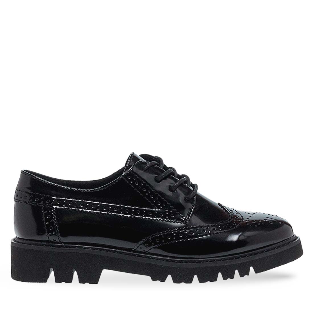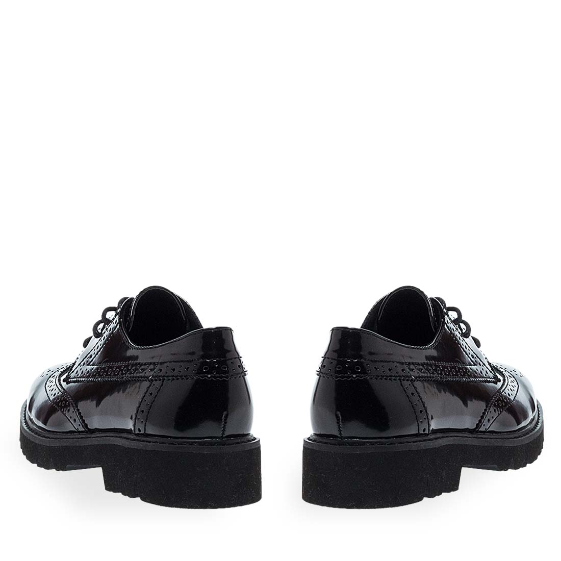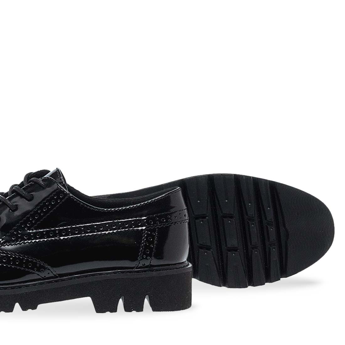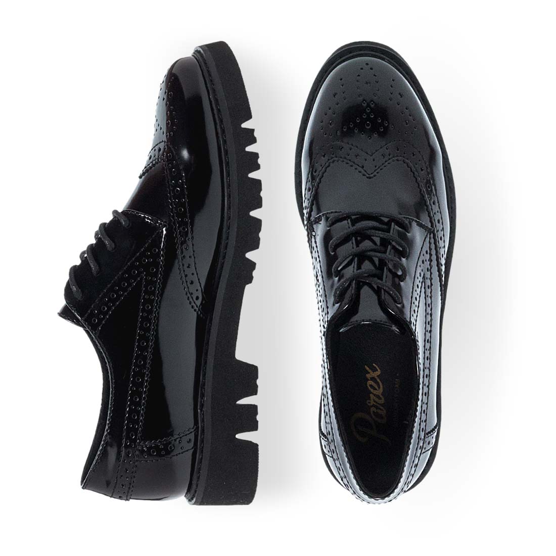 Women''s oxford shoes by Parex. Women’s black patent oxford shoes with lug sole and brogue details. Elegant and modern style.