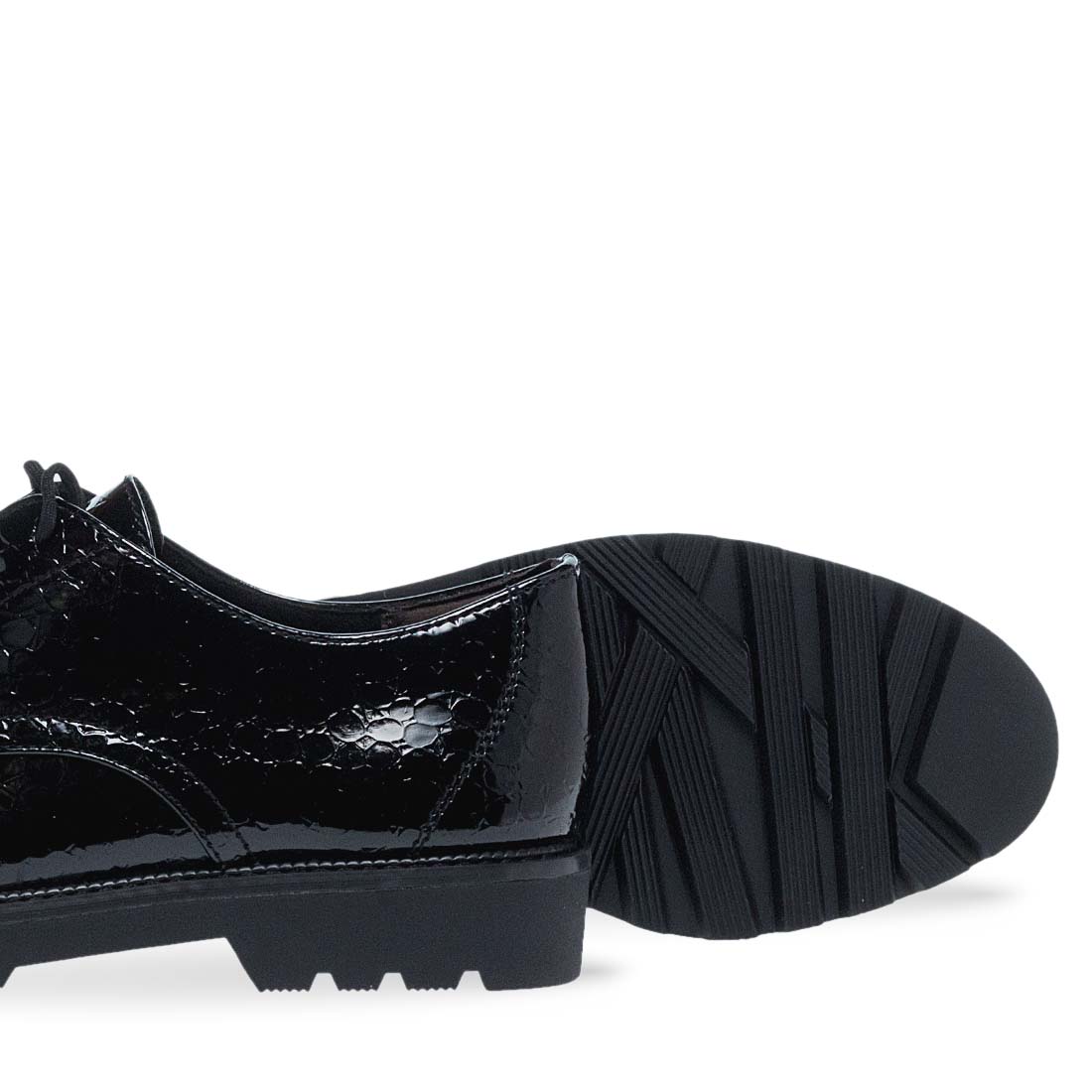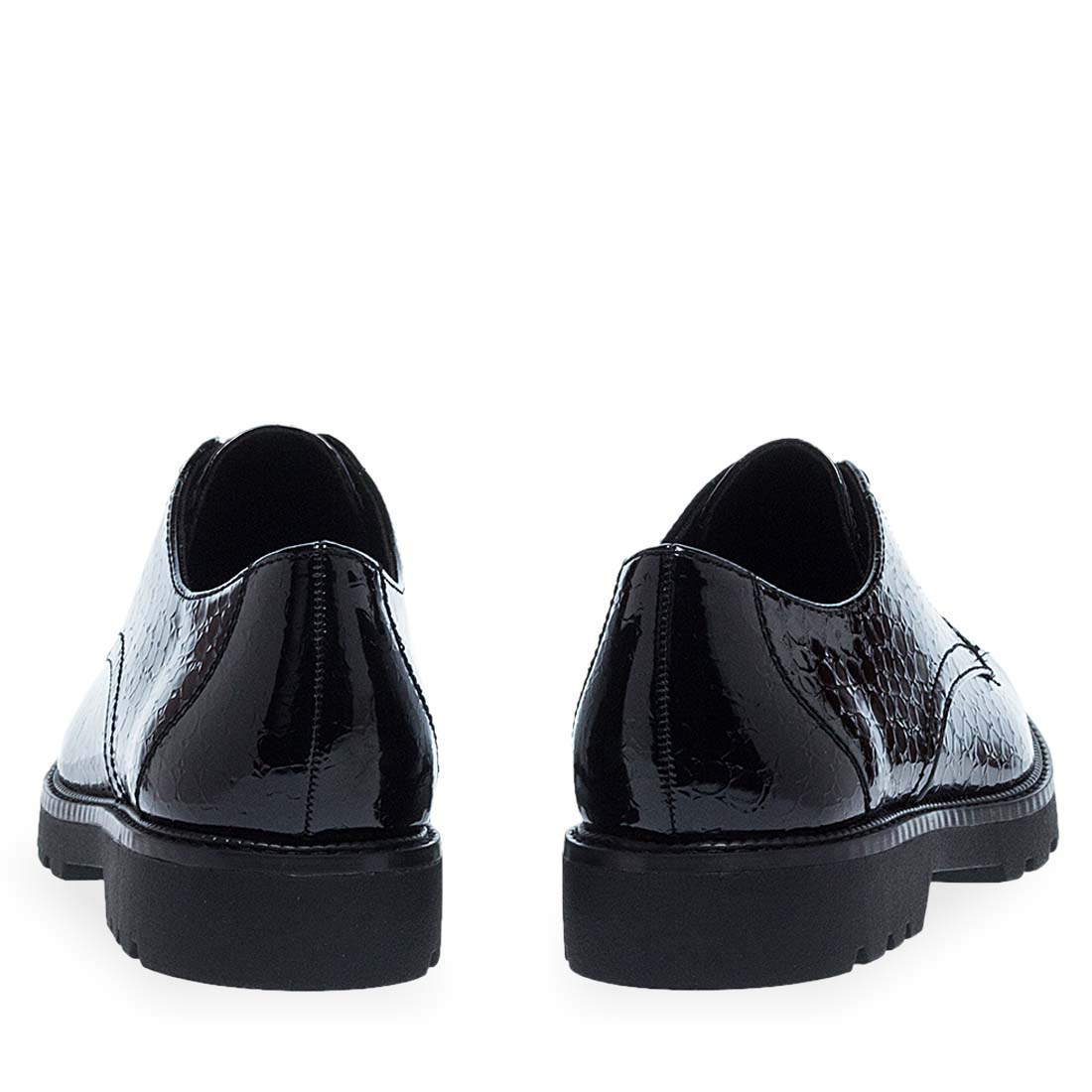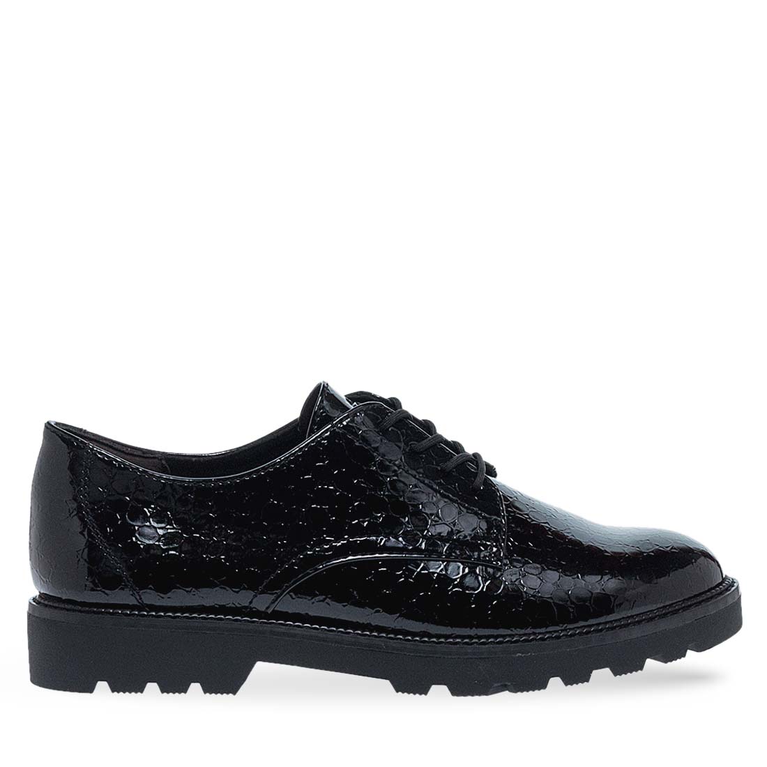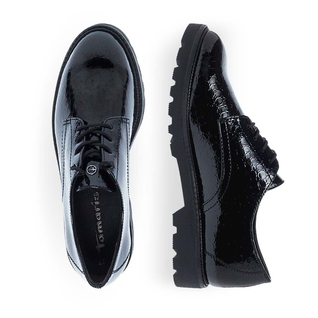 Women''s oxford shoes by Tamaris. Women’s black oxford shoes with patent finish and embossed design. This oxford shoe offers stability and comfort thanks to its anti-slip sole. Ideal for elegant office looks or evening outings, the oxford combines classic style with modern details.