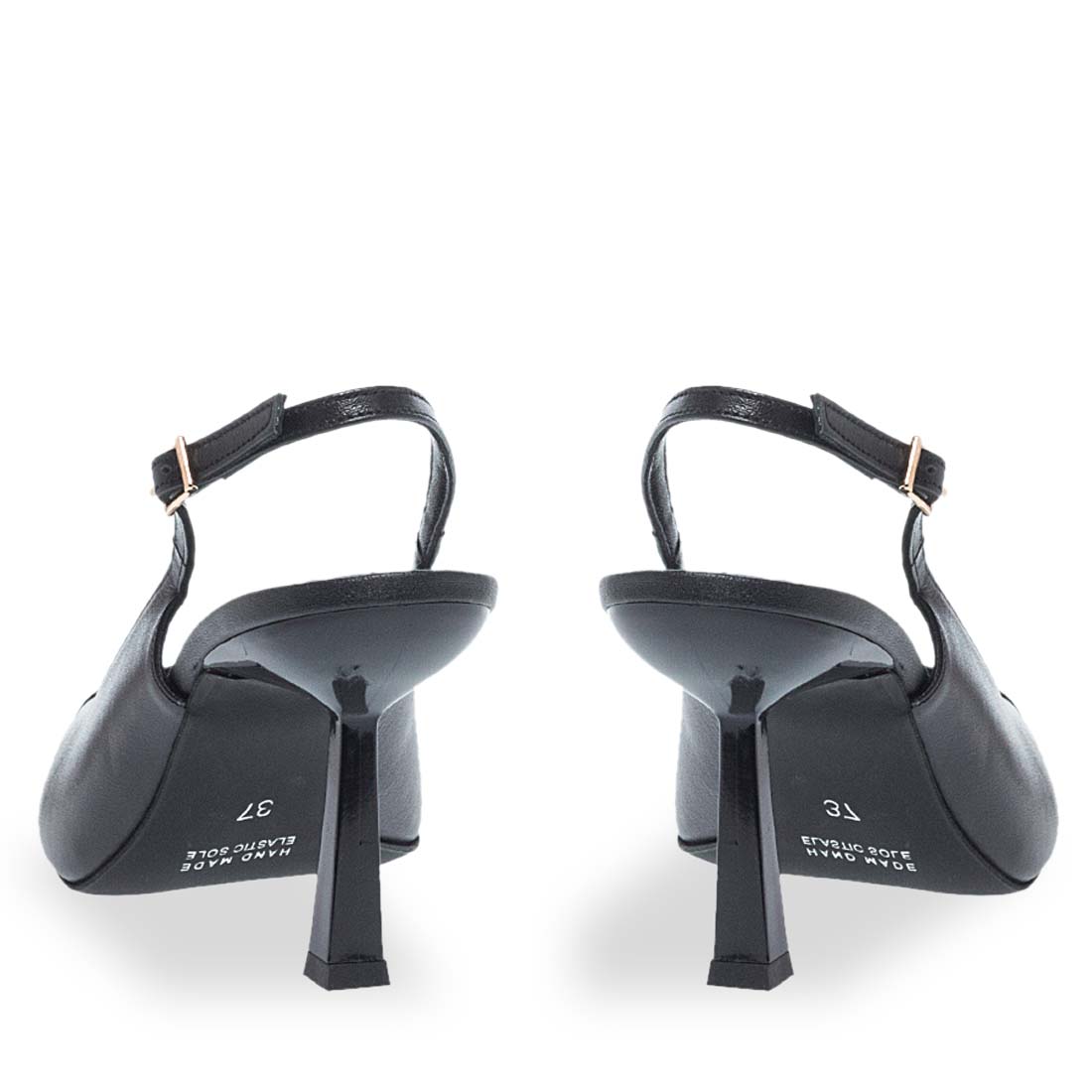 Slingback black pumps by Maison Minrelle. Stiletto heel. Modern design. A chic pair to style with your office outfits. Buckle strap fastening.