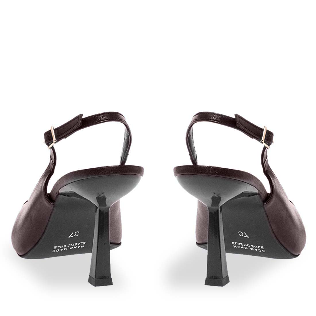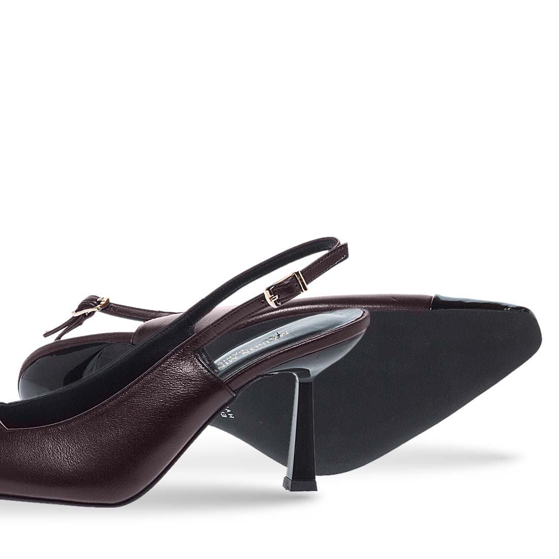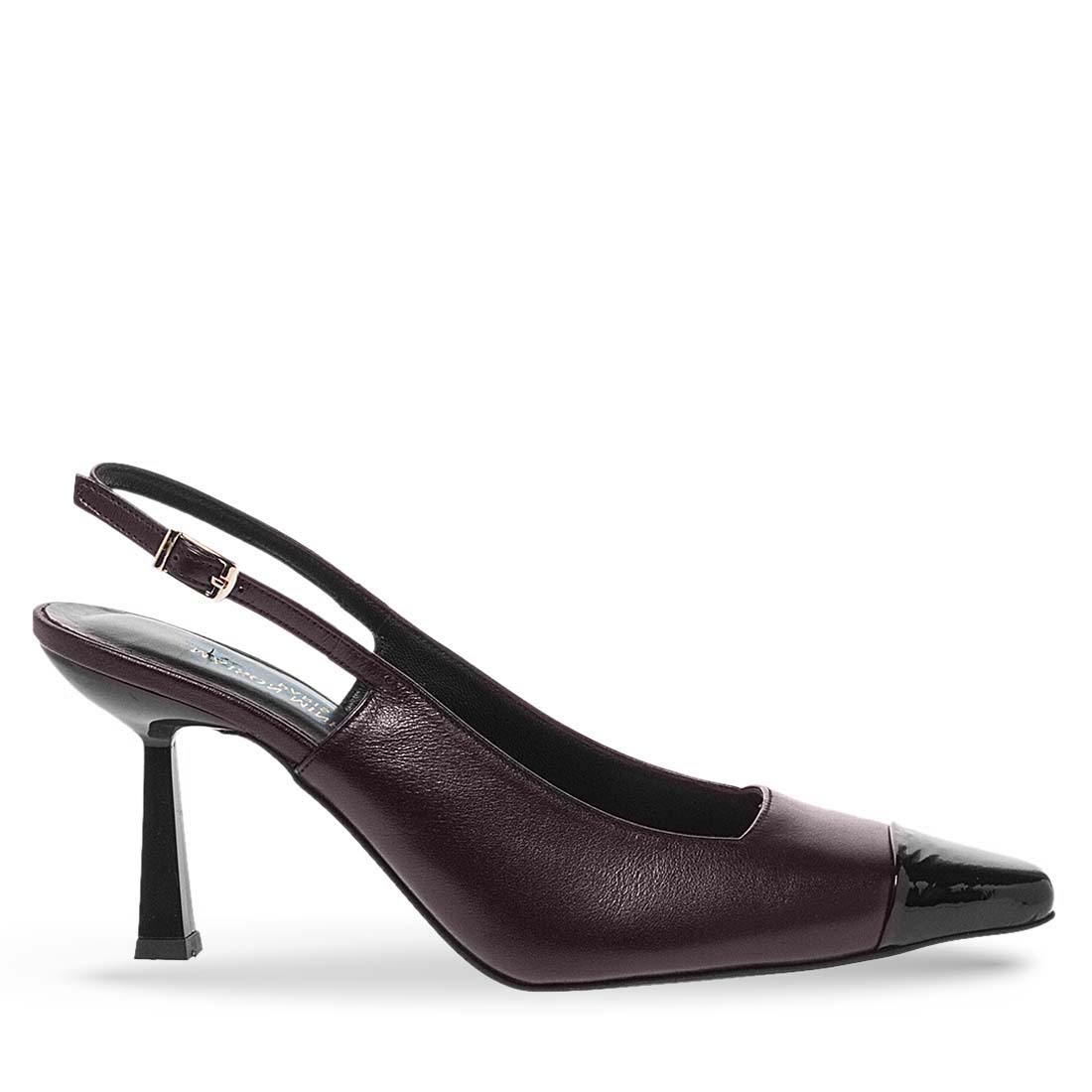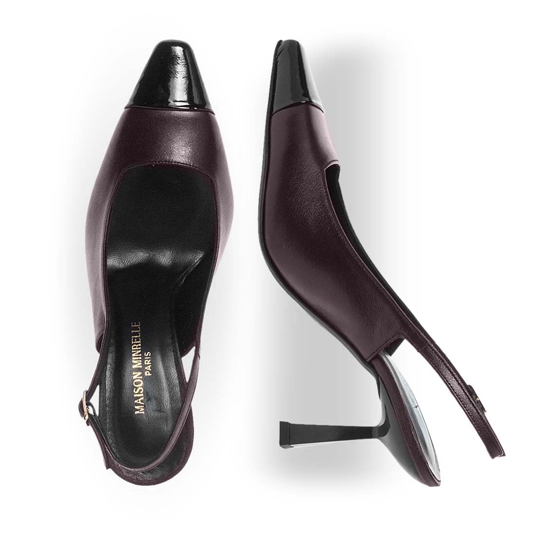 Slingback black pumps by Maison Minrelle. Stiletto heel. Modern design. A chic pair to style with your office outfits. Buckle strap fastening.