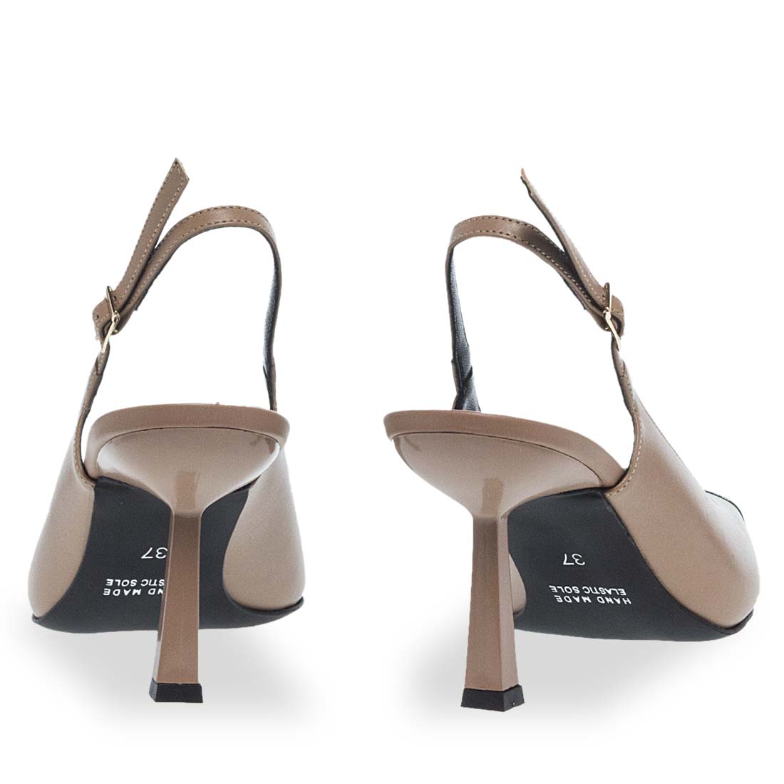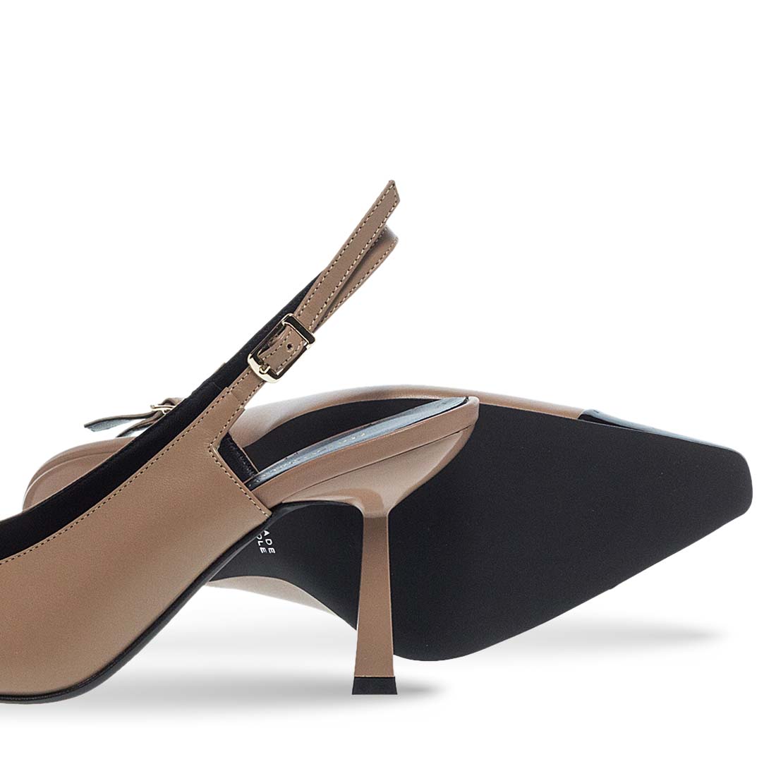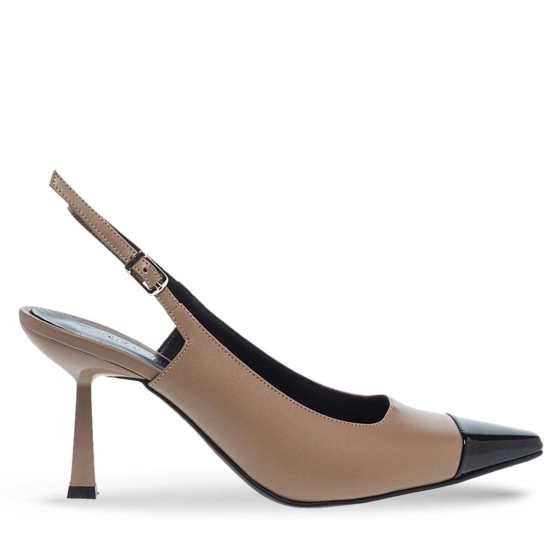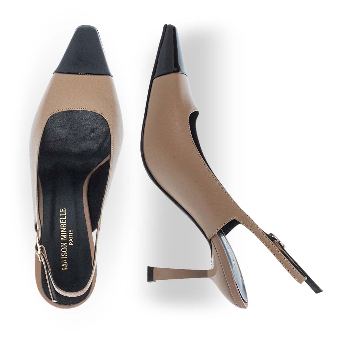 Slingback black pumps by Maison Minrelle. Stiletto heel. Modern design. A chic pair to style with your office outfits. Buckle strap fastening.