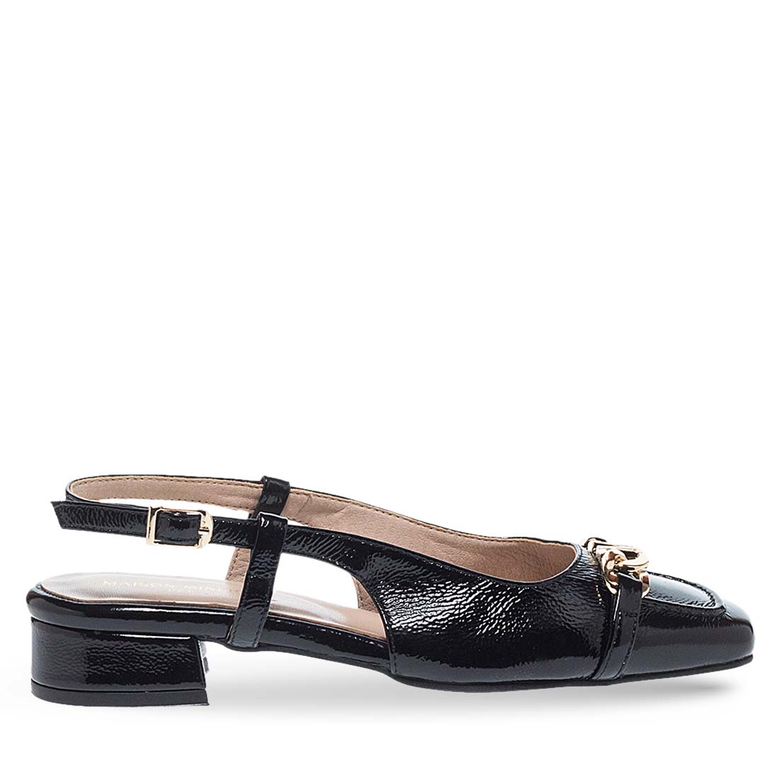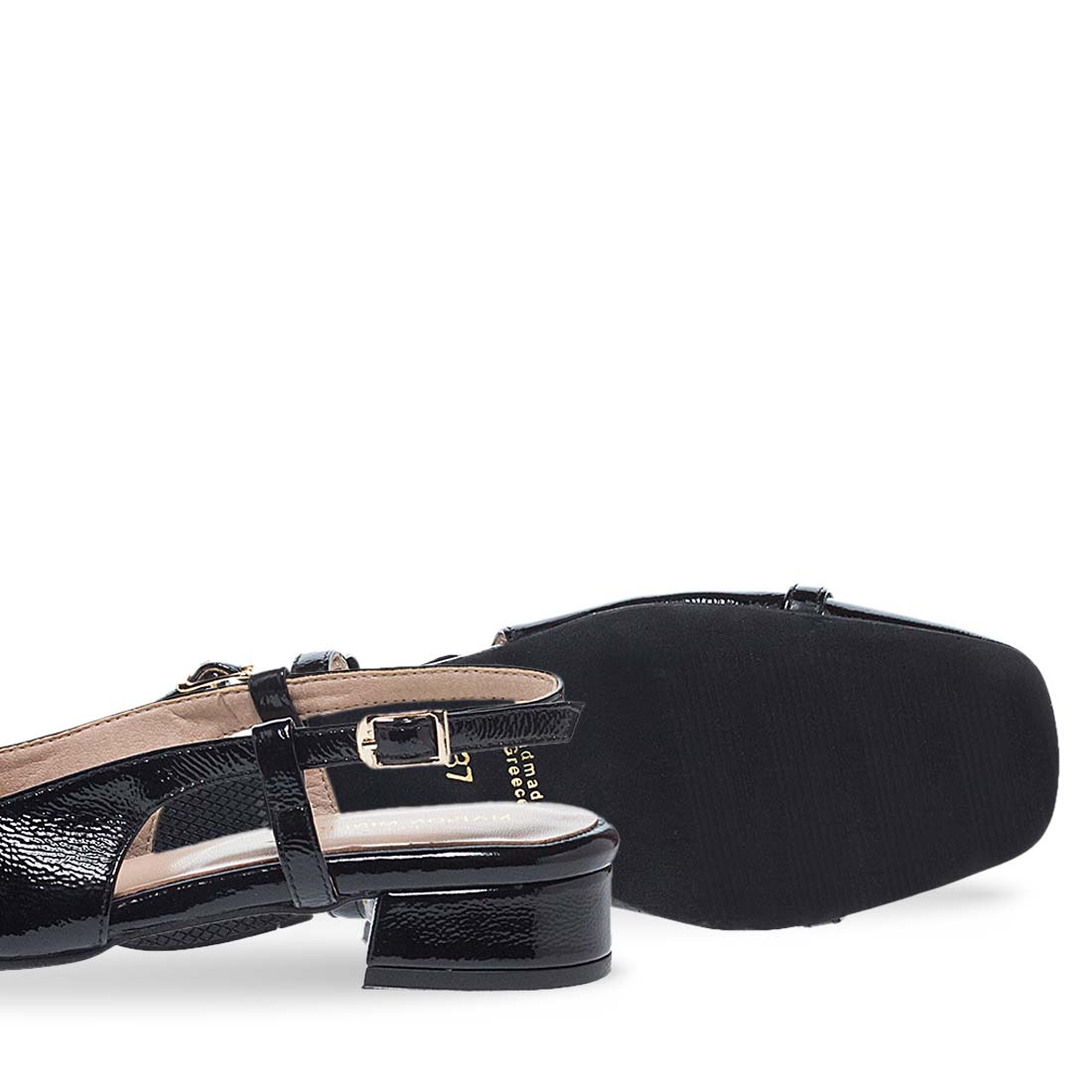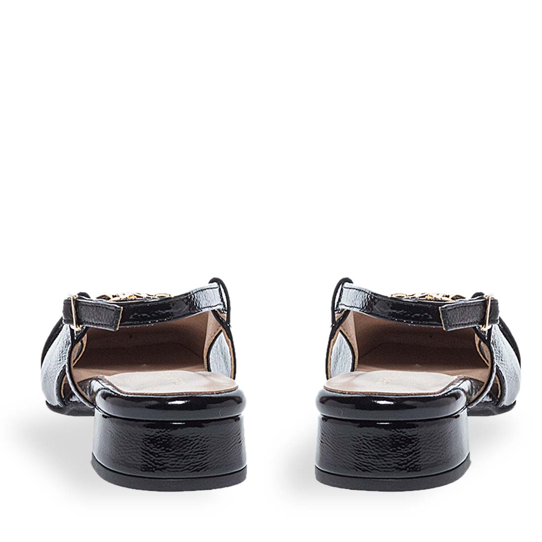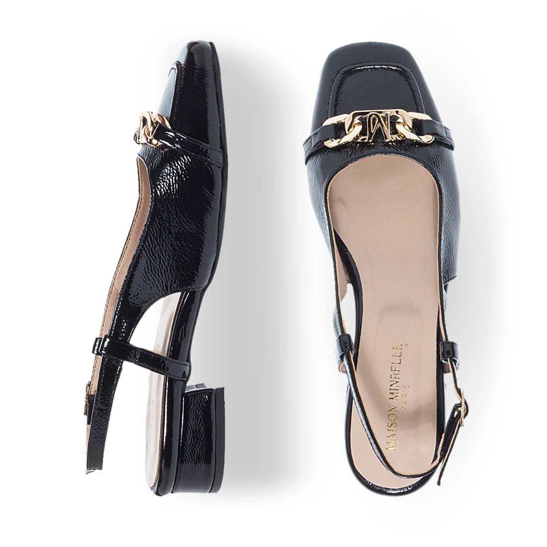 Elegant leather pumps by Maison Minrelle with low block heel. Modern design. A chic pair to style with your office outfits. Buckle strap fastening. Refresh your style with these modern pumps.